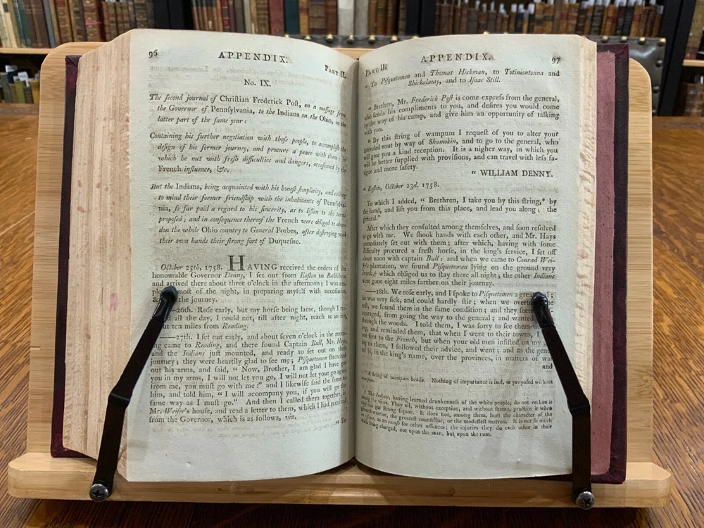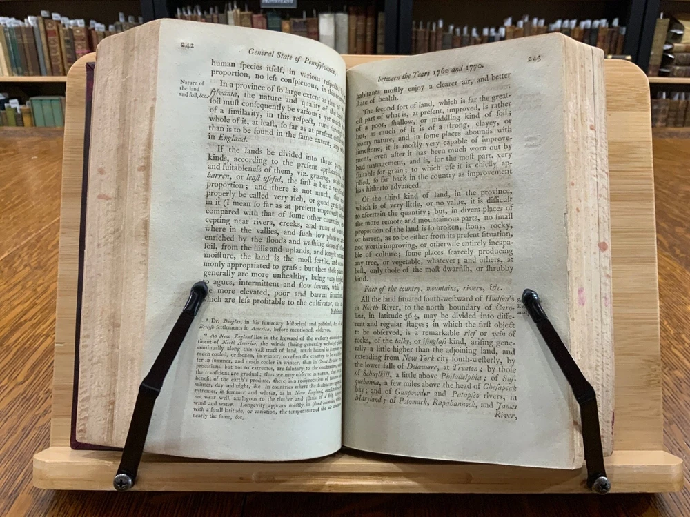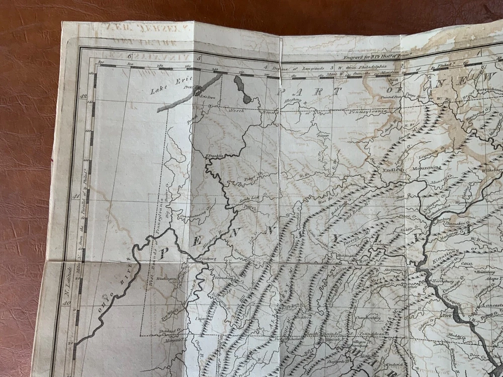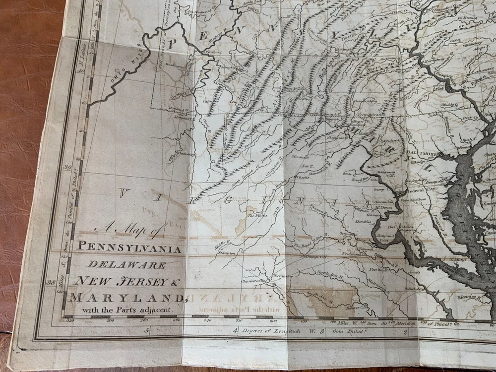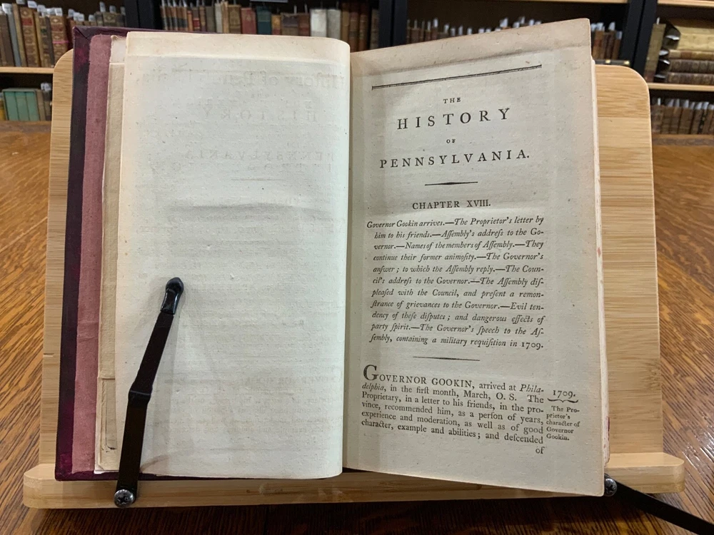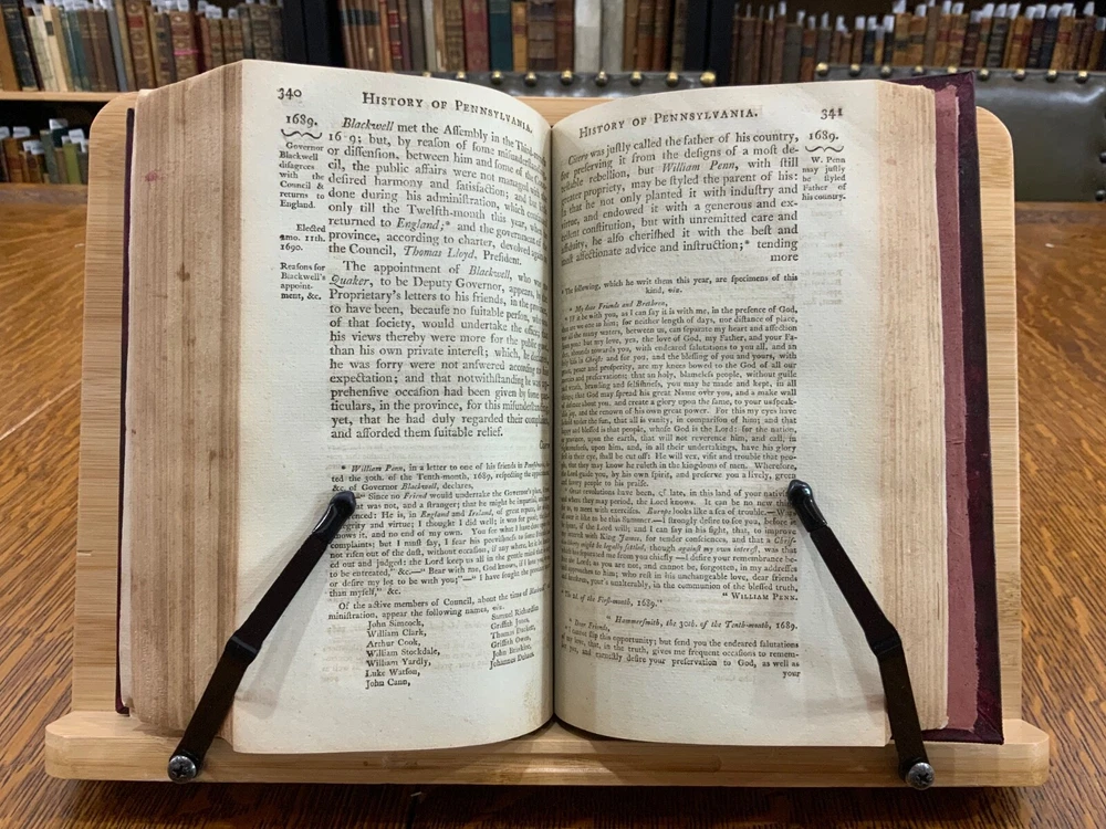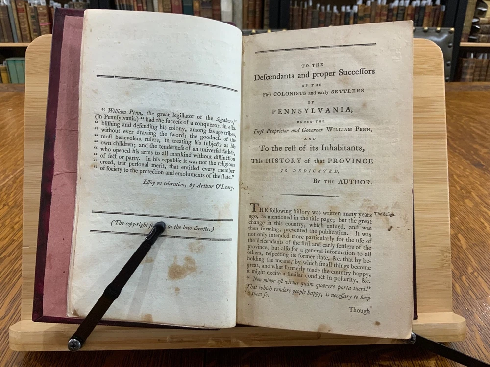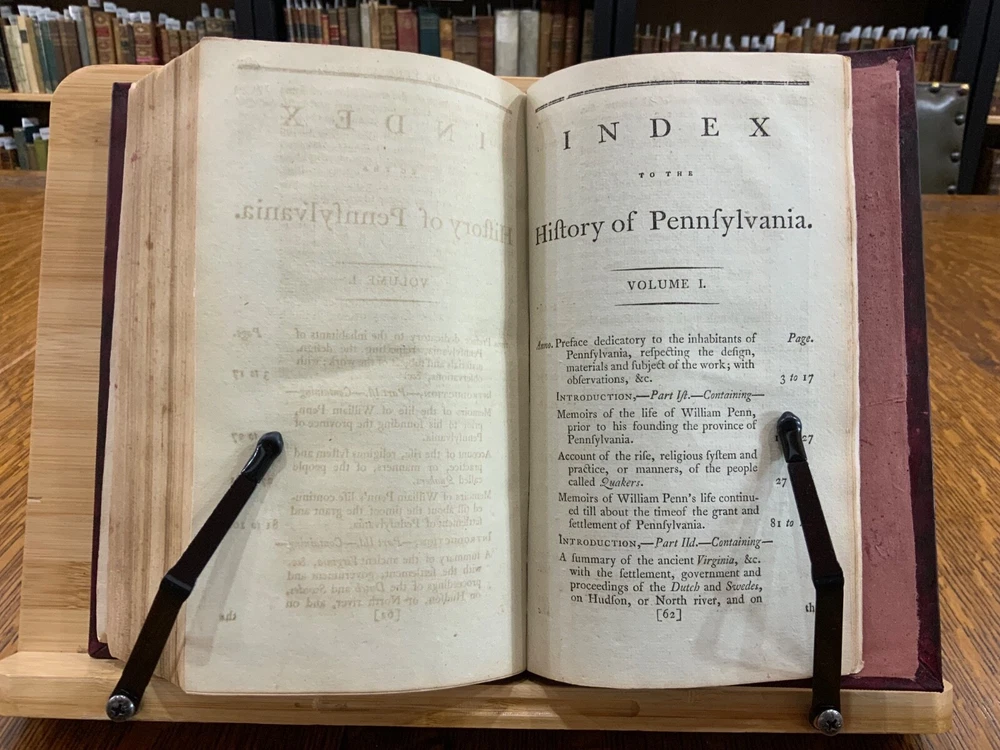 The History of Pennsylvania, in North America from the Original Institution and Settlement of that Province, under the fist Proprietor and Governor William Penn, in 1681 till after the Year 1742; with an Introduction, Respecting, The Life of W. Penn, Prior to the grant of The Province and the religious Society of the People called Quakers; with the first rise of the neighbouring Colonies, more particularly of West-New-Jersey, and the Settlement of the Dutch and Swedes on Delaware. To which is added a brief Description the Said Province and of the General State in which it flourished principally between the years 1760 and 1770. The whole including a variety of things, useful and Interesting to be known, respecting that country in early time, &c. With an Appendix. Written principally between the Years 1776 and 1780 by Robert Proud. Philadelphia: Printed and Sold by Zachariah Paulson, Junior, Vol. I: Frontispiece of William Penn, 1797, 508 p; Vol. II: Fold-out map of Pennsylvania, 1798, 373 p + 149 p Appendices. FIRST EDITION, COMPLETE SET! Full leather contemporary bindings measure 8.25 x 5", 8vo. In fair condition. Modern binding very lightly scuffed at edges and corners, but otherwise clean and intact. Previous old-hand ownership signature, in ink, found on recto of frontispiece dated 1799. Title page of Vol. I loosening at tail of gutter. Off-setting on title page of Vol. I from frontispiece. Fold-out map in Vol. II normally toned & soiled at hinges with some tearing near attachment point to text-block. Text-block normally toned with age-staining in preliminaries. Contemporary bindings tight and intact. Please see photos and ask questions, if any, before purchasing. Robert Proud (1728–1813) was an English educator, Quaker and historian known for his research and writing about the Province of Pennsylvania (also known as the Pennsylvania Colony). Dubbed "Pennsylvania's first historian", Proud was a Loyalist during the American Revolution, and completed much of his writing while living in poverty. Shortly after arriving in the Province of Pennsylvania (also known as the Pennsylvania Colony), he settled in Philadelphia , where he launched a private school for boys dedicated to the instruction of Latin. When that school failed two years later, he was hired to teach at The Friends School in September 1761. Also known as The Friends Academy, The Public School or the Penn Charter School, it is known today as the Friends Select School. He ultimately rose to the level of master teacher. He was elected to the revived American Philosophical Society in 1768. First Edition, Complete Set. RAREA1797ORSA - 03/19 RAREA1797ROQB - 05/25 - HKREV840
