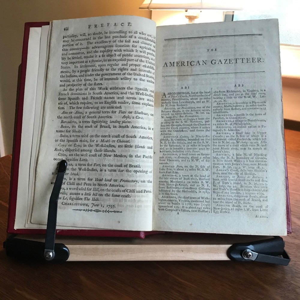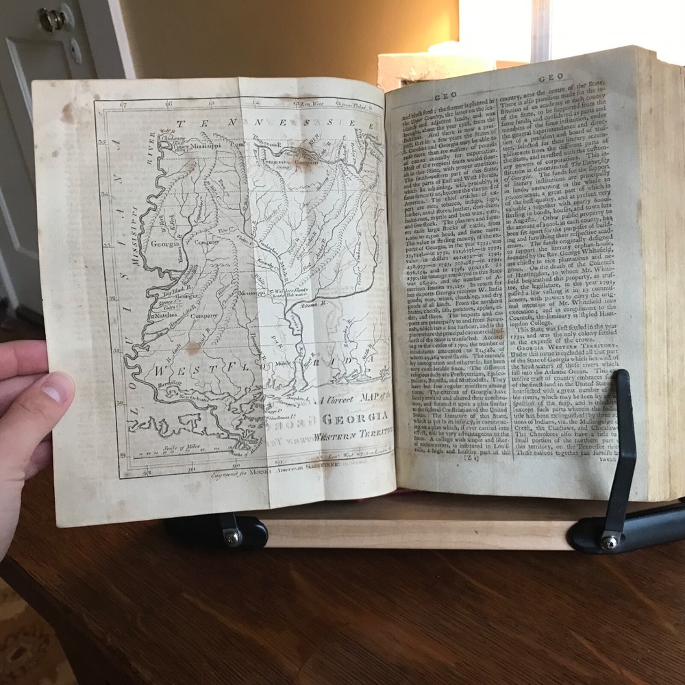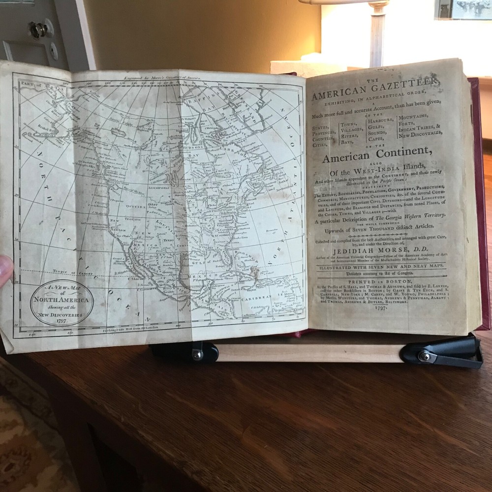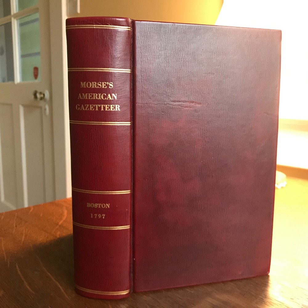 The American Gazetteer, Exhibiting, in Alphabetical Order, A Much more full and accurate Account, that has been given of the States, Towns, Harbours, Mountains, Provinces, Villages, Gulfs, Forts, Counties, Rivers, Sounds, Cities, Bays, Capes, Indian Tribes & New Discoveries on the American Continent, Also Of West-India Islands by Jedidiah Morse, D.D., Illustrated with Seven New and Neat Maps, Published according to Act of Congress, Printed in Boston at the Presses of S. Hall, and Thomas & Andrews, folding frontis map with six additional in-text maps, complete, unpaginated, modern leather binding, 9 x 5.5”, 8vo. In good condition. Light wear to extremities with minor scuffing to contemporary binding. Sturdy and clean binding with fresh end papers. Folding maps are all nicely preserved and easy to unfold. Minor tears to some, light toning. Minor toning throughout with instances of light foxing. Rear end papers have antiquarian doodles of people’s heads and military men. Binding tight and intact. A solid and sturdy copy. Please see photos. First edition of Morse’s ambitious work. The maps depict the southern U.S., the northern U.S., South America, North America, the “Georgia Western Territory,” the West Indies, and the “New Discoveries East of New Holland and New Guinea.” A useful and monumentally important geographical compendium. Rare. RAREA1797OTUR