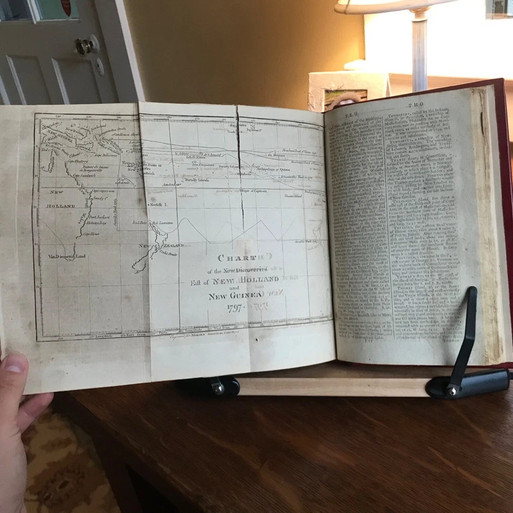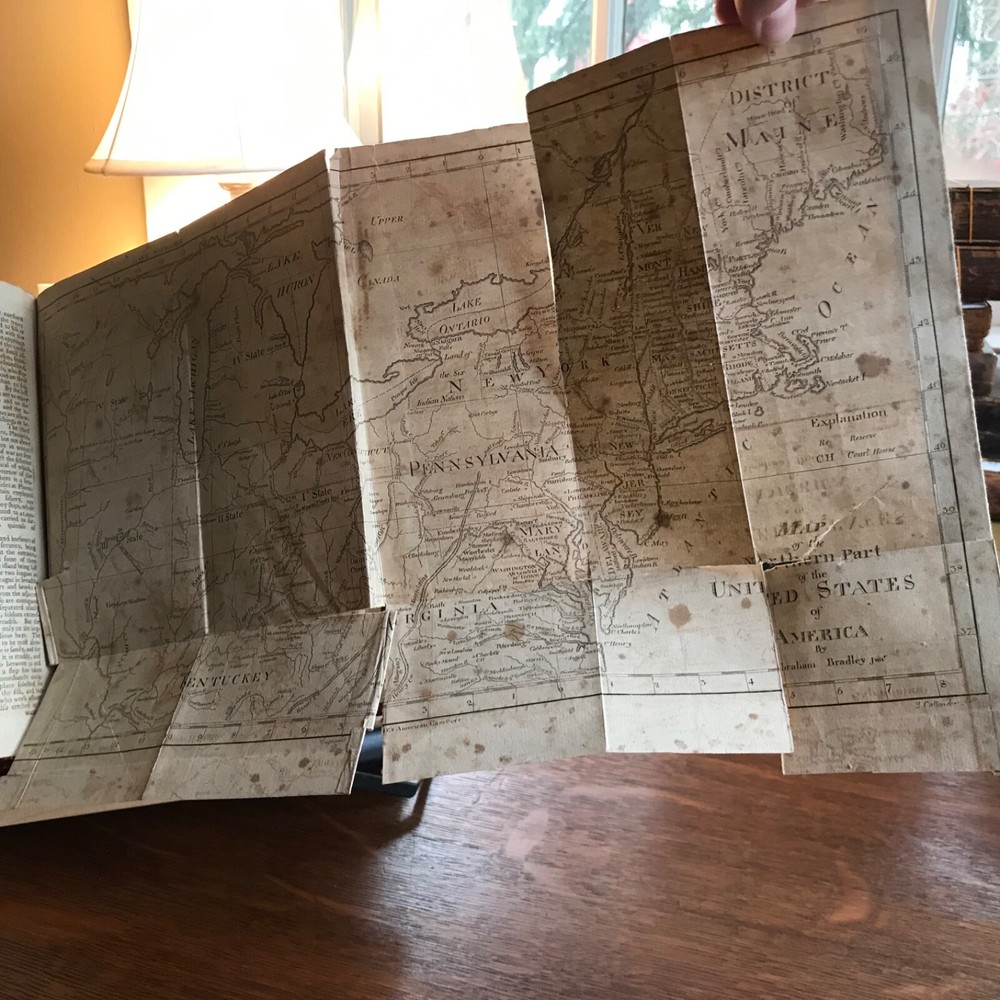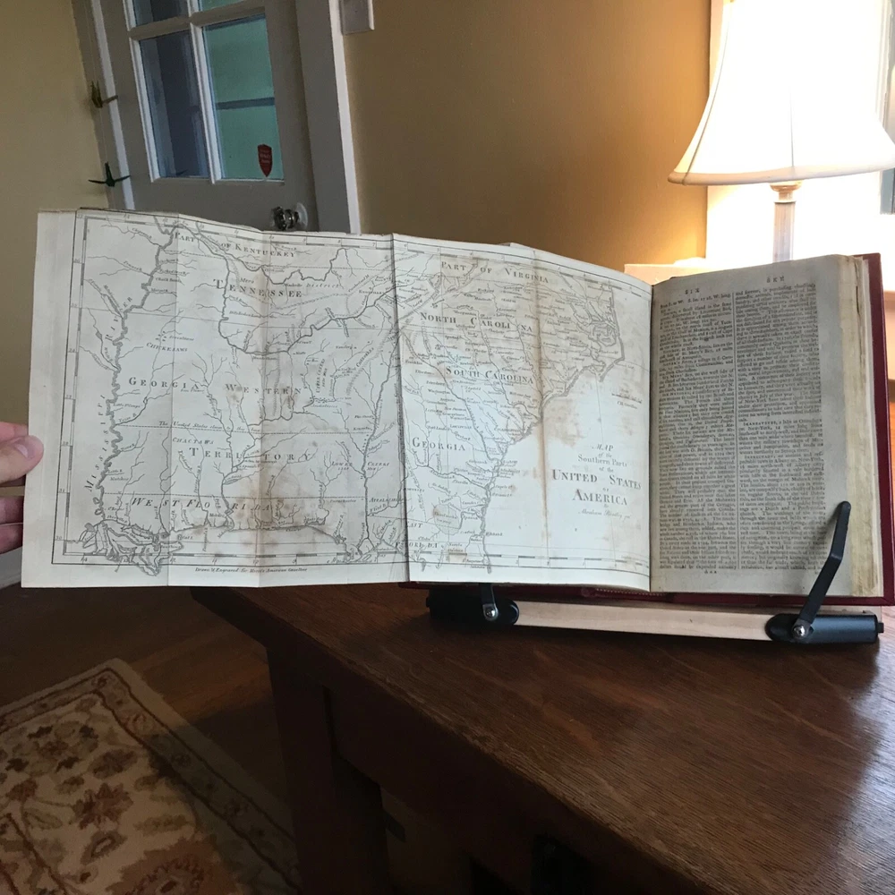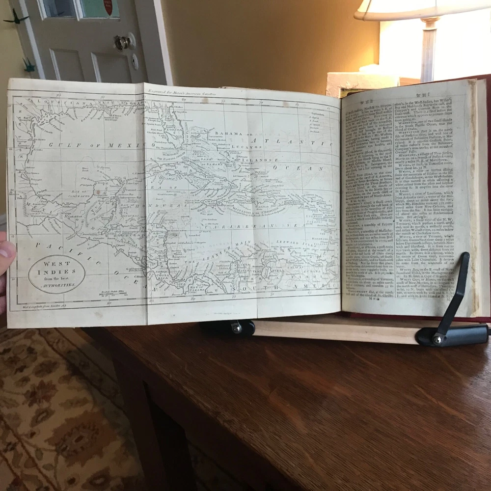 The American Gazetteer, Exhibiting, in Alphabetical Order, A Much more full and accurate Account, that has been given of the States, Towns, Harbours, Mountains, Provinces, Villages, Gulfs, Forts, Counties, Rivers, Sounds, Cities, Bays, Capes, Indian Tribes & New Discoveries on the American Continent, Also Of West-India Islands by Jedidiah Morse, D.D., Illustrated with Seven New and Neat Maps, Published according to Act of Congress, Printed in Boston at the Presses of S. Hall, and Thomas & Andrews, folding frontis map with six additional in-text maps, complete, unpaginated, modern leather binding, 9 x 5.5”, 8vo. In good condition. Light wear to extremities with minor scuffing to contemporary binding. Sturdy and clean binding with fresh end papers. Folding maps are all nicely preserved and easy to unfold. Minor tears to some, light toning. Minor toning throughout with instances of light foxing. Rear end papers have antiquarian doodles of people’s heads and military men. Binding tight and intact. A solid and sturdy copy. Please see photos. First edition of Morse’s ambitious work. The maps depict the southern U.S., the northern U.S., South America, North America, the “Georgia Western Territory,” the West Indies, and the “New Discoveries East of New Holland and New Guinea.” A useful and monumentally important geographical compendium. Rare. RAREA1797OTUR