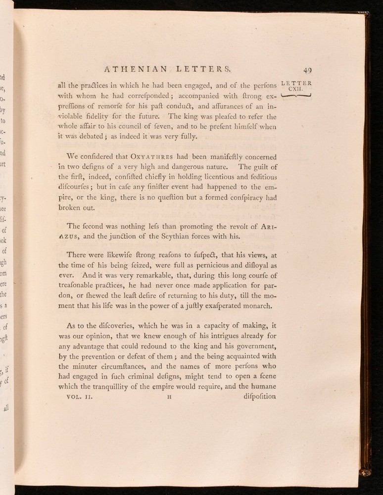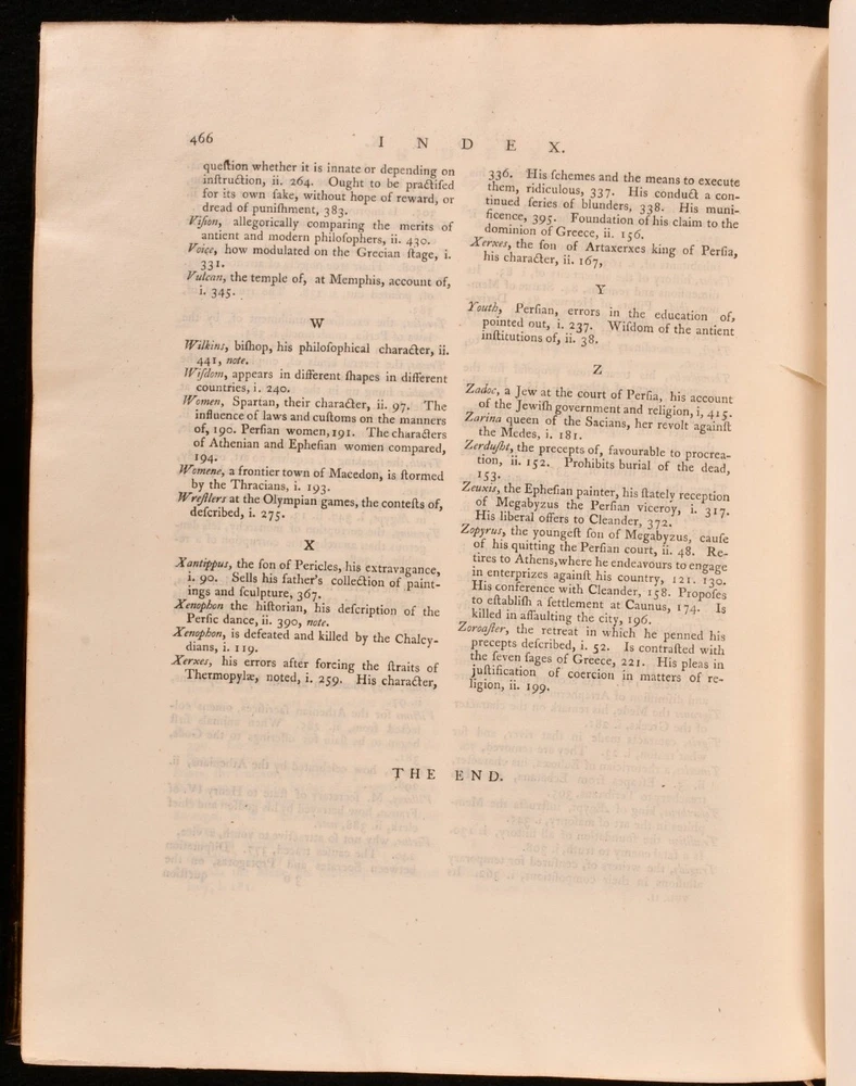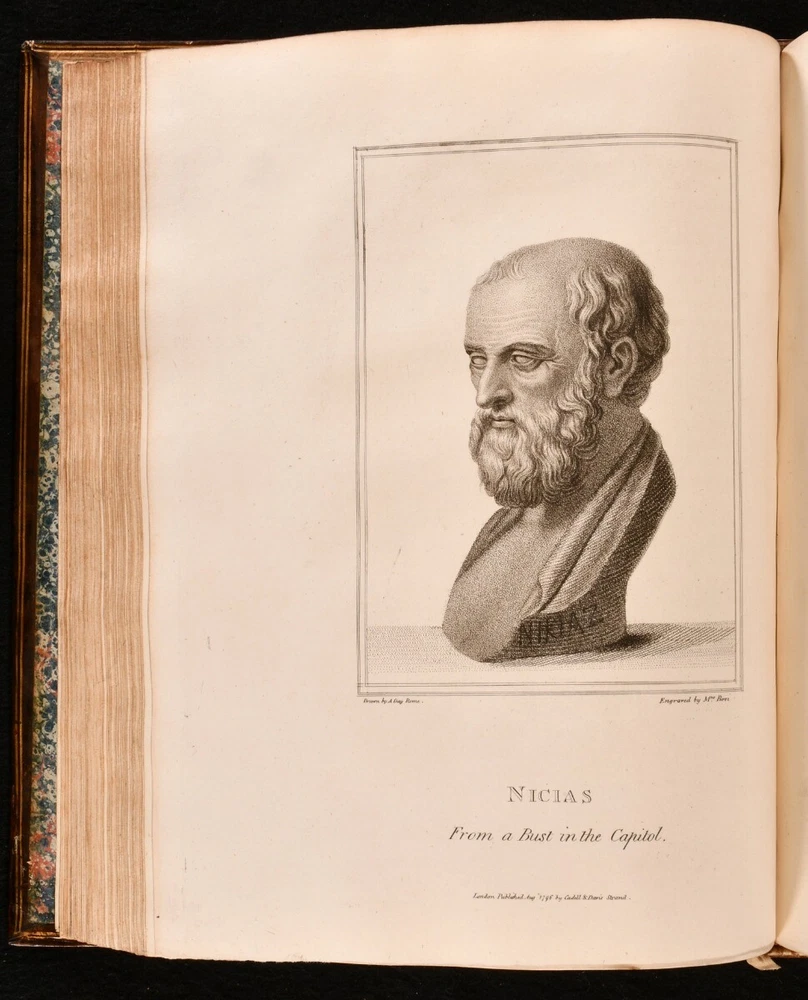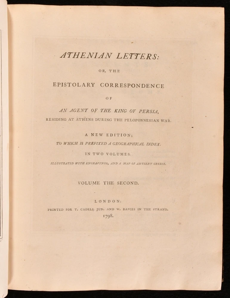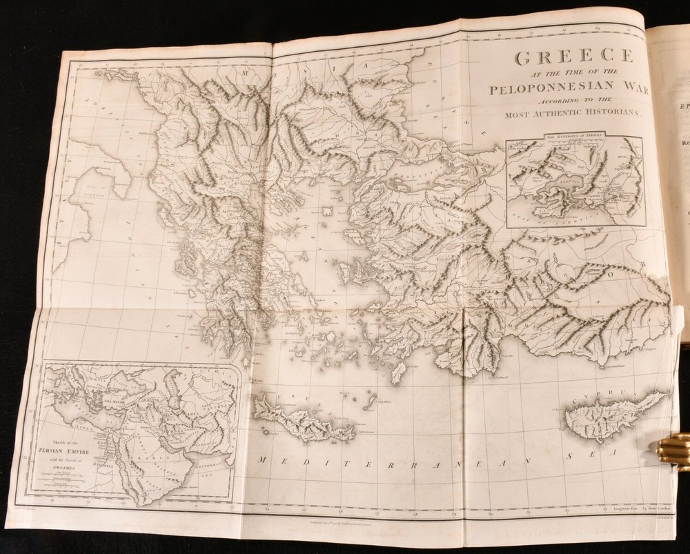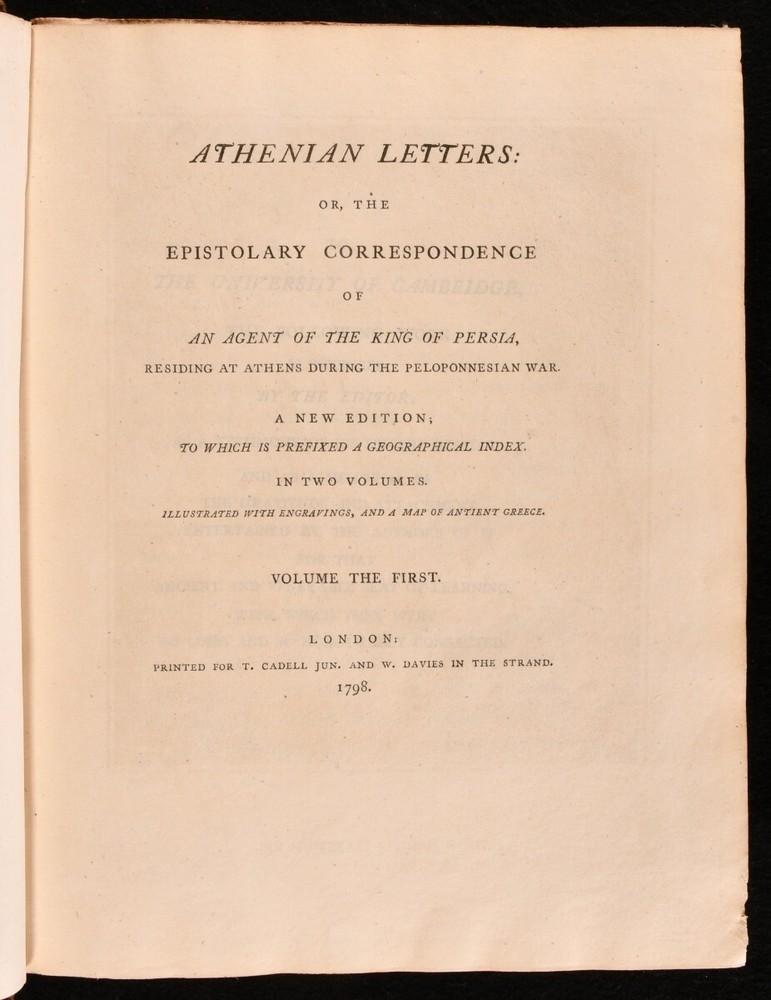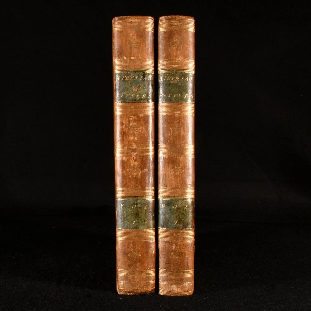 Click here to see our other books! Athenian Letters: Or, The Epistolary Correspondence of An Agent of the King of Persia, Residing at Athens During the Peloponnesian War Philip Yorke; Charles Yorke et al. 1798 T. Cadell Jun. And W. Davies : London 11.5" by 9.5" lxii [3], 2-436; 466pp SUMMARY The first illustrated edition of this epistolary work consisting of fictional letters purportedly written during the Peloponnesian War. Folding Maps,Illustrated,Leather Binding Overall Condition: Very Good This book weighs 5 KG when packed UK Postage: £ 4.49 US Postage: £ 42.99 EU Postage : £ 27.99 European Postage: £ 45.99 Asia Postage: £ 74.99 Worldwide Postage: £ 129.99 DESCRIPTION A delightfully bound two volume edition of this collaboratively produced work of Ancient Greek history and geography, first published in 1741 by a circle of authors surrounding Charles and Philip Yorke, with the authorship for a long time being kept a well guarded secret. This was the first illustrated edition of the work, featuring fourteen plates of portraits, and a folding map of Greece. Collated, complete. Subtitled 'The Epistolary Correspondence of An Agent of the King of Persia Residing at Athens During the Peloponnesian War', this work takes the form of a commentary in a series of letters on the Athenian historian and general, Thucydides. The Yorke brothers planned the production of this work while at university, anonymously involving Thomas Birch, Henry Coventry, John Green, Samuel Salter, Catherine Talbot, Daniel Wray, George Henry Rooke, John Heaton, John Lawry, and William Heberden. With the contemporary owner's inscription of Wm. C. Grove to a front endpaper of volume I. Retaining the original half titles. ESTC reference no. T84382 A lovely edition of this curious eighteenth century work providing a detailed yet manufactured account of the Peloponnesian war. CONDITION In full calf bindings, with gilt detailing. With volume I rebacked, and the original back strip laid down. Externally, smart. Light fading to back strips, with fading to head of volume I rear board. Rubbing to tail of volume II front board. Front joint of volume I starting, with board holding firm. Internally, firmly bound. Pages clean and bright, with only the occasional light handling mark. Overall Condition: Very Good GLOSSARY OF TERMS Overall Condition (Dustwrapper condition rating is shown after that for the book itself, where a dustwrapper is present) Fine - Very well preserved copy showing very little wear Very Good Indeed - Only one or two minor faults, really a very attractive copy Very Good - Quite a wide term meaning no major faults but probably several smaller ones often expected given the age of the book, but still a respectable copy Good - Meaning not very good. Some more serious faults as will be described in the condition report under 'condition' Good Only - Meaning one or more faults that could really do with repair Fair - As with good only above but with other faults leaving a compromised copy even after repair Poor - Really bad and possibly seriously incomplete. We only sell books in this condition where their rarity or value makes them attractive none the less. Major defects will be described. GUARANTEE We offer a full money back guarantee on our descriptions. Please ask for details and conditions. We prefer PAYPAL. If you pay via PAYPAL we will post the item off the same or the next working day with the postage you have selected. Please note we cannot accept USD cheques