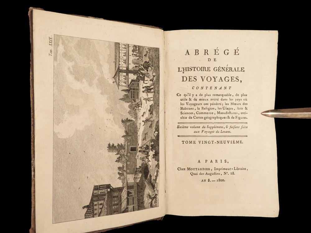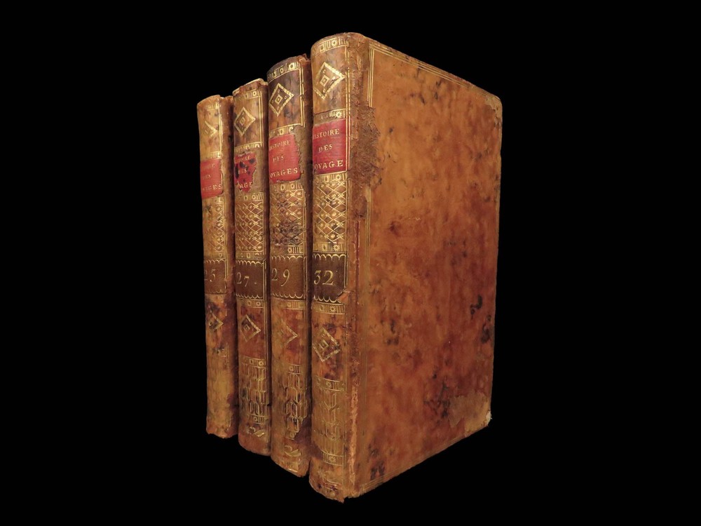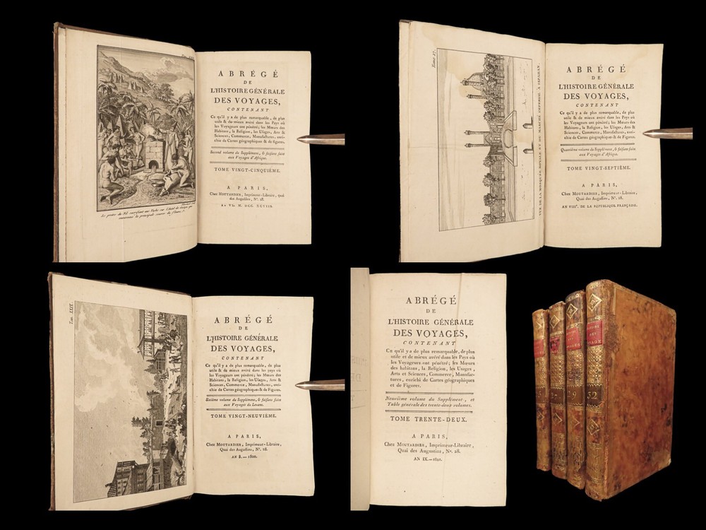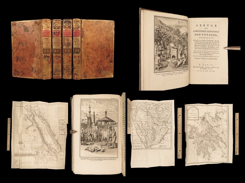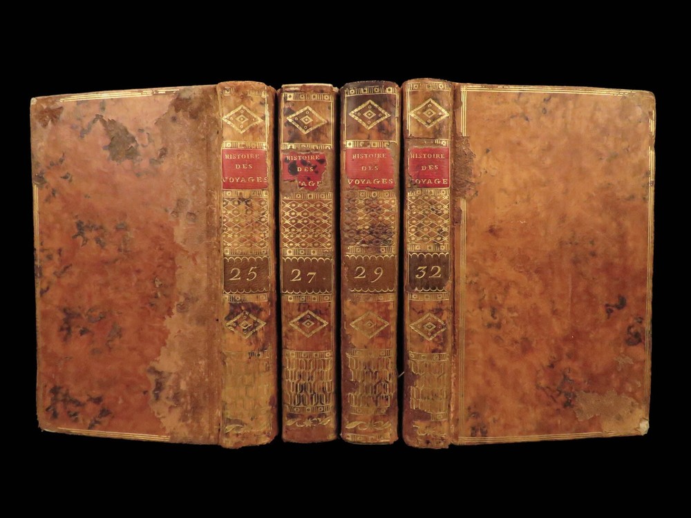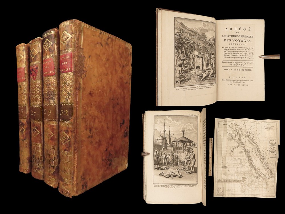 1798 VOYAGES Constantinople Arabia James Bruce Hottentots Africa Pococke MAPS The best book of its kind! A rare book La Harpe’s ‘ General History of Voyages’ ! This extensive work was begun by La Harpe, and, after the first 21 volumes, was completed by several other historians. Not only does this work describe the geography of specific voyages, but it covers the sciences, commerce, religion, and customs of people groups from Africa, Asia, Americas, and Pacific Islands. According to Sabin, La Harpe’s ‘Voyages’ is “a work that has met with greater success than any other of the same kind; the fidelity of the narration, the striking details of adventures, and the lively pictures of manners, etc., it presents, will always give it a peculiar and lasting merit. Contains all the early voyages of America. ” This lot includes volumes from the supplemental volumes. Notable contents found in these tomes including: · James Bruce voyages in Nubia, Abyssinia, Egypt · William Paterson voyages in South Africa o Hottentots · Middle East voyages: o Chardin in Constantinople o Georgia o Armenia o Persia · Voyages of Tournefort and Pockocke to Constantinople, Armenia, Georgia · Voyages of Tocat & d’Angora · Ancient and Modern Constantinople – extensive descriptions Item number: #25589 Price: $599 La HARPE, Jean-François Abrégé de l'histoire générale des voyages. A Paris : Hôtel de Thou, 1798-1801. Details : · Collation: Complete with all pages; 4 volumes o Vol. 25 – [4], 471, [1] § 1 folding map § 2 engravings o Vol. 27 – [4], 527, [1] § 1 folding map § 1 engraving o Vol. 29 – [2], 583, [1] § 1 folding map § 1 engraving o Vol. 32 – vi, 420 · References: Brunet III, 771; Sabin 38632 · Language: French · Binding: Leather; tight and secure · Size : ~8in X 5.25in (20cm x 13cm) Our Guarantee: Very Fast. Very Safe. Free Shipping Worldwide. Customer satisfaction is our priority! Notify us with 7 days of receiving, and we will offer a full refund without reservation! 25589