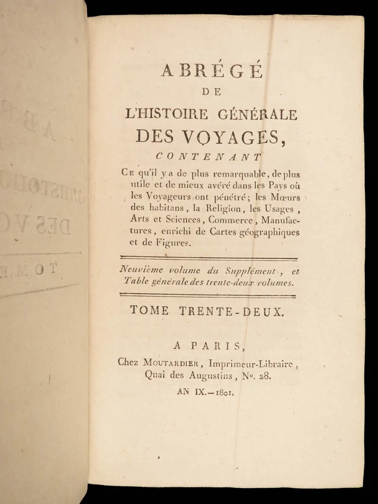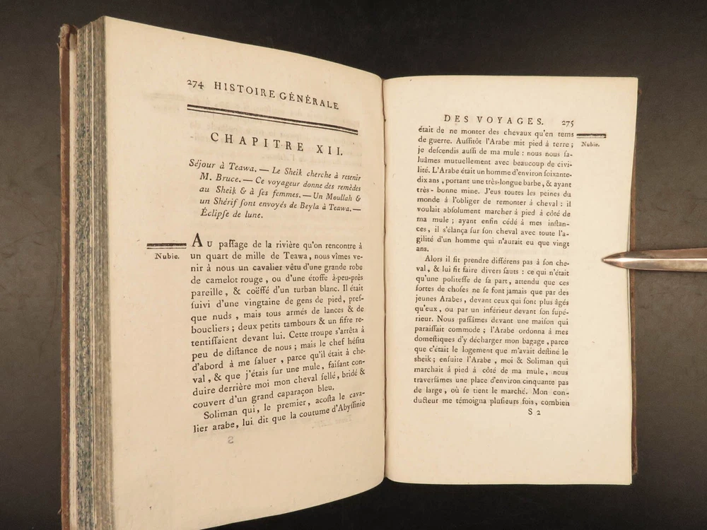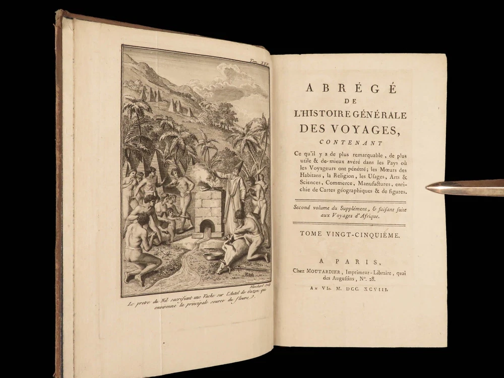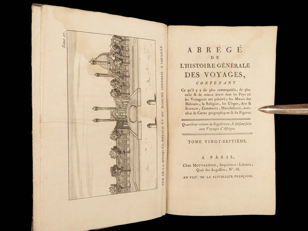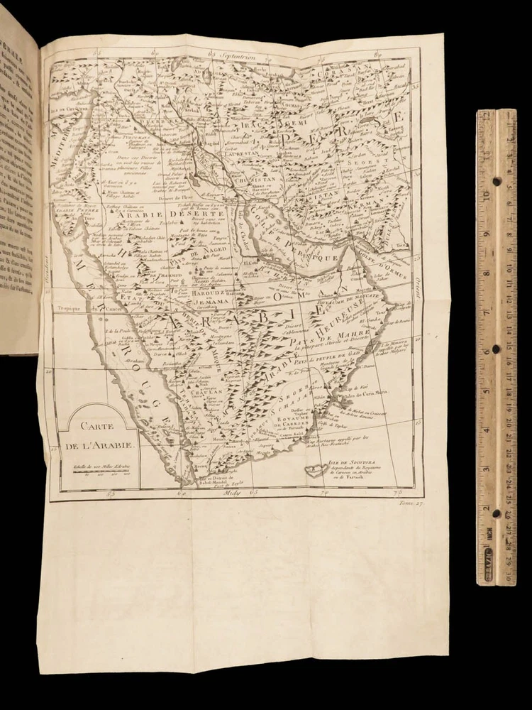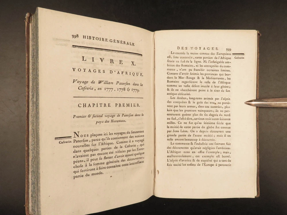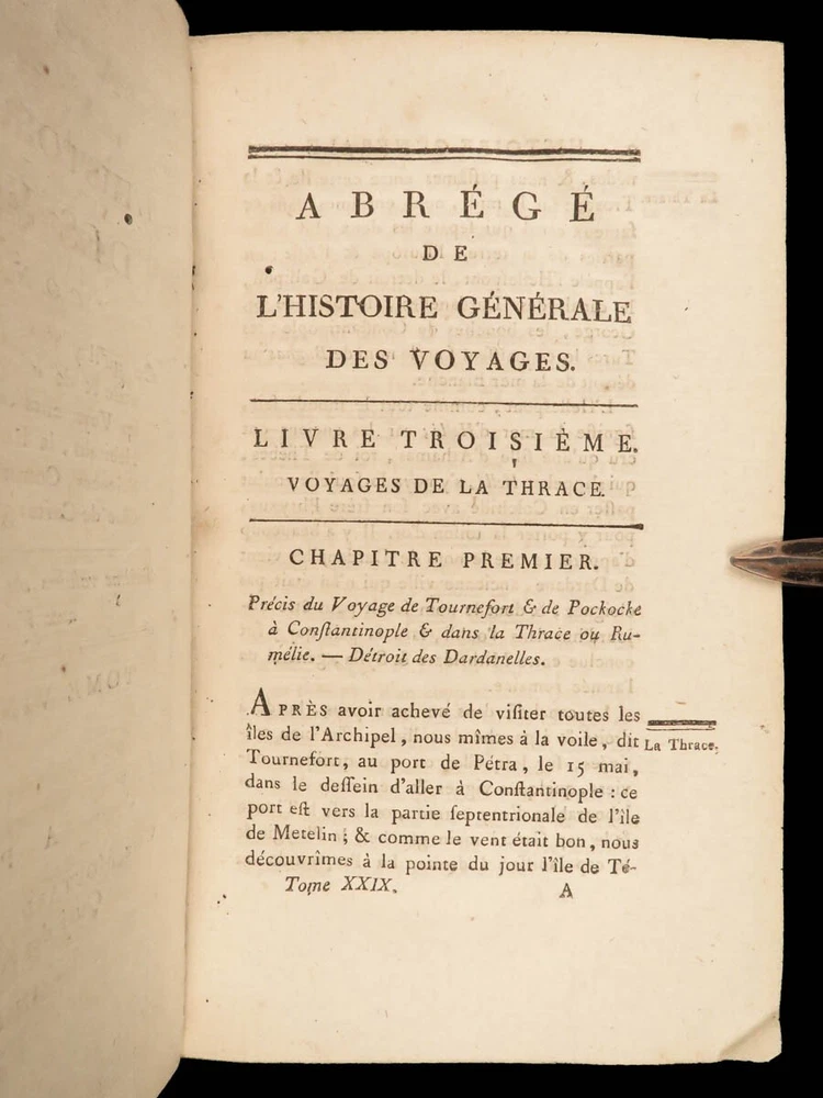 1798 VOYAGES Constantinople Arabia James Bruce Hottentots Africa Pococke MAPS The best book of its kind! A rare book La Harpe’s ‘ General History of Voyages’ ! This extensive work was begun by La Harpe, and, after the first 21 volumes, was completed by several other historians. Not only does this work describe the geography of specific voyages, but it covers the sciences, commerce, religion, and customs of people groups from Africa, Asia, Americas, and Pacific Islands. According to Sabin, La Harpe’s ‘Voyages’ is “a work that has met with greater success than any other of the same kind; the fidelity of the narration, the striking details of adventures, and the lively pictures of manners, etc., it presents, will always give it a peculiar and lasting merit. Contains all the early voyages of America. ” This lot includes volumes from the supplemental volumes. Notable contents found in these tomes including: · James Bruce voyages in Nubia, Abyssinia, Egypt · William Paterson voyages in South Africa o Hottentots · Middle East voyages: o Chardin in Constantinople o Georgia o Armenia o Persia · Voyages of Tournefort and Pockocke to Constantinople, Armenia, Georgia · Voyages of Tocat & d’Angora · Ancient and Modern Constantinople – extensive descriptions Item number: #25589 Price: $599 La HARPE, Jean-François Abrégé de l'histoire générale des voyages. A Paris : Hôtel de Thou, 1798-1801. Details : · Collation: Complete with all pages; 4 volumes o Vol. 25 – [4], 471, [1] § 1 folding map § 2 engravings o Vol. 27 – [4], 527, [1] § 1 folding map § 1 engraving o Vol. 29 – [2], 583, [1] § 1 folding map § 1 engraving o Vol. 32 – vi, 420 · References: Brunet III, 771; Sabin 38632 · Language: French · Binding: Leather; tight and secure · Size : ~8in X 5.25in (20cm x 13cm) Our Guarantee: Very Fast. Very Safe. Free Shipping Worldwide. Customer satisfaction is our priority! Notify us with 7 days of receiving, and we will offer a full refund without reservation! 25589