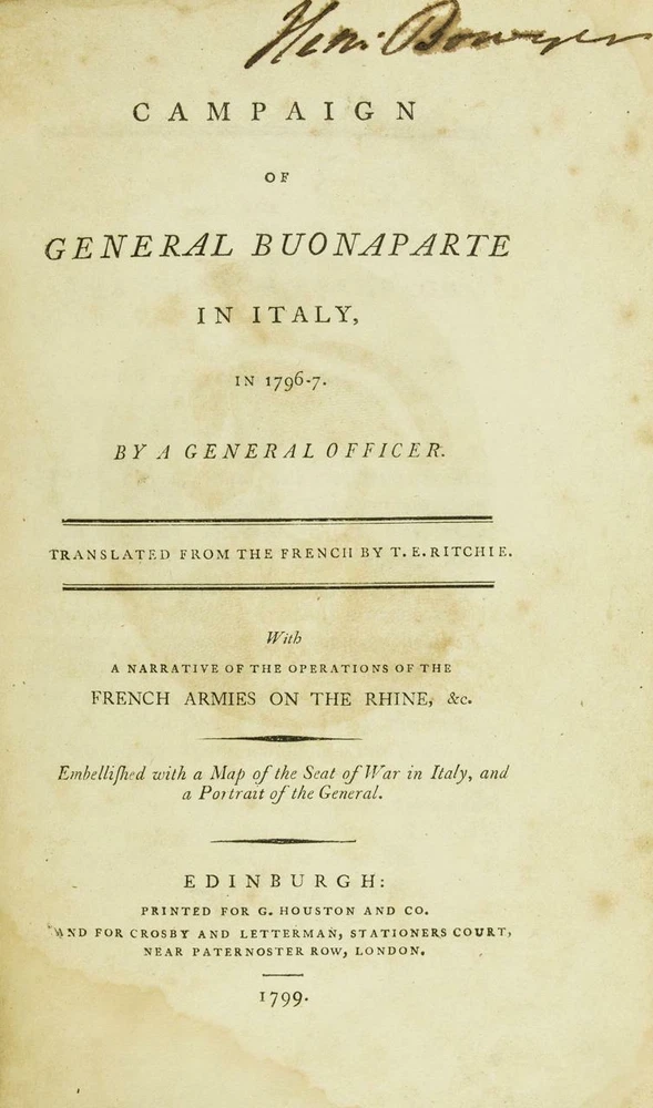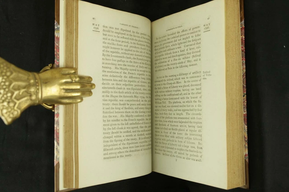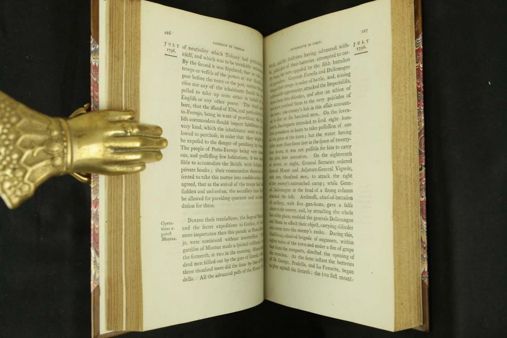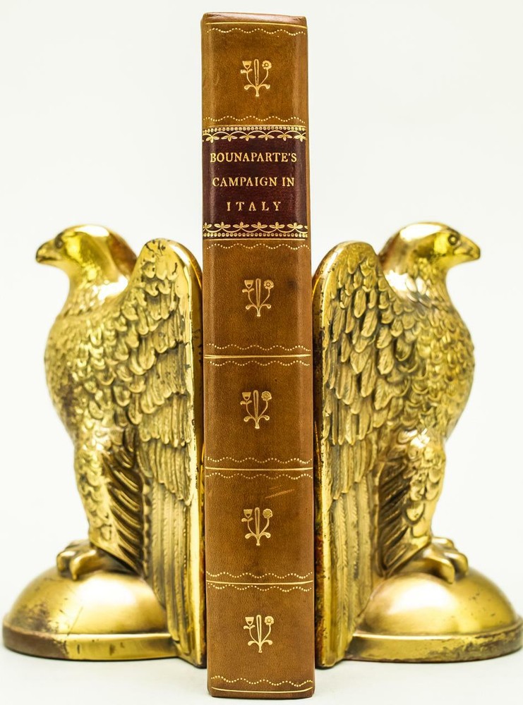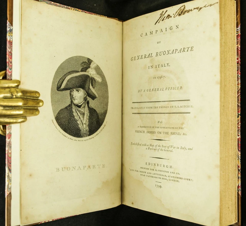 BOOK IS IN NEAR FINE CONDITION BEAUTIFULLY REBOUND IN 3/4 LEATHER WITH MARBLED BOARDS, SIX COMPARTMENTS TO SPINE WITH BRIGHT GILT DETAILS AND TITLE. BINDING AND HINGES ARE VERY GOOD, NEW END PAPERS AND PASTE DOWNS. NO LOOSE OR MISSING PAGES, PAGES ARE BRIGHT AND CLEAN, WITHOUT MARKS EXCEPT FOR PREVIOUS OWNER NAME TO TITLE PAGE. FOXING ISOLATED TO FIRST FEW LEAVES. BOOK MEASURES 8.5"x5.5". FIRST EDITION, 223 YEARS OLD. A NICE EXAMPLE. 1799 Campaign of General Buonaparte in Italy Large Map Leather First Edition 1799 Campaign of General Buonaparte in Italy Large Map Leather First Edition Description BOOK IS IN NEAR FINE CONDITION BEAUTIFULLY REBOUND IN 3/4 LEATHER WITH MARBLED BOARDS, SIX COMPARTMENTS TO SPINE WITH BRIGHT GILT DETAILS AND TITLE. BINDING AND HINGES ARE VERY GOOD, NEW END PAPERS AND PASTE DOWNS. NO LOOSE OR MISSING PAGES, PAGES ARE BRIGHT AND CLEAN, WITHOUT MARKS EXCEPT FOR PREVIOUS OWNER NAME TO TITLE PAGE. FOXING ISOLATED TO FIRST FEW LEAVES. BOOK MEASURES 8.5"x5.5". FIRST EDITION, 223 YEARS OLD. A NICE EXAMPLE. !!!CLICK HERE!!! Visit My eBay Store TO SEE ALL THE BOOKS WE HAVE FOR SALE!!! IF YOU LIKE WHAT YOU SEE THAN SAVE US TO YOUR FAVORITES BY CLICKING HERE. Add me to your Favorite Sellers RARE ANTIQUARIAN BOOKS CAN BE FRAGILE AND NEED TO BE HANDLED WITH CARE. About us: Reagan's Rare Books is a purveyor of Antiquarian books primarily from the 18th and 19th centuries. We love antique books! We search all over the country for the finest rare books, looking for those with beautiful bindings and in great condition so that we can offer you, the customer, a truly rare one of a kind collectible. Paypal Preferred. Please make payment arrangements within 48 hours of winning your auction. We reserve the right to re-list items not paid within 5 days. Shipping *To Insure That Your Package arrives without any Problems , Please Double Check to Make Sure That The Address You Have Selected in eBay Is Correct. All books are carefully bubble wrapped and packed in a box with adequate packing peanuts to prevent any damage during shipment. All books are shipped with delivery confirmation and tracking. Books over $75.00 are automatically insured. RETURNS 100% Satisfaction Guaranteed. Returns accepted for any reason within 30 days of receipt. PLEASE CHECK MY OTHER LISTINGS. POSTING NEW RARE BOOKS DAILY/WEEKLY. Pictures sell! Auctiva offers Free Image Hosting and Editing. 300+ Listing Templates! Auctiva gets you noticed! The complete eBay Selling Solution. Track Page Views With Auctiva's FREE Counter