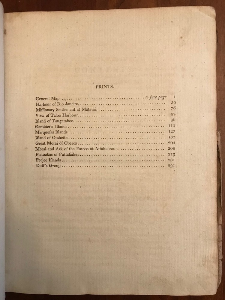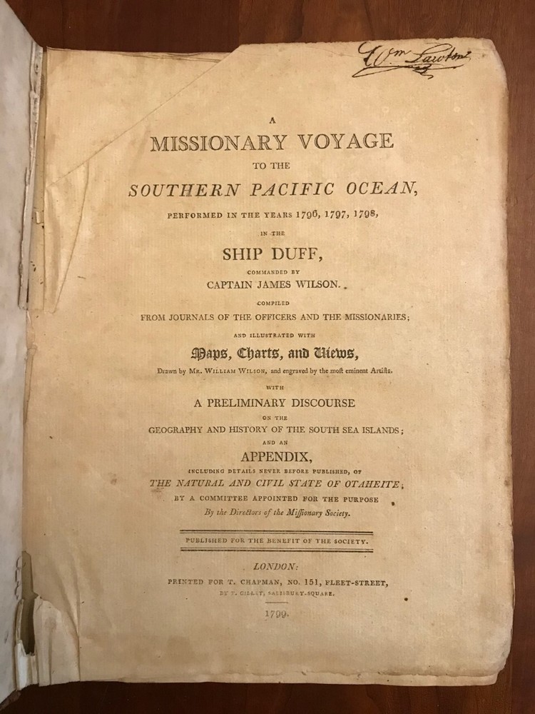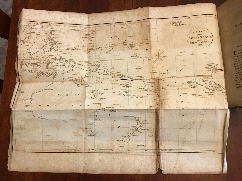 A Missionary Voyage To The Southern Pacific Ocean, Performed in the Years 1796,1797,1798 In The Ship Duff Commanded by Captain James Wilson. Compiled From The Journals of The Officers and The Missionaries By James Wilson Published: Printed by S. Gosnell, for T. Chapman, No.151, Fleet Street,, London, 1799. First edition. Complete with 7 maps (of which 5 are folding) and 6 plates. Hardcover in original leather binding. Front board crudely attached by binding thread and rear board is detached. A candidate for a professional repair to the binding. The first map as some tears, mainly along the fold lines. Foxing and age toning. I've done my best to describe the book, but if you have additional questions, please don't hesitate to send me an e-mail.