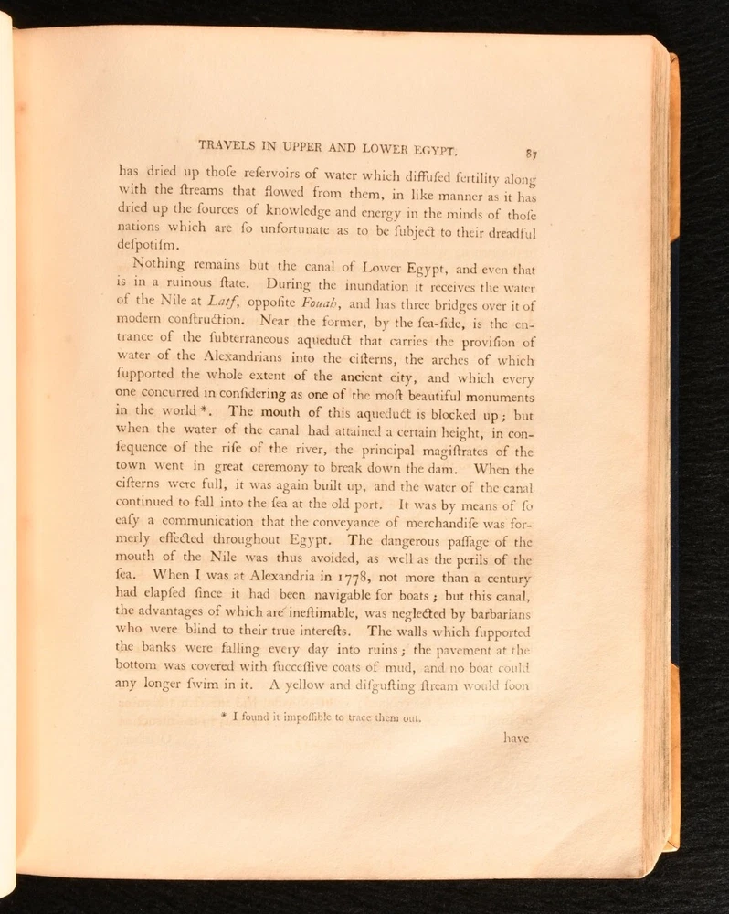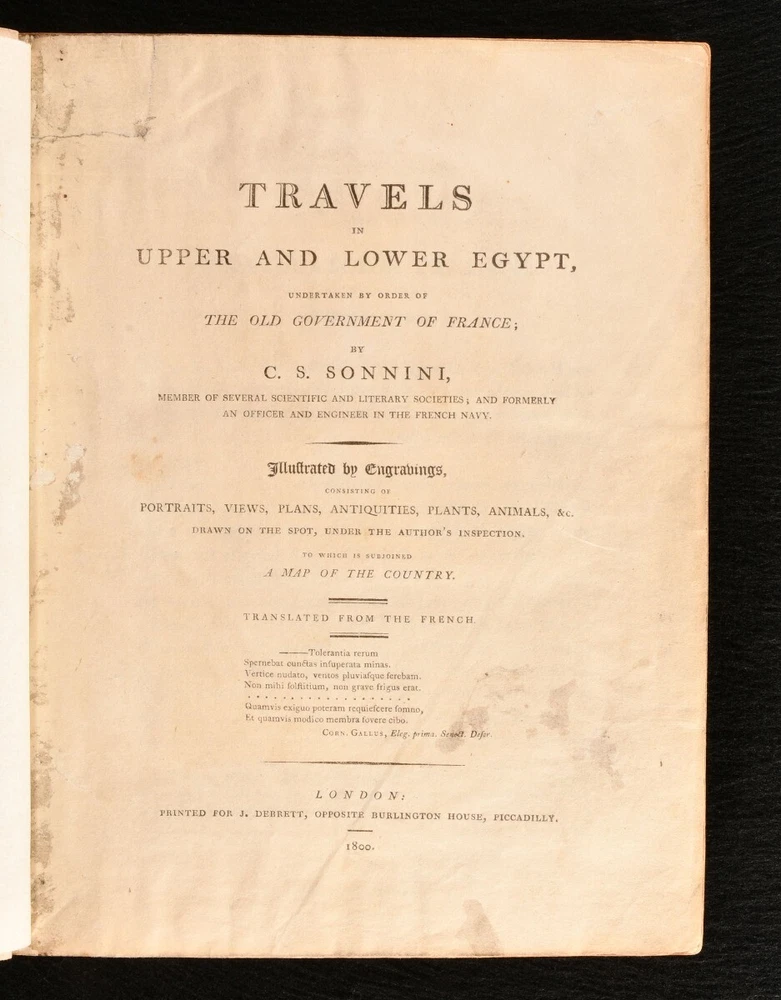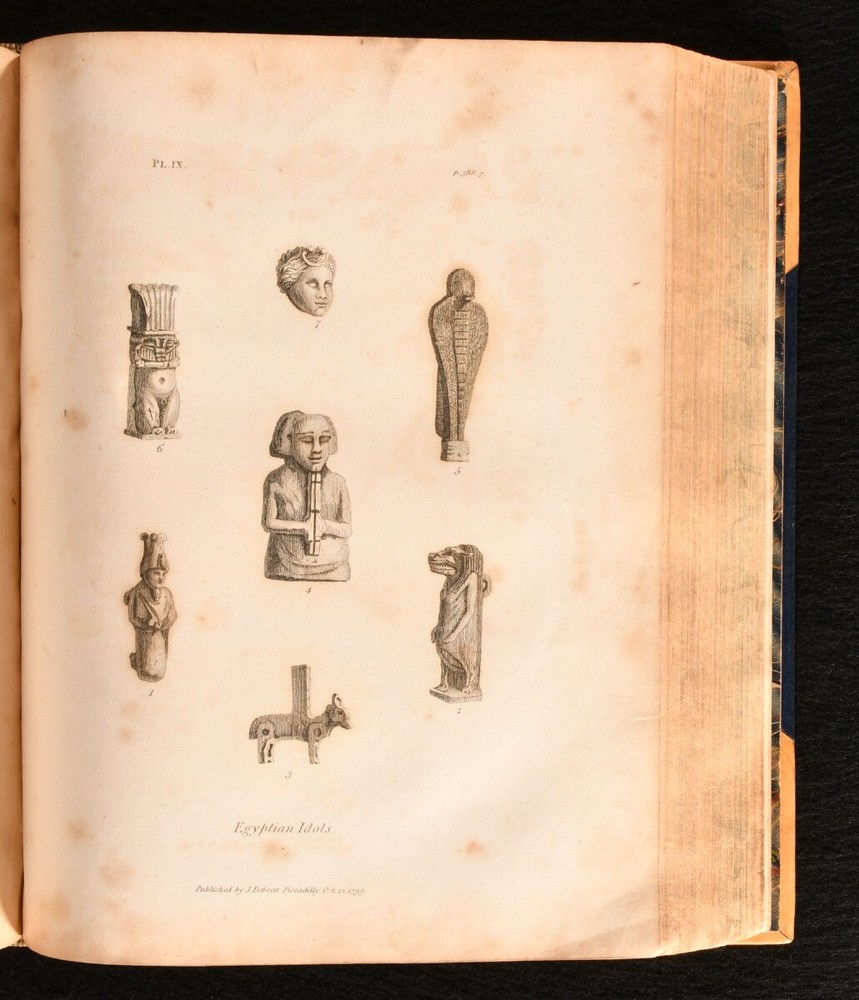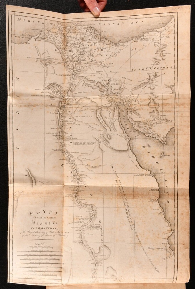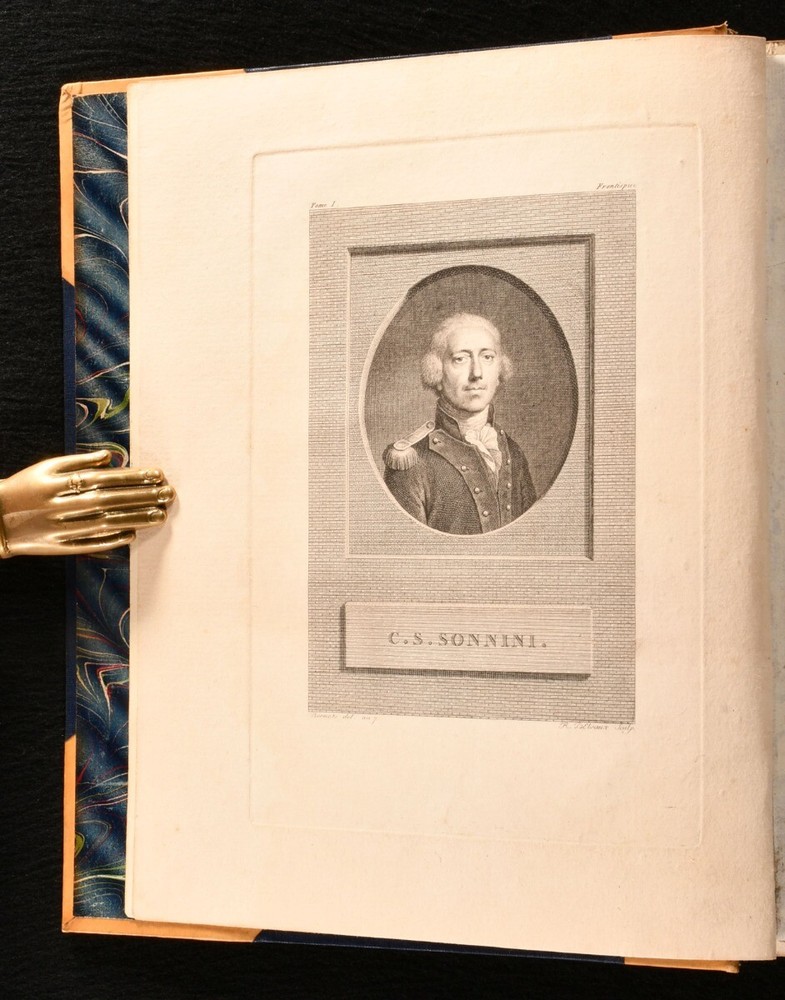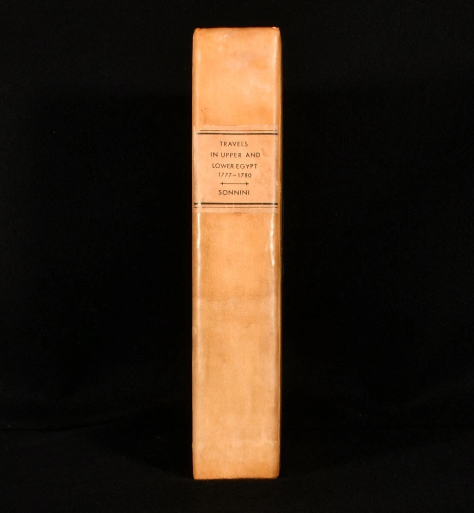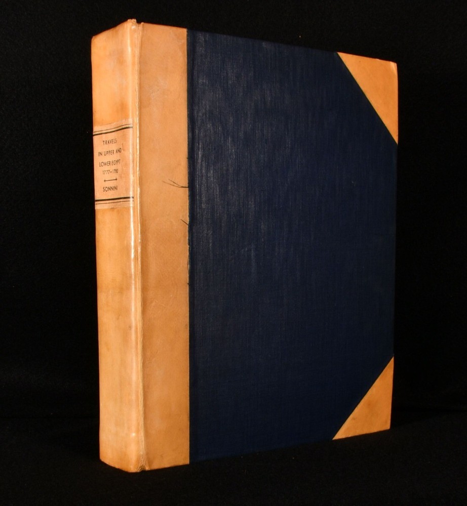 Click here to see our other books! Travels in Upper and Lower Egypt, Undertaken by Order of the Old Government of France C. S. Sonnini 1800 J. Debrett : London 10.5" by 8" [3], ii-xxv, [2], xxviii-xxix, [2], xxxii-xl, [1], 2-730, [14pp] SUMMARY The first edition thus of Charles-Nicolas Sonnini's travelogue on his time in Egypt, illustrated throughout, including with a folding map. First Edition,Folding Maps,Illustrated,Leather Binding,Rebound Overall Condition: Very Good This book weighs 3 KG when packed UK Postage: £ 3.99 US Postage: £ 36.99 EU Postage : £ 25.99 European Postage: £ 27.99 Asia Postage: £ 47.99 Worldwide Postage: £ 69.99 DESCRIPTION The first English edition of this work published in one volume. A 1799 edition was published in three volumes. Illustrated with a frontispiece, a folding map, and twenty-seven plates. Collated, complete. ESTC citation number T150187. One page of publisher's adverts to the rear. Sonnini's detailed travel work on Egypt as it was towards the end eighteenth century, detailing the author's expedition to Egypt in the 1770s. An interesting study on the natural history of Egypt. Written by Charles-Nicolas-Sigisbert Sonnini de Manoncourt. Sonnini was a French naturalist, writing one-hundred and seventy-two volumes of 'Histoire Naturelle' over his career. Translated from French to English by Henry Hunter, a Scottish minister known for his translations of Leonard Euler and Johann Kaspar Lavater. Stamp to Ricardo Caminos to the first leaf of the translator's preface. Caminos was an Egyptologist, who focused on epigraphy and palaeoraphy. CONDITION Rebound in a modern half calf binding with cloth to the boards. Externally, smart. A little fraying to the cloth to the front joint. Minor bumping to the extremities. Light marks to the boards and spine. A little discolouration to the spine. Small tear to the tail of the front endpaper. Internally firmly bound. Pages are lightly age-toned and generally clean with some odd spots. Folding map is cloth-backed., with a small repair. Small repair to the head of the title page. Prior owner's stamp to leaf i. Small closed tear to plate VI, with no loss. Spots to the folding map and plates. Overall Condition: Very Good GLOSSARY OF TERMS Overall Condition (Dustwrapper condition rating is shown after that for the book itself, where a dustwrapper is present) Fine - Very well preserved copy showing very little wear Very Good Indeed - Only one or two minor faults, really a very attractive copy Very Good - Quite a wide term meaning no major faults but probably several smaller ones often expected given the age of the book, but still a respectable copy Good - Meaning not very good. Some more serious faults as will be described in the condition report under 'condition' Good Only - Meaning one or more faults that could really do with repair Fair - As with good only above but with other faults leaving a compromised copy even after repair Poor - Really bad and possibly seriously incomplete. We only sell books in this condition where their rarity or value makes them attractive none the less. Major defects will be described. GUARANTEE We offer a full money back guarantee on our descriptions. Please ask for details and conditions. We prefer PAYPAL. If you pay via PAYPAL we will post the item off the same or the next working day with the postage you have selected. Please note we cannot accept USD cheques