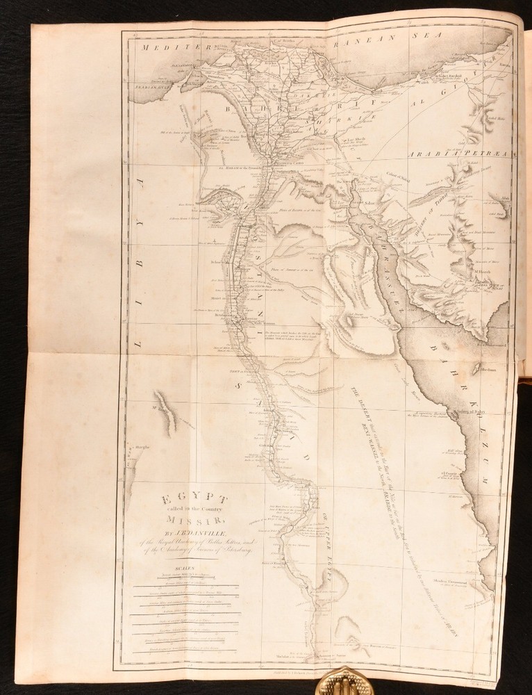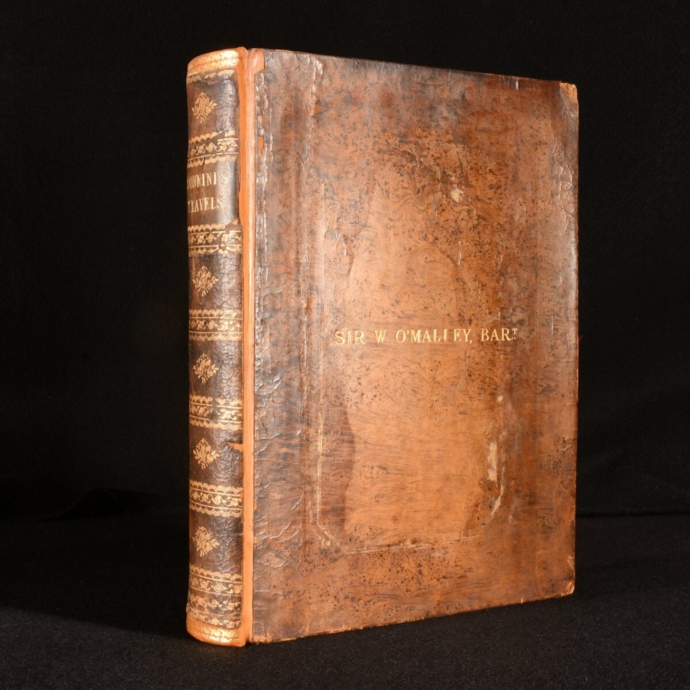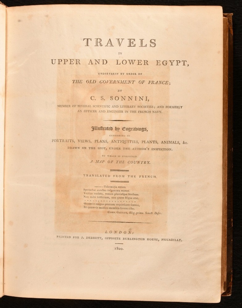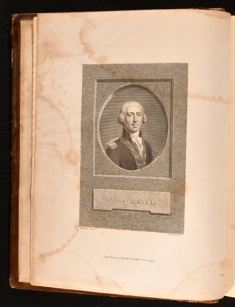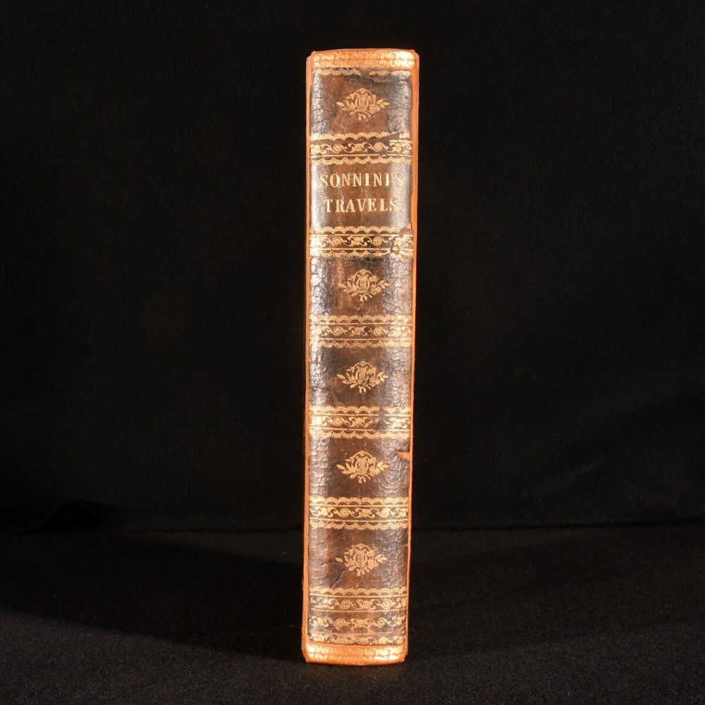 Click here to see our other books! Travels in Upper and Lower Egypt, Undertaken By Order of the Old Government of France C. S. Sonnini 1800 J. Debrett : London 11" by 8.5" [4], xl, 730, [12pp] SUMMARY A smart English edition of Sonnini's vividly detailed travel work on his time spent in Egypt, a lovely illustrated edition with a cloth-backed folding map. First Edition,Folding Maps,Illustrated,Leather Binding,Rebound Overall Condition: Good This book weighs 3 KG when packed UK Postage: £ 3.99 US Postage: £ 36.99 EU Postage : £ 25.99 European Postage: £ 27.99 Asia Postage: £ 47.99 Worldwide Postage: £ 69.99 DESCRIPTION The first English edition of this work published in one volume. A 1799 edition was published in three volumes. Illustrated with a frontispiece, a cloth-backed folding map, and twenty-seven plates. Half-title is present. Collated, complete. Sonnini's detailed travel work on Egypt as it was towards the end eighteenth century, detailing the author's expedition to Egypt in the 1770s. An interesting study on the natural history of Egypt. Written by Charles-Nicolas-Sigisbert Sonnini de Manoncourt. Sonnini was a French naturalist, writing one-hundred and seventy-two volumes of 'Histoire Naturelle' over his career. Translated from French to English by Henry Hunter, a Scottish minister known for his translations of Leonard Euler and Johann Kaspar Lavater. In the armorial binding of Sir William O'Malley, with the O'Malley crest family bookplate to the front paste down. CONDITION In a full marbled calf binding, rebacked with the original boards and spine restored. Light rubbing to the original calf, with a patch of loss to the rear board. Minor surface cracks to the spine. Light bumping to the extremities. Very small chip and closed tear to the spine label. Bookplate to the front paste down. Blind stamp to the rear endpaper. Internally, firmly bound. Pages are lightly age-toned with some scattered spots, including to the endpapers. Tidemark to the frontispiece and to the plates. Fainter tide mark and light spots to the cloth-backed folding map. Overall Condition: Good GLOSSARY OF TERMS Overall Condition (Dustwrapper condition rating is shown after that for the book itself, where a dustwrapper is present) Fine - Very well preserved copy showing very little wear Very Good Indeed - Only one or two minor faults, really a very attractive copy Very Good - Quite a wide term meaning no major faults but probably several smaller ones often expected given the age of the book, but still a respectable copy Good - Meaning not very good. Some more serious faults as will be described in the condition report under 'condition' Good Only - Meaning one or more faults that could really do with repair Fair - As with good only above but with other faults leaving a compromised copy even after repair Poor - Really bad and possibly seriously incomplete. We only sell books in this condition where their rarity or value makes them attractive none the less. Major defects will be described. GUARANTEE We offer a full money back guarantee on our descriptions. Please ask for details and conditions. We prefer PAYPAL. If you pay via PAYPAL we will post the item off the same or the next working day with the postage you have selected. Please note we cannot accept USD cheques