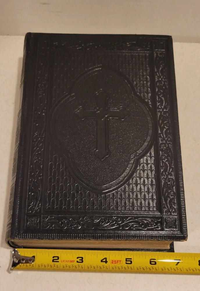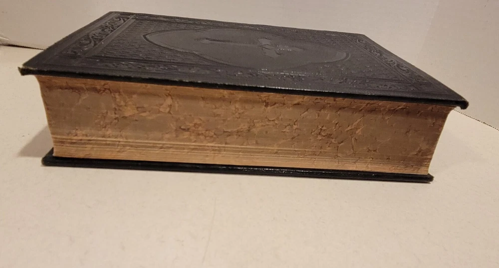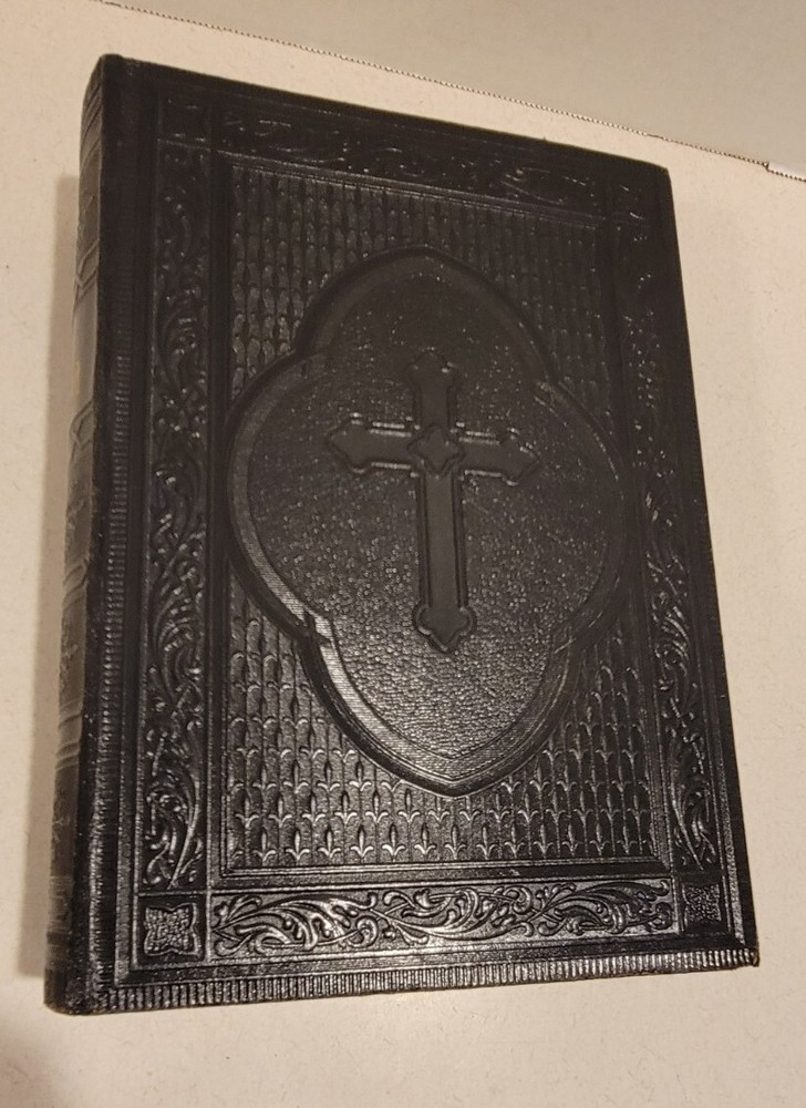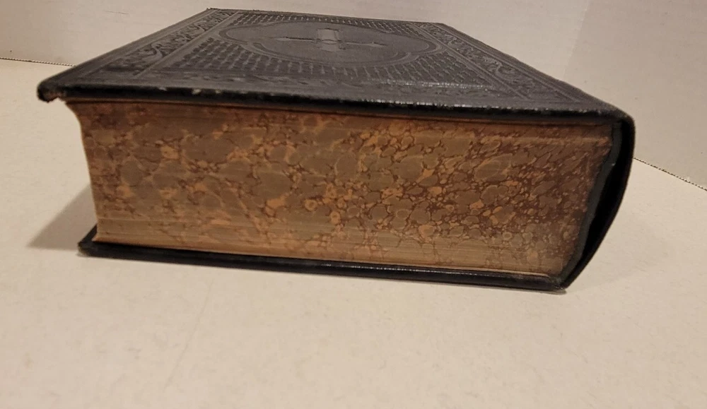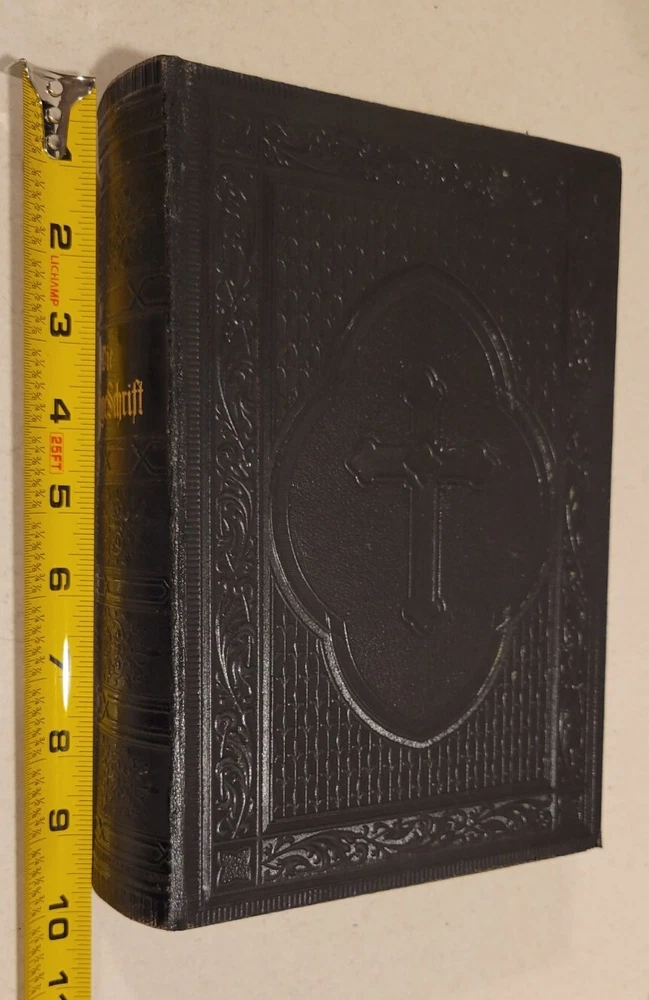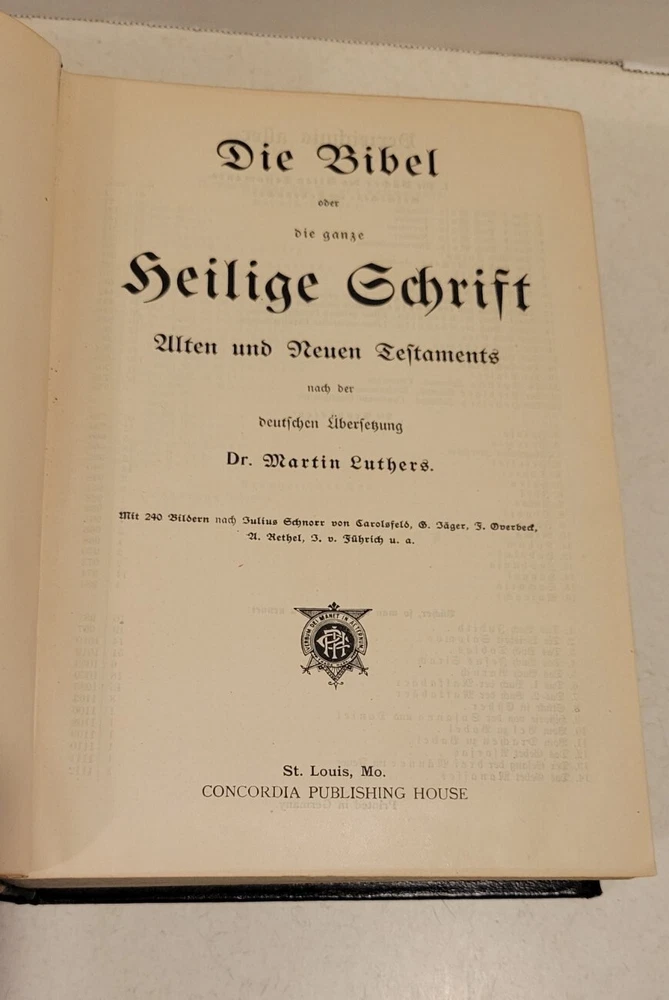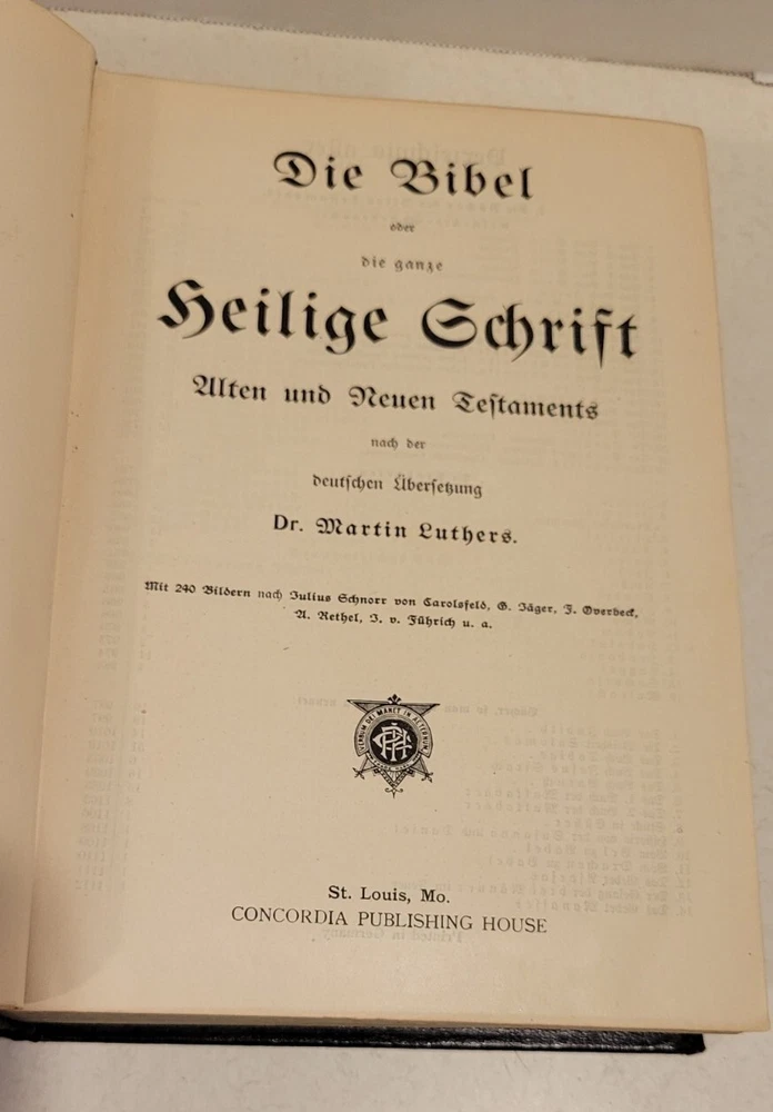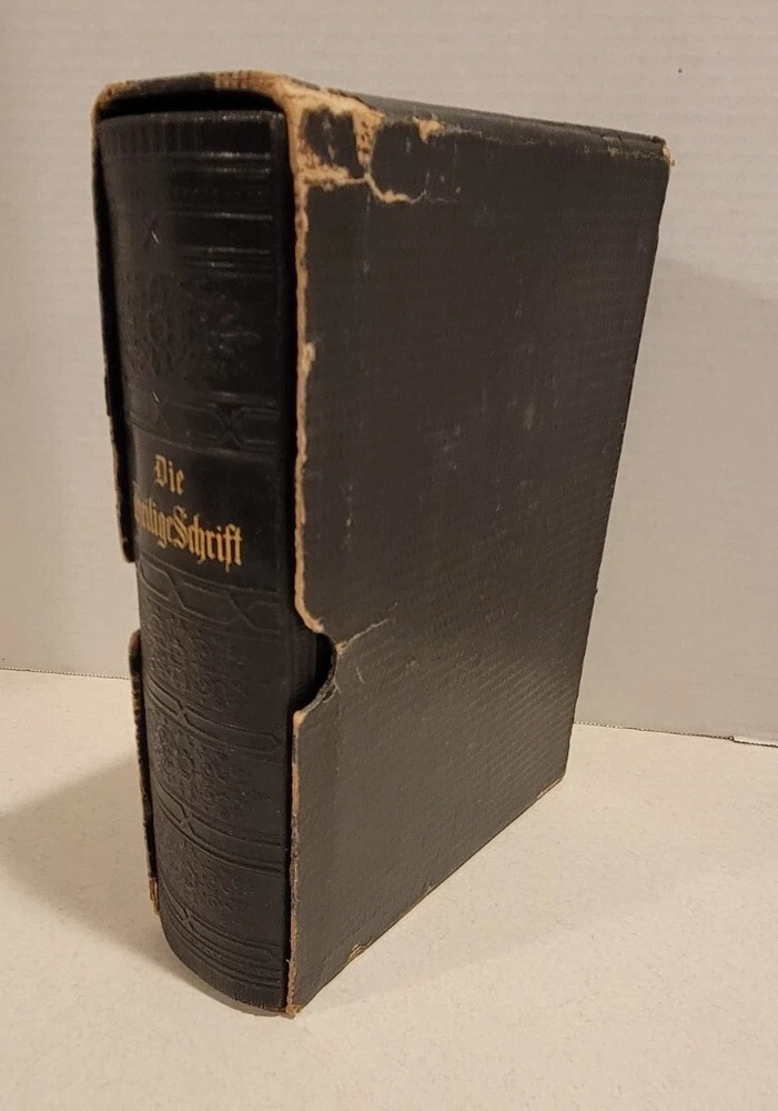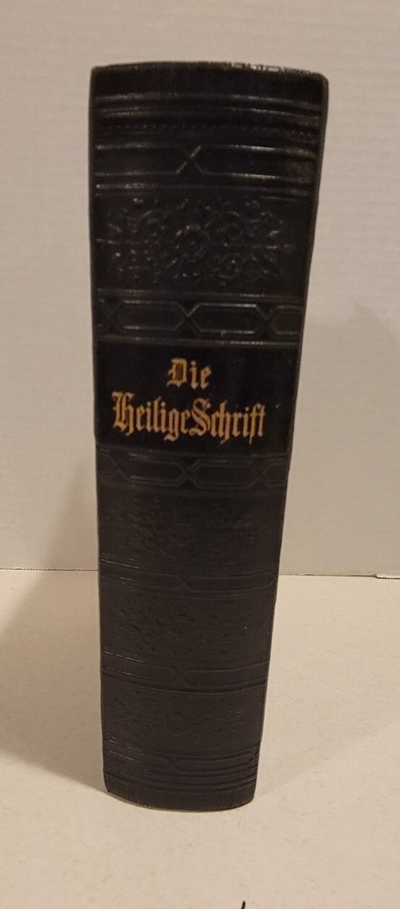 This antique German language Holy Bible by Dr. Martin Luther features a beautiful leather cover with intricate embossed designs. It includes maps and illustrations and has special attributes such as a box cover and family pages. The publisher is Concordia Publishing House, and the topic is Christianity and Bibles. This book is a rare find from the 1800s and is perfect for collectors of antiquarian and collectible books. This book is beautiful! A small amount of wear on corners, the box cover had protected it well. No writing inside. Please look at the pictures as they are part of the description.