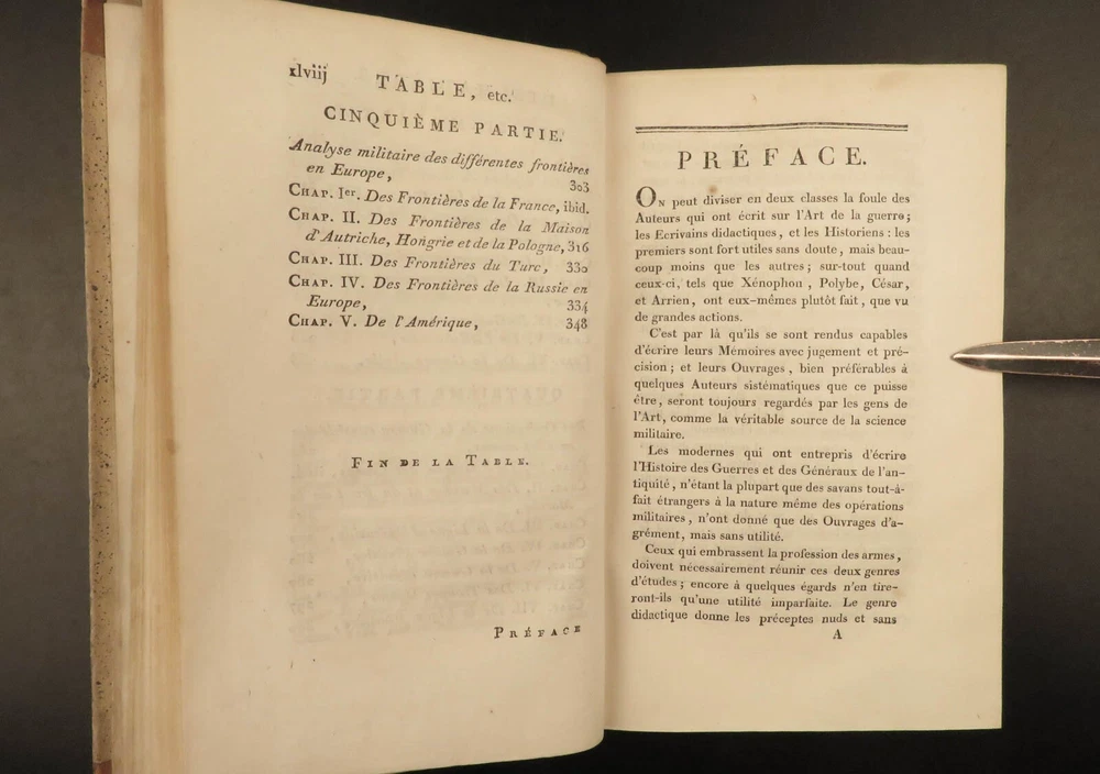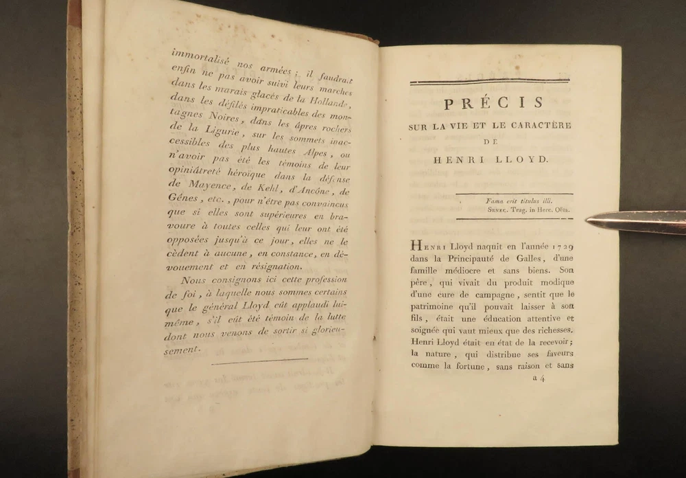 1801 MAPS Henry Lloyd War Memoirs Seven Years War Military Manual Prussia Henry Lloyd was an 18 th -century Welsh soldier known for his involvement in numerous European wars. Over his life, he fought with French and Austrian forces, Russian campaigns, and even fought for AND against Great Britain at different points. He wrote extensively on military theory and is known that George Washington even studied his books on the science of war. One of his books was “ History of the War in Germany ” – Lloyd’s most influential military book which became the standard for military instruction in the 18 th -century. It provided training on soldier organization, operation preparation, and the use of math and science in military planning. First written in 1766, this book was a response to his time in the Seven Years’ War. This early 19 th -century French edition of Lloyd’s ‘ History’ was published in Paris and given the title ‘ Military and Political Memoirs of Lloyd ’. Note the inclusion of impressive folding maps ! Item number: #20643 Price: $499 LLOYD, Henry H Mémoires militaires et politiques du général Lloyd : servant d'introduction à l'histoire de la guerre en Allemagne en 1756, entre le roi de Prusse et l'impératrice reine avec ses alliés Paris : Magimel, 1801. Details : · Collation: Complete with all pages o Memoirs – xlviii, 354 § 8 folding maps o Invasion and Defense of Great Britain – 38, 109, [1] § 2 folding maps · Language: French · Binding: Leather; tight and secure · Size : ~8in X 5.25in (20.5cm x 13.5cm) Our Guarantee: Very Fast. Very Safe. Free Shipping Worldwide. Customer satisfaction is our priority! Notify us with 7 days of receiving, and we will offer a full refund without reservation! 20643