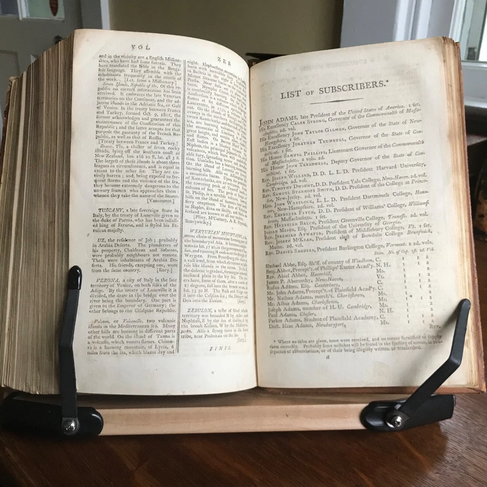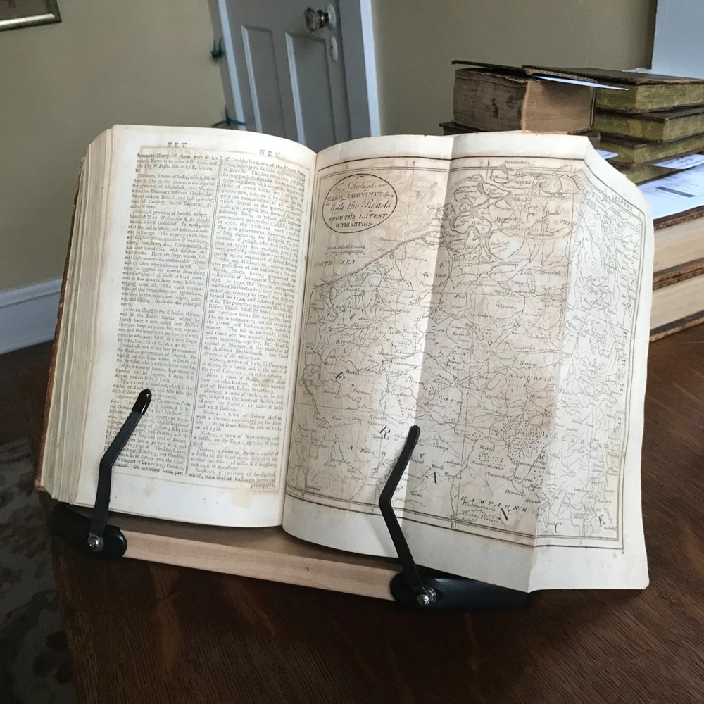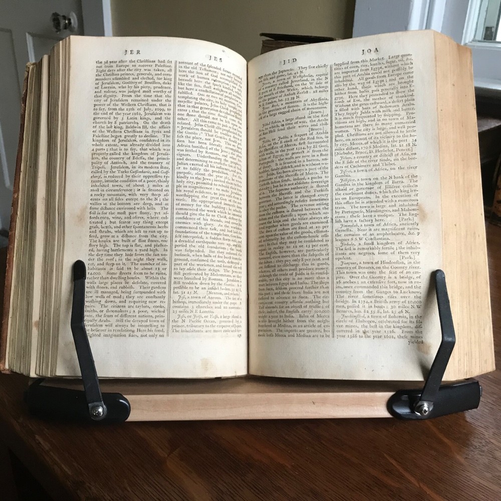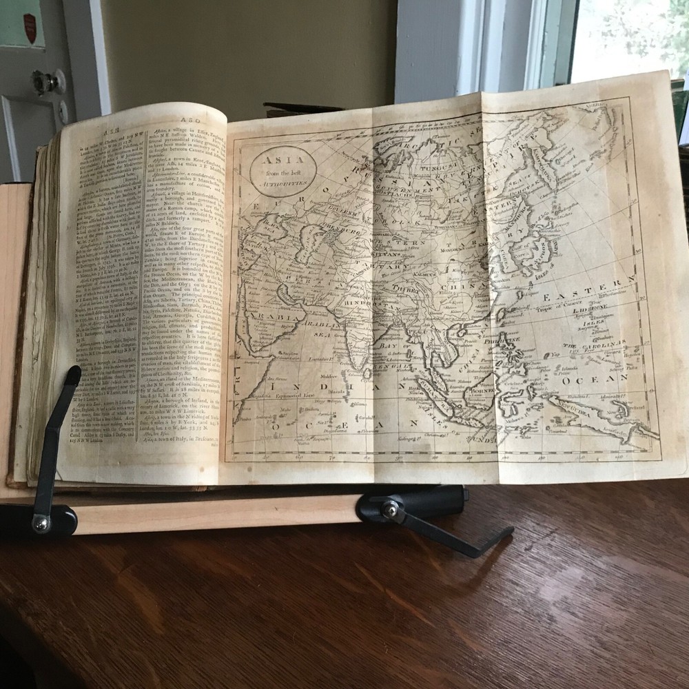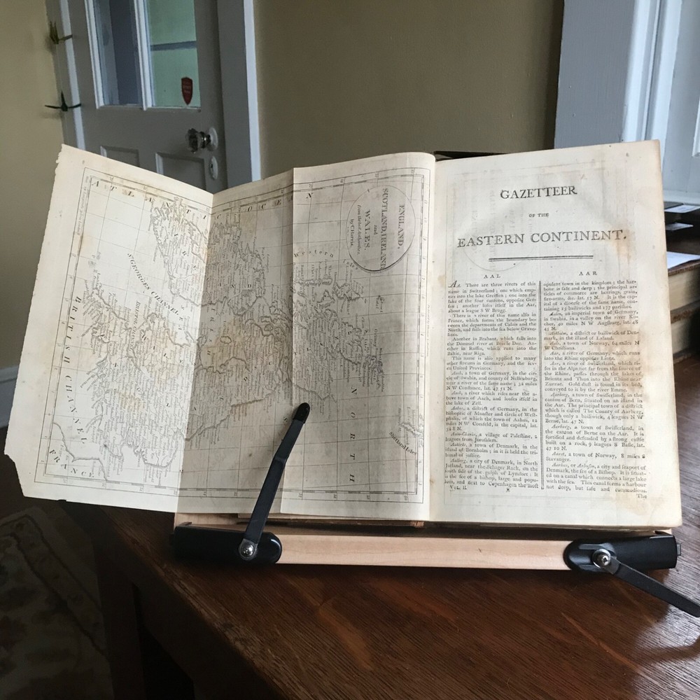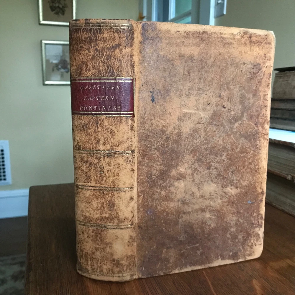 A New Gazetteer of the Eastern Continent; or A Geographical Dictionary: Containing, In Alphabetical Order, A Description of all the Countries, Kingdoms, States, Cities, Towns, Principal Rivers, Lakes, Harbours, Mountains, &c. &c. In Europe, Asia, Africa and Their Adjacent Islands. By Jedidiah Morse, and Rev. Elijah Parish, Illustrated with Eighteen Maps. Designed as a Second Volume, to the American Gazetteer, Printed and Sold by Samuel Etheridge, Charlestown, 1802, unpaginated, modern hardcover, 8.75 x 5.5”, thick 8vo. In good condition. Sturdy original leather binding with moderate dryness and scuffing along surface. Light wear to extremities with minor instances of rubbing to edges. Interior lightly toned with scattered foxing and minor age staining. All maps present according to the printer (stated in rear that there should be 17, not 18). A few maps rubbed at edges with minor tears. No tape repairs. All in working order. Free of known marginalia or ownership.. Binding tight and intact. Please see photos. First edition of Morse’s ambitious work. Maps include, Europe, Asia, Africa, England, Scotland and Ireland, France, Poland, Germany, Switzerland, Austrian and French Netherlands, Sweden, Denmark and Finland, Seven United Provinces, Spain and Portugal, Italy, Palestine, Turkey and Hungary, Hindoostan and Egypt. RAREA1802ENOX