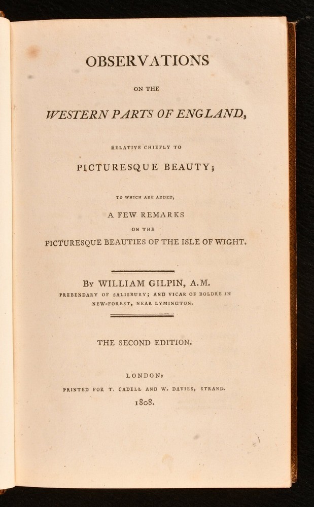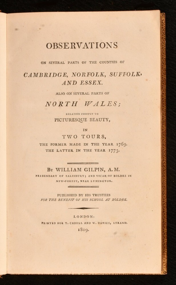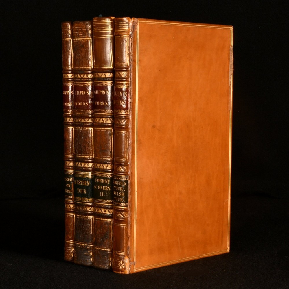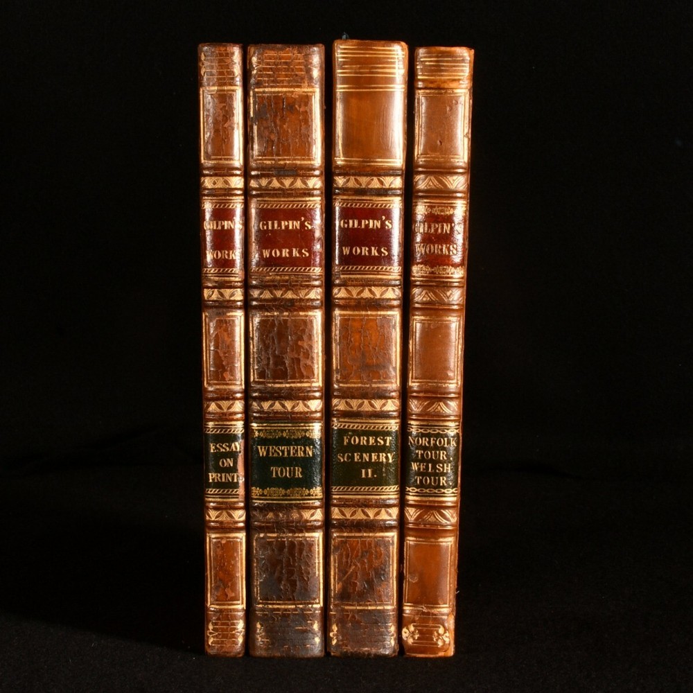 Click here to see our other books! An Essay on Prints; Observations on the Western Parts of England, Relative Chiefly to Picturesque Beauty; To Which are Added, a Few Remarks on the Picturesque Beauties of the Isle of Wight; Remarks on Forest Scenery, and Other Woodland Views, Relative Chiefly to Picturesque Beauty, Illustrated by the Scenes of New Forest in Hampshire; Observations on Several Parts of the Counties of Cambridge, Norfolk, Suffolk, and Essex. Also on Several Parts of North Wales; Relative Chiefly to Picturesque Beauty, in Two Tours, The Former Made in the Year 1769. The Latter in the Year 1773 William Gilpin 1802-1809 T. Cadell and W. Davies : London 8.5" by 5.5" xiii, 187, [1]; xvi, 359, [1]; 362; x, 208pp. SUMMARY Four popular works by the English artist, cleric and author, William Gilpin. Uniformly bound in smart full calf. Early Edition,Folding Maps,Folding Plates,Illustrated,Leather Binding,Rebound Overall Condition: Very Good This book weighs 3 KG when packed UK Postage: £ 3.99 US Postage: £ 36.99 EU Postage : £ 25.99 European Postage: £ 27.99 Asia Postage: £ 47.99 Worldwide Postage: £ 69.99 DESCRIPTION Four popular works by William Gilpin. Uniformly bound in smart full calf with gilt detail. William Gilpin was an English artist, Church of England cleric, and author. He is best known for his works of travel writing and topography, as well as for being one of the first users of the term, 'Picturesque'. He had a keen interest in aesthetics, and outdoor scenery. This set comprises of: 'An Essay on Prints', the fifth edition. One of Gilpin's most renowned and influential works, in which he discusses his principles of aesthetics and defines the picturesque. With one page of publisher's advertisements to the rear of the work. 'Observations on the Western Parts of England, Relative Chiefly to Picturesque Beauty; To Which are Added, A Few Remarks on the Picturesque Beauties of the Isle of Wight', the second edition. One of Gilpin's popular travel works. With eighteen full-page plates. With one page of publisher's advertisements to the rear. Collated complete. 'Remarks on Forest Scenery, and other Woodland Views, Relative Chiefly to Picturesque Beauty', the third edition. Volume two only, of the original two volumes. Illustrated with scenes of New Forest in Hampshire. With fourteen full-page plates and a folding map. Collated complete. 'Observations on Several Parts of the Counties of Cambridge, Norfolk, Suffolk, and Essex. Also on Several Parts of North Wales; Relative Chiefly to Picturesque Beauty, in Two Tours, The Former Made in the Year 1769. The Latter in the Year 1773', the first edition. Published by Gilpin's trustees, for the benefit of his school at Boldre, where Gilpin worked. With nineteen full-page plates. Collated complete. Each volume has a bookplate for one, 'William Charles Smith', to the front paste-down. CONDITION Uniformly bound in full calf. Externally, very smart with some rubbing to the extremities and marks to the boards. Spines are darkened. Some loss to the leather of the front board and lower spine of the 'Norfolk Tour'. The rear joint of, 'Western parts of England', is starting but still firm. The lower rear joint of, 'Forest Scenery', is cracked but firm. The rear hinges of, 'An Essay on Prints', 'Norfolk Tour', and, 'Western Parts of England', are starting but still very firm. Front hinge of, 'Norfolk Tour', is strained but firm. Bookplate to the front paste-downs of each volume. Light offsetting to the edges of the free endpapers. Internally, firmly bound. Pages lightly age-toned but otherwise generally bright and clean with light spotting throughout. Offsetting surrounding the plates in the illustrated volumes. Closed tear of about one inch to the folding map on page 51 of, 'Forest Scenery'. Pencil annotations to page 60 of 'Forest Scenery'. The front blank of, 'Forest Scenery', is loosening Overall Condition: Very Good GLOSSARY OF TERMS Overall Condition (Dustwrapper condition rating is shown after that for the book itself, where a dustwrapper is present) Fine - Very well preserved copy showing very little wear Very Good Indeed - Only one or two minor faults, really a very attractive copy Very Good - Quite a wide term meaning no major faults but probably several smaller ones often expected given the age of the book, but still a respectable copy Good - Meaning not very good. Some more serious faults as will be described in the condition report under 'condition' Good Only - Meaning one or more faults that could really do with repair Fair - As with good only above but with other faults leaving a compromised copy even after repair Poor - Really bad and possibly seriously incomplete. We only sell books in this condition where their rarity or value makes them attractive none the less. Major defects will be described. GUARANTEE We offer a full money back guarantee on our descriptions. Please ask for details and conditions. We prefer PAYPAL. If you pay via PAYPAL we will post the item off the same or the next working day with the postage you have selected. Please note we cannot accept USD cheques
