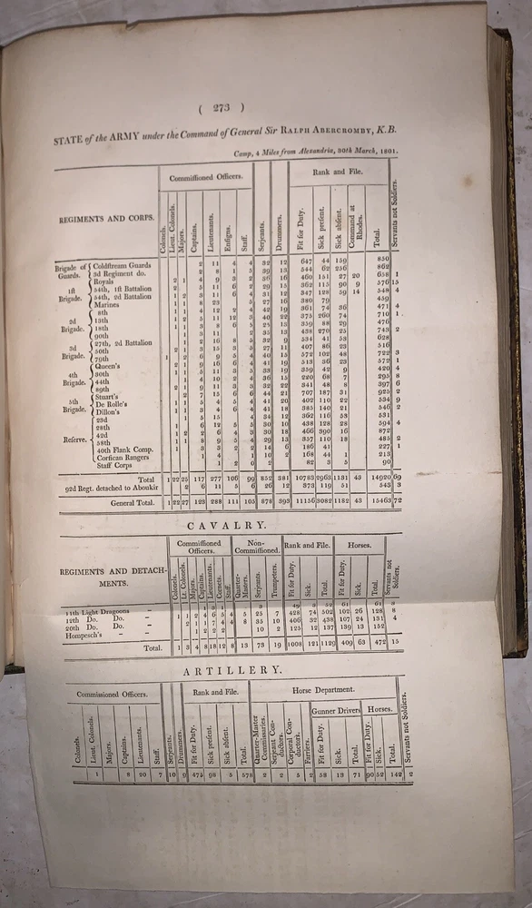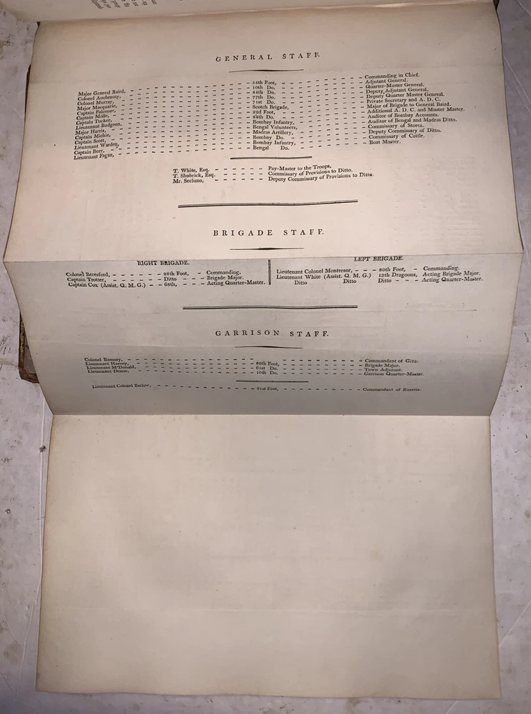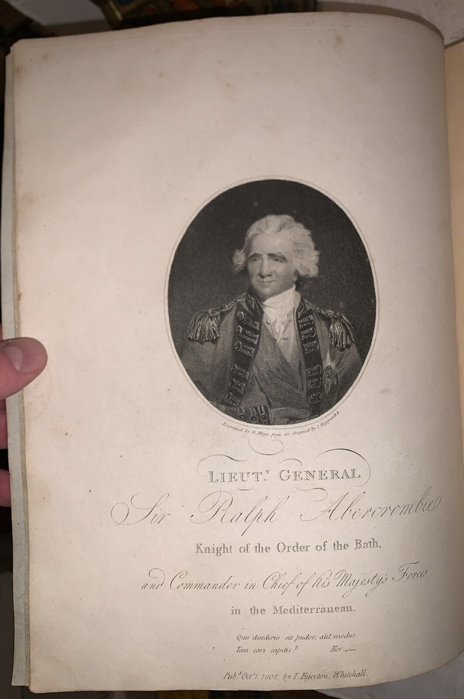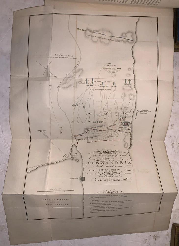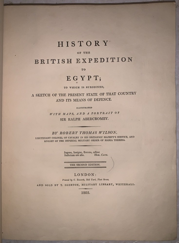 History of The British Expedition To Egypt; To Which is Subjoined A Sketch of The Present State of That Country And Its Means of Defence Illustrated With Maps And Portraits of Sir Ralph Abercromby by Robert Thomas Wilson London: T. Egerton 1803 The Second Edition Quarto, xxi, 389 pages, bound in periof full leather with gilt-lettering and decoration. Marbled endpapers. Illustrated with 2 fold-out tables and 3 fold-out maps. Top board detached, some minor rubbing and wear, minor discoloration, previous owner's inscription, else in good + condition. History of the British Expedition to Egypt; To Which is Subjoined a Sketch of the Present State of That Country and Its Means of Defence by Robert Thomas Wilson offers a detailed account of Britain’s military campaign in Egypt during the early 19th century. The book provides a comprehensive narrative of the expedition, emphasizing the strategic maneuvers, battles, and leadership that shaped the campaign, with a particular focus on the contributions of Sir Ralph Abercromby. Wilson, a British military officer and historian, enhances the work with insightful commentary on Egypt's political and military state at the time, including its defensive capabilities and resources. Featuring maps and portraits, including one of Abercromby, the book serves both as a historical record and a tribute to the military achievements of the era. It remains an invaluable resource for those interested in British military history and early 19th-century geopolitics. If you have any questions, feel free to ask, and don't forget to check out my other listings.
