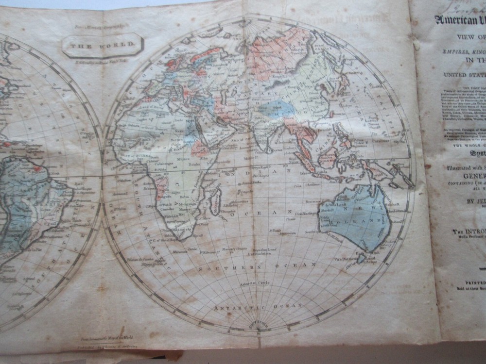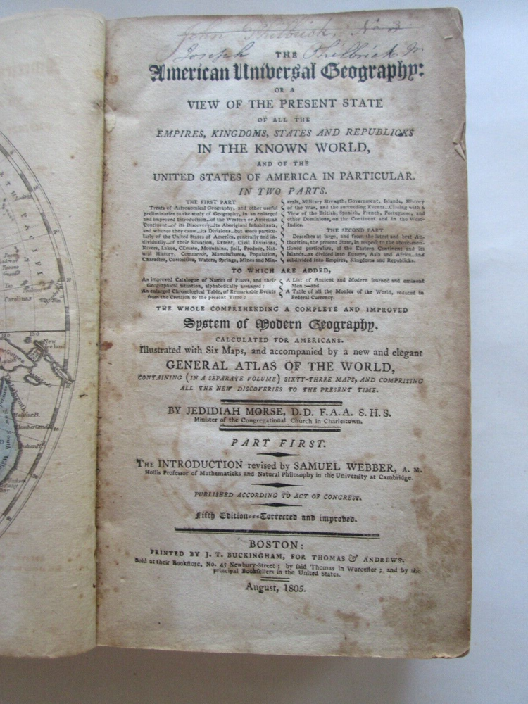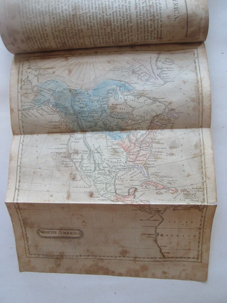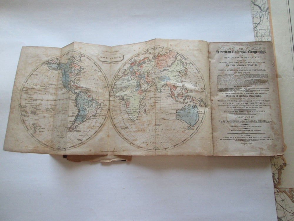 PICTURES WERE TAKEN INDOORS IN NATURAL LIGHT. LIGHT SOURCE IS TO THE TOP. THERE ARE SHADOWS AND REFLECTIONS. You are bidding on ONE ANTIQUE BOOK. This is the 1805 AMERICAN UNIVERSAL GEOGRAPHY, "PART FIRST" JEDIDIAH MORSE, THREE MAPS THIS IS PART ONE ONLY. MAPS ARE HEMISPHERES, NORTH AMERICA, AND SOUTH AMERICA. PLEASE SEE SFIRST PICTURE FOR TITLE PAGE. PUBLISHED by "SHIRLEY AND HYDE, PORTLAND: PRINTED IN: THOMAS & ANDREWS, BOSTOM DATE: 1805 SIZE: Book is 5-1/4" wide by 8-5/8" tall by 2-1/2" thick. CONDITION: FAIR CONDITION WITH SPLIT BINDING AND FOXING. IT IS COMPLETE. BETTER PICTURES: EMAIL ME IF YOU WANT HIGHER RESOLUTION AND/OR MORE SPECIFIC PICS AND DESCRIPTIONS. SHIPPING & HANDLING: PLEASE NOTE: I SHIP ONCE A WEEK. SHIPPING TO THE 48 CONTIGUOUS UNITED STATES WILL BE $12.00 VIA U.S.P.S. PRIORITY MAIL.. I ship via U.S.P.S. only. PLEASE CHECK OUT MY OTHER AUCTIONS.