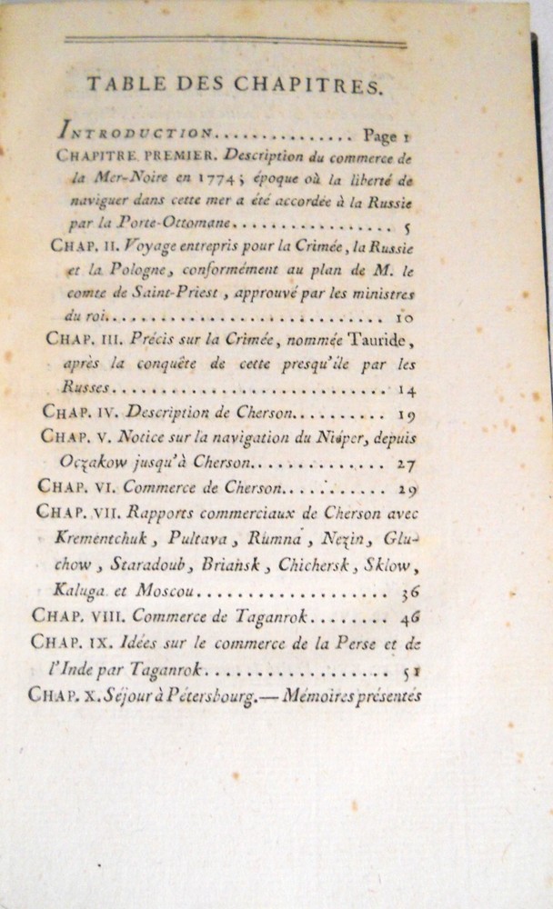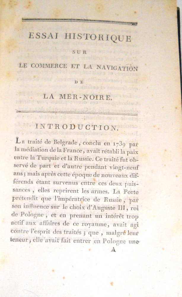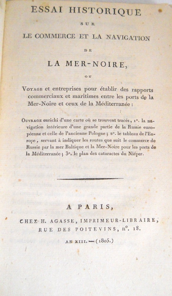 1805 BLACK SEA HISTORY COMMERCE NAVIGATION W/ MAP ANTHOINE DE SAINT-JOSEPH Anthoine de Saint-Joseph, Antoine-Ignace. Essai Historique sur le Commerce et la Navigation de la Mer-Noir... Paris: Chez. H. Agasse, 1805. Octavo, calf-backed marbled paper-covered boards with marbled endpapers, xvi, 300, [1] pp. Text in French. With folding map of Russia at rear. First Edition. Rubbing at extremities with a scuff to leather at spine crown; a few minor stains; small stub-tear to map; very good. Scarce French work on trade and navigation on the Black Sea published to facilitate trade with Russia and Poland. Antoine Ignace Anthoine (1749–1826) was a French merchant and politician. He was Mayor of the city of Marseille from 1805-13.