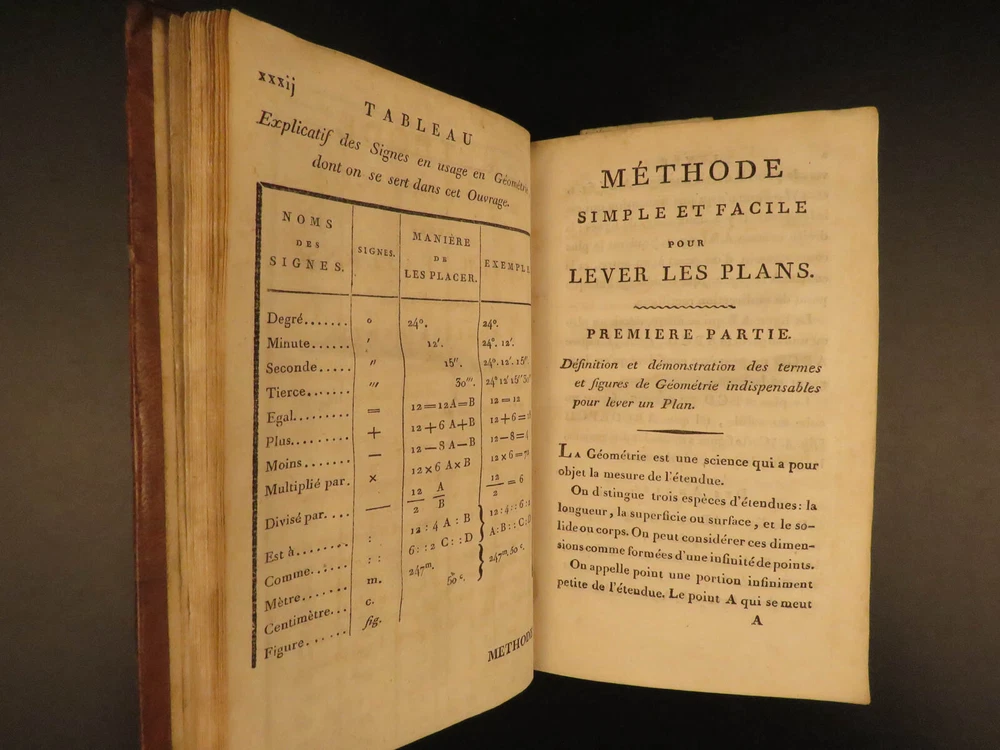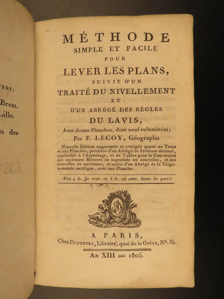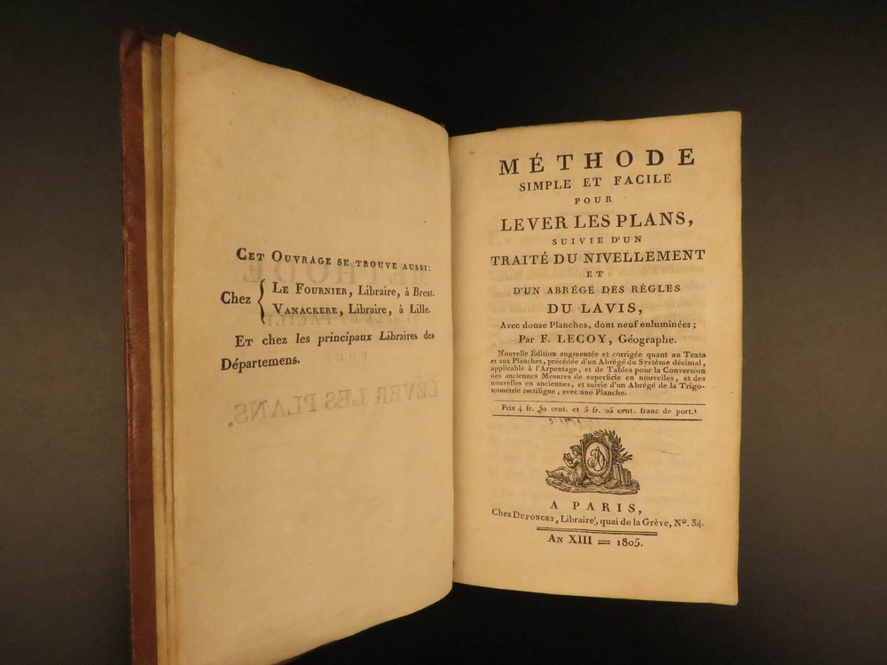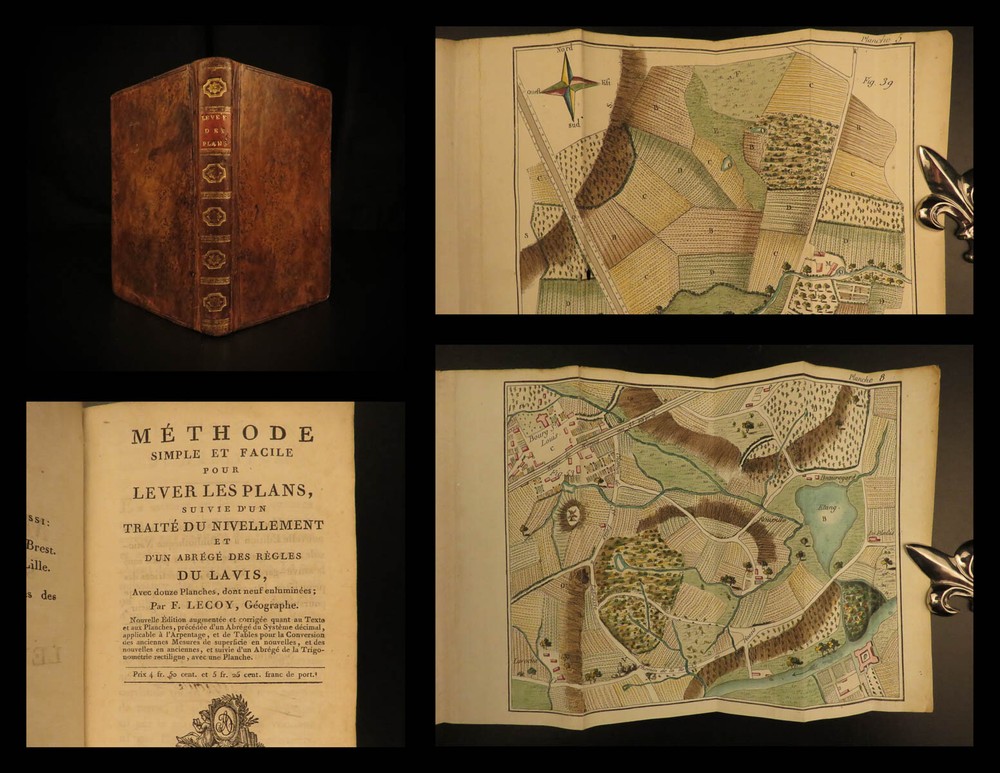 1805 Surveying Method Topography COLOR Map Making Landscaping Construction Lecoy Francois Lecoy’s ‘ Simple and Easy Methods for Surveying ’ is a fine, early 19 th -century treatise on the systems used in construction and map preparation. Lecoy discusses the means by which French surveyors level land through the means of linear trigonometry. This 1805 first edition is an exception example of early 19 th -century landscaping and topography. Note that this book includes impressive, folding color engravings of topographical examples and surveying tools. Item number: #11652 Price: $599 LECOY, François Méthode simple et facile pour lever les plans, suivie d'un traité du nivellement, d'un abrégé des règles du lavis et des élémens de trigonométrie rectiligne A Paris : Chez Duponcet ..., an XIII=1805. First edition. Details : · Collation: Complete with all pages o xxxii, 119, [1], 12 o 12 folding plates · Provenance: Handwritten – Duponcet o Signed by the publisher · Language: French · Binding: Leather; tight & secure · Size : ~7in X 4in (18cm x 10cm) Our Guarantee: Very Fast. Very Safe. Free Shipping Worldwide. Customer satisfaction is our priority! Notify us with 7 days of receiving, and we will offer a full refund without reservation! 11652