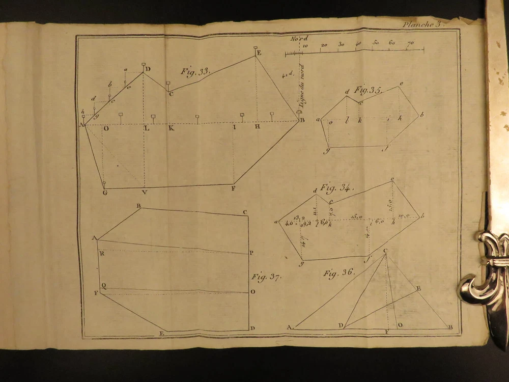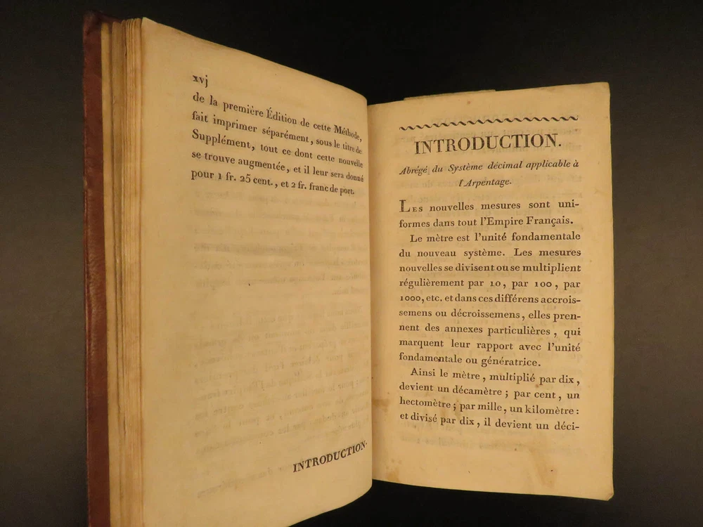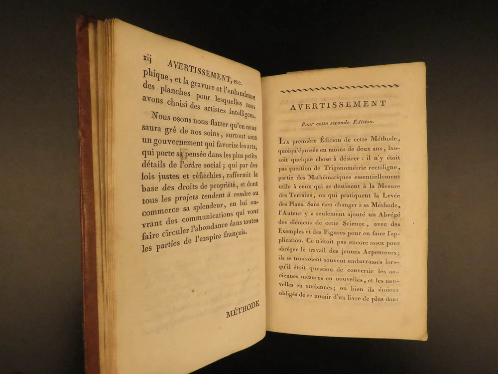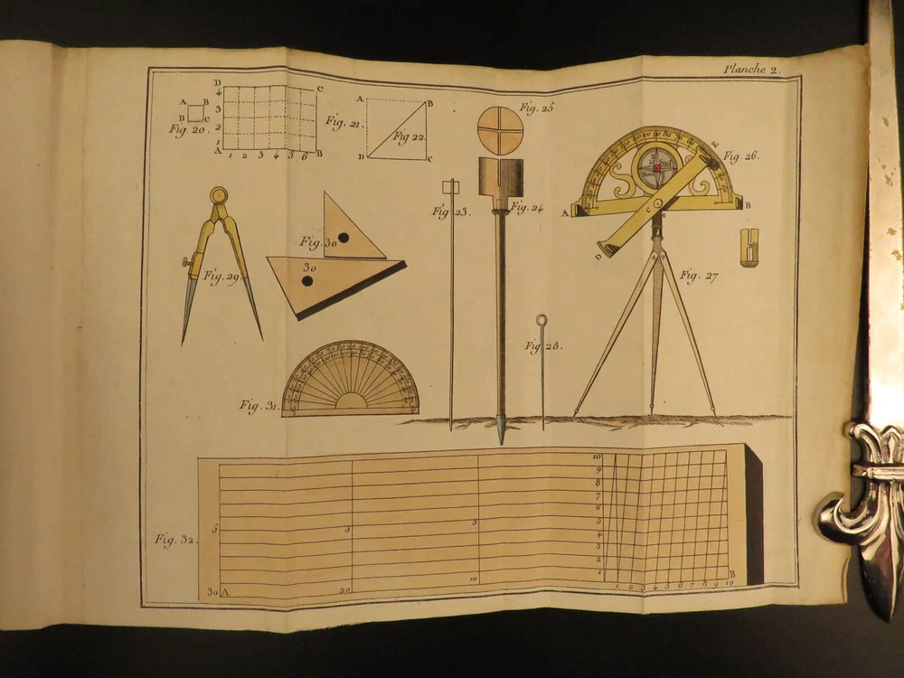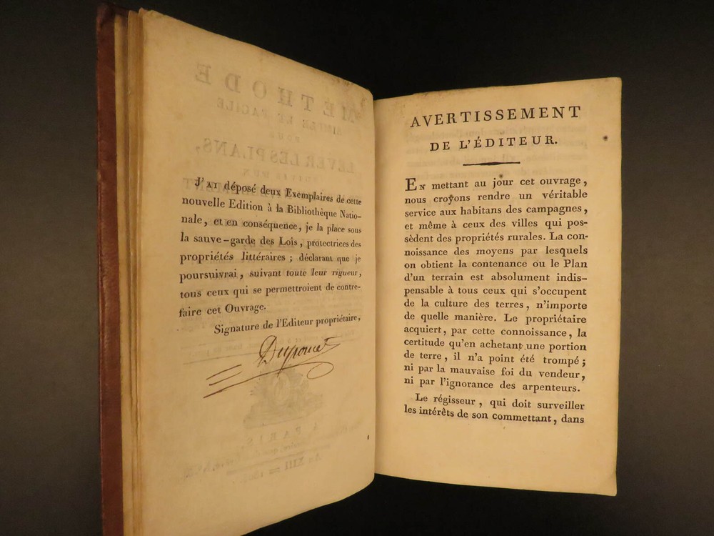 1805 Surveying Method Topography COLOR Map Making Landscaping Construction Lecoy Francois Lecoy’s ‘ Simple and Easy Methods for Surveying ’ is a fine, early 19 th -century treatise on the systems used in construction and map preparation. Lecoy discusses the means by which French surveyors level land through the means of linear trigonometry. This 1805 first edition is an exception example of early 19 th -century landscaping and topography. Note that this book includes impressive, folding color engravings of topographical examples and surveying tools. Item number: #11652 Price: $599 LECOY, François Méthode simple et facile pour lever les plans, suivie d'un traité du nivellement, d'un abrégé des règles du lavis et des élémens de trigonométrie rectiligne A Paris : Chez Duponcet ..., an XIII=1805. First edition. Details : · Collation: Complete with all pages o xxxii, 119, [1], 12 o 12 folding plates · Provenance: Handwritten – Duponcet o Signed by the publisher · Language: French · Binding: Leather; tight & secure · Size : ~7in X 4in (18cm x 10cm) Our Guarantee: Very Fast. Very Safe. Free Shipping Worldwide. Customer satisfaction is our priority! Notify us with 7 days of receiving, and we will offer a full refund without reservation! 11652