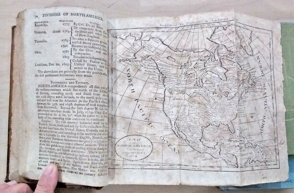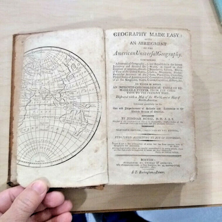 Greetings! Old Saratoga Books is pleased to offer: Geography Made Easy: Being an Abridgment of the American Universal Geography , by Jedidiah Morse, Boston: Thomas & Andrews, 1807, eleventh edition, corrected by the author. Full tree calf binding with maroon gilt-titled leather lettering piece on spine. Gilt ruling on spine. Two folding maps: a frontispiece world map (missing outer half) and a map of North America and the Caribbean islands. 431pp. Good. Boards splayed and worn, foxing, several small waterstains and ink stains, penciled owner signatures on front pastedown endpaper. Howes M850 notes that this was the “first American school geography and first American book describing the Western country.” Sabin 50936. Interesting opinions and observations throughout the text, including description of indigenous people, mention of the venomous spit of South American llamas, Mexico’s floating gardens, American birds, alligators, and other wildlife, as well as commentary about African countries on the Slave Coast to make “some amends [which] could be made for past treachery to the natives.” Morse is best known as a minister and educator, as well as the metaphorical “father of American geography” and biological father of Samuel F.B. Morse. Thank you for visiting our auctions. Old Saratoga Books owners Dan and Rachel Jagareski have been selling books since 1996. We had an open shop for twenty years in the historic village of Schuylerville and now sell books exclusively online. We are members of the Independent Online Booksellers Association (IOBA).