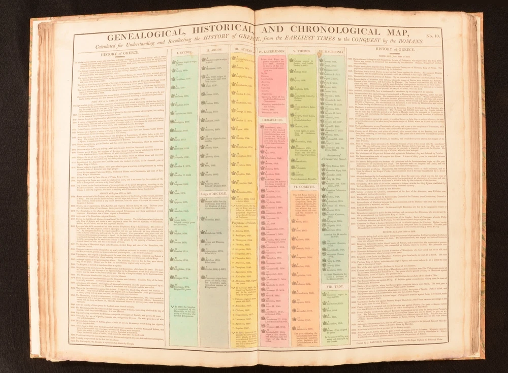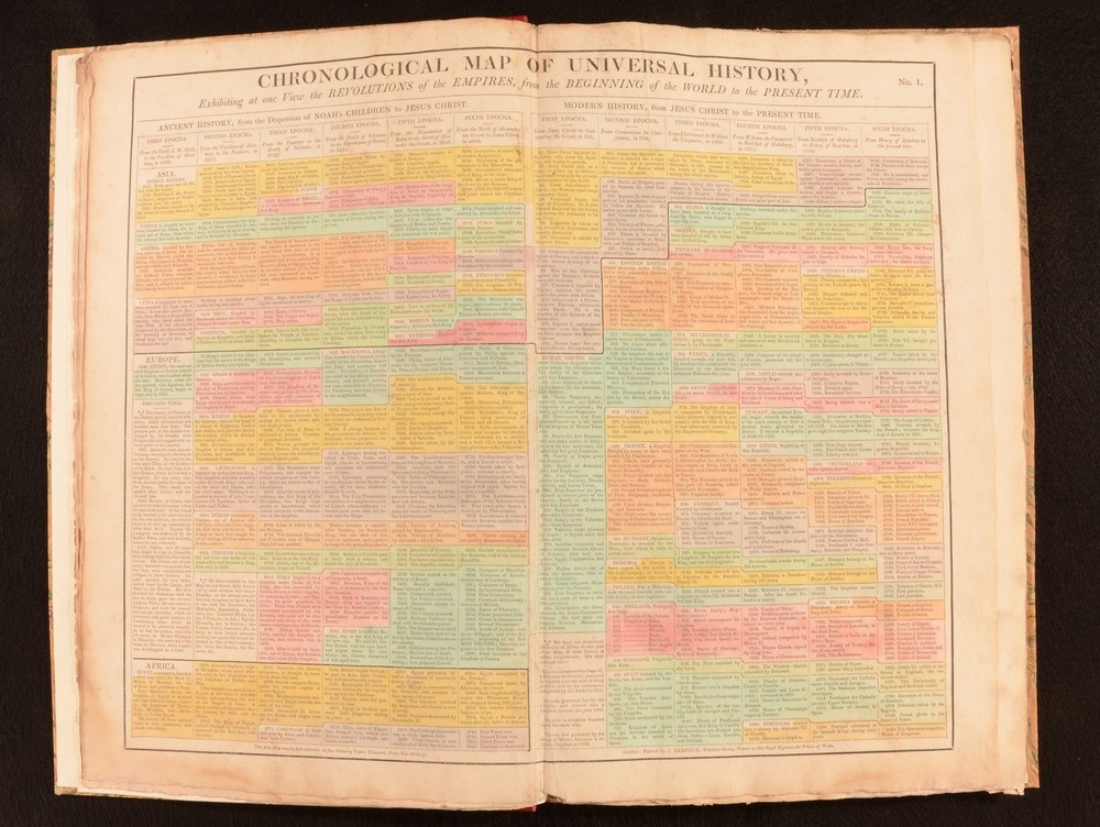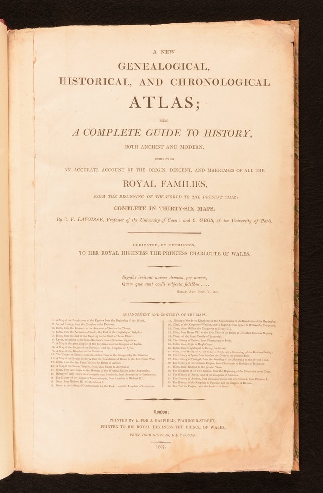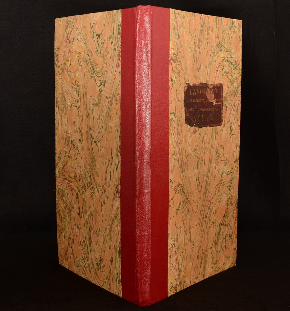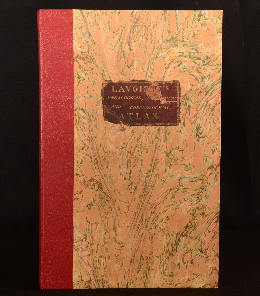 Click here to see our other books! A New Genealogical, Historical, and Chronological Atlas; Being a Complete Guide to History, Both Ancient and Modern, Exhibiting an Accurate Account of the Origin, Descent, and Marriages of all the Royal Families, From the Beginning of the World to the Present Time C. V. Lavoisne; C. Gros 1807 J. Barfield : London 18" by 11" [5], 6-7, [141pp] SUMMARY A collection of atlas inspired maps that show the genealogical and history of the world, organised in hand-coloured easy to read plates. First Edition,Leather Binding,Scarce Overall Condition: Very Good This book weighs 2 KG when packed UK Postage: £ 3.99 US Postage: £ 29.99 EU Postage : £ 21.99 European Postage: £ 23.99 Asia Postage: £ 37.99 Worldwide Postage: £ 38.99 DESCRIPTION The first edition of this work. A scarce work. With thirty-five hand-coloured double paged plates. With a key containing an explanation of the marks and abbreviations used in the maps. Collated, bound without plate twenty-two. This work is called an atlas, whereas it only drew inspiration from an atlas. It consists of genealogical and chronological tables that document important phases in history, rather than maps. The work is an interesting approach to learning history, laying out the chronology and genealogical of the world in a series of flow diagrams and easy to follow descriptive text. It was intended to provide a more entertaining resource from which children and adults could learn about various aspects of global history. The discussions of the maps include 'Sacred History, from the Creation to the Passover', 'A Map of the Roman Empire, from Julius Caesar to Aurelianus', and 'The History of France, from Pharamond to Pepin'. Compiled by C. V. Lavoisne, who was a Professor at the University of Caen, and C. Gros, who was a Professor at the University of Paris. Lavoisne died before the completion of this work, and so it was continued by Gros. CONDITION In a quarter morocco binding with marbled paper to the boards. Externally, smart. Original label to the front board with some loss and rubbing. Internally, firmly bound. Pages are bright and generally clean with the odd mark and handling mark. Plate 25 with some loss to the bottom and fore edge, resulting in loss of some text. Overall Condition: Very Good GLOSSARY OF TERMS Overall Condition (Dustwrapper condition rating is shown after that for the book itself, where a dustwrapper is present) Fine - Very well preserved copy showing very little wear Very Good Indeed - Only one or two minor faults, really a very attractive copy Very Good - Quite a wide term meaning no major faults but probably several smaller ones often expected given the age of the book, but still a respectable copy Good - Meaning not very good. Some more serious faults as will be described in the condition report under 'condition' Good Only - Meaning one or more faults that could really do with repair Fair - As with good only above but with other faults leaving a compromised copy even after repair Poor - Really bad and possibly seriously incomplete. We only sell books in this condition where their rarity or value makes them attractive none the less. Major defects will be described. GUARANTEE We offer a full money back guarantee on our descriptions. Please ask for details and conditions. We prefer PAYPAL. If you pay via PAYPAL we will post the item off the same or the next working day with the postage you have selected. Please note we cannot accept USD cheques