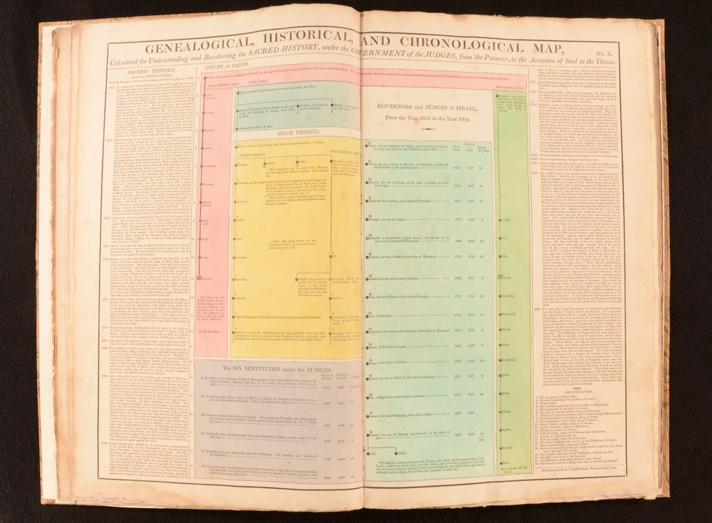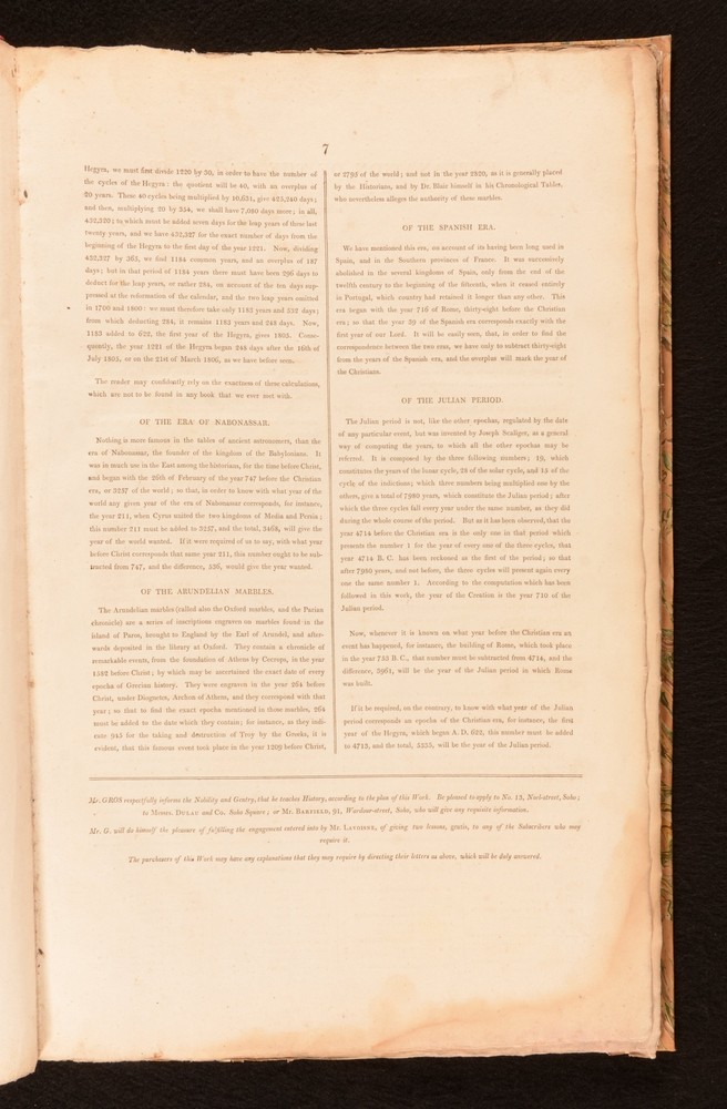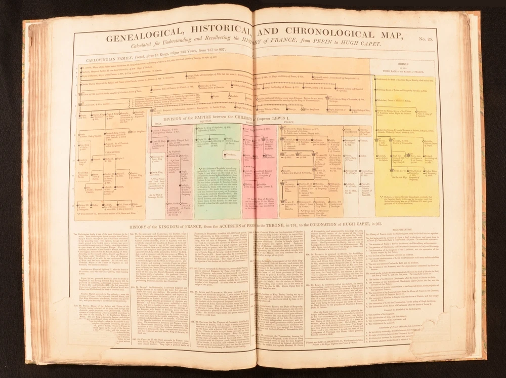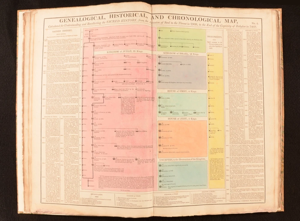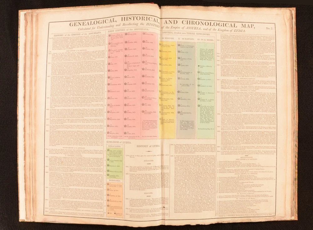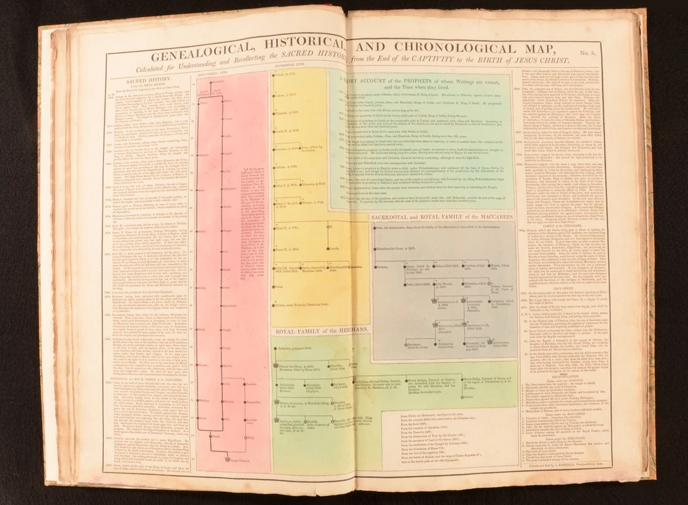 Click here to see our other books! A New Genealogical, Historical, and Chronological Atlas; Being a Complete Guide to History, Both Ancient and Modern, Exhibiting an Accurate Account of the Origin, Descent, and Marriages of all the Royal Families, From the Beginning of the World to the Present Time C. V. Lavoisne; C. Gros 1807 J. Barfield : London 18" by 11" [5], 6-7, [141pp] SUMMARY A collection of atlas inspired maps that show the genealogical and history of the world, organised in hand-coloured easy to read plates. First Edition,Leather Binding,Scarce Overall Condition: Very Good This book weighs 2 KG when packed UK Postage: £ 3.99 US Postage: £ 29.99 EU Postage : £ 21.99 European Postage: £ 23.99 Asia Postage: £ 37.99 Worldwide Postage: £ 38.99 DESCRIPTION The first edition of this work. A scarce work. With thirty-five hand-coloured double paged plates. With a key containing an explanation of the marks and abbreviations used in the maps. Collated, bound without plate twenty-two. This work is called an atlas, whereas it only drew inspiration from an atlas. It consists of genealogical and chronological tables that document important phases in history, rather than maps. The work is an interesting approach to learning history, laying out the chronology and genealogical of the world in a series of flow diagrams and easy to follow descriptive text. It was intended to provide a more entertaining resource from which children and adults could learn about various aspects of global history. The discussions of the maps include 'Sacred History, from the Creation to the Passover', 'A Map of the Roman Empire, from Julius Caesar to Aurelianus', and 'The History of France, from Pharamond to Pepin'. Compiled by C. V. Lavoisne, who was a Professor at the University of Caen, and C. Gros, who was a Professor at the University of Paris. Lavoisne died before the completion of this work, and so it was continued by Gros. CONDITION In a quarter morocco binding with marbled paper to the boards. Externally, smart. Original label to the front board with some loss and rubbing. Internally, firmly bound. Pages are bright and generally clean with the odd mark and handling mark. Plate 25 with some loss to the bottom and fore edge, resulting in loss of some text. Overall Condition: Very Good GLOSSARY OF TERMS Overall Condition (Dustwrapper condition rating is shown after that for the book itself, where a dustwrapper is present) Fine - Very well preserved copy showing very little wear Very Good Indeed - Only one or two minor faults, really a very attractive copy Very Good - Quite a wide term meaning no major faults but probably several smaller ones often expected given the age of the book, but still a respectable copy Good - Meaning not very good. Some more serious faults as will be described in the condition report under 'condition' Good Only - Meaning one or more faults that could really do with repair Fair - As with good only above but with other faults leaving a compromised copy even after repair Poor - Really bad and possibly seriously incomplete. We only sell books in this condition where their rarity or value makes them attractive none the less. Major defects will be described. GUARANTEE We offer a full money back guarantee on our descriptions. Please ask for details and conditions. We prefer PAYPAL. If you pay via PAYPAL we will post the item off the same or the next working day with the postage you have selected. Please note we cannot accept USD cheques