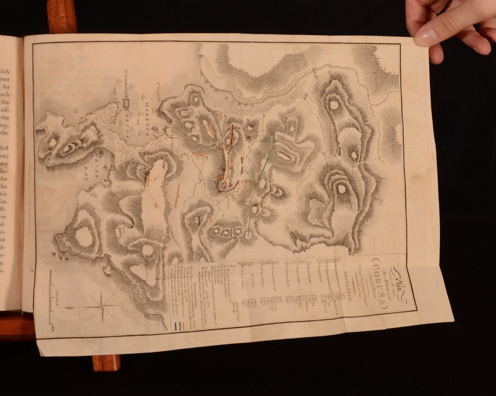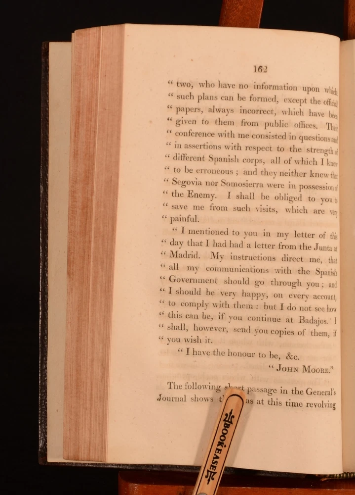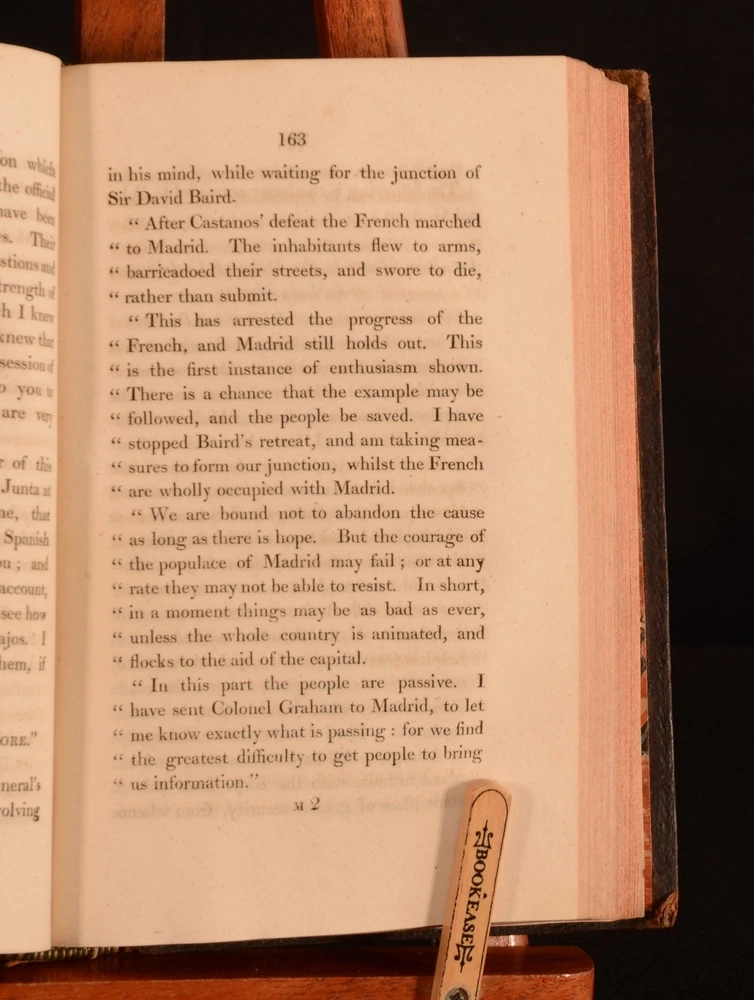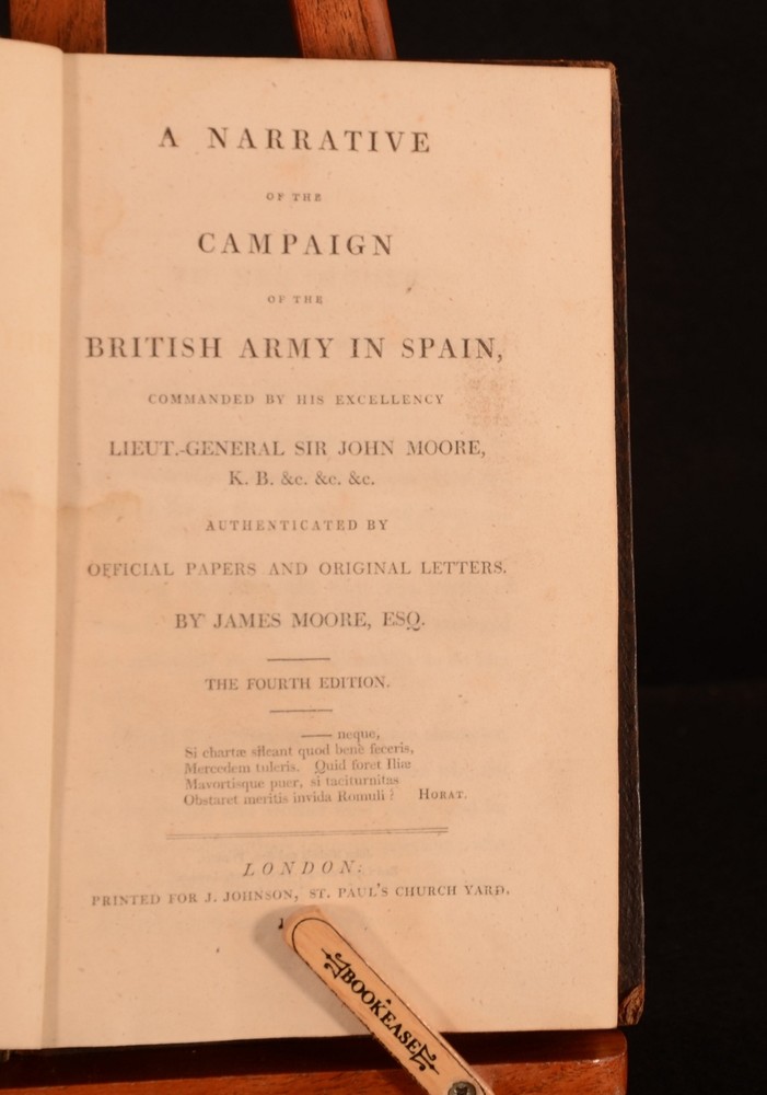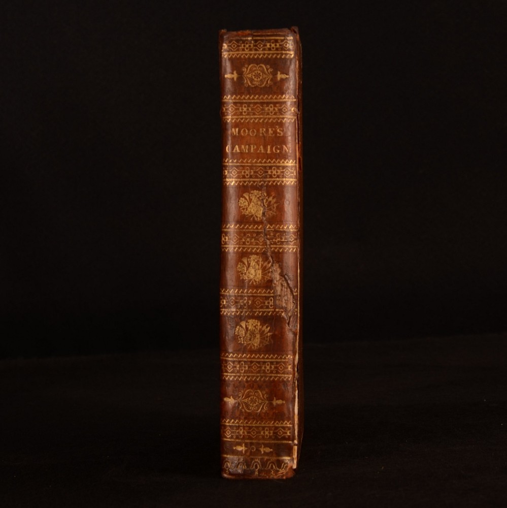 Click here to see our other books! A Narrative of the Campaign Of The British Army in Spain Commanded by His Excellency James Moore 1809 J Johnson : London 8.5" by 5.5" xvii, 388pp, 136pp SUMMARY An informative and illustrious narrative of the British army in Spain during the revolutionary war. Leather Binding Overall Condition: Good This book weighs 1 KG when packed UK Postage: £ 3.99 US Postage: £ 22.99 EU Postage : £ 16.99 European Postage: £ 17.99 Asia Postage: £ 22.99 Worldwide Postage: £ 28.99 DESCRIPTION Illustrated, with two folding plates that have hand coloured portions. One map is Spain and Portugal with the march of the British columns and the other is a plan of action at Corunna. The fourth edition of this work. In its first year of publication the work was reprinted five times before being revised and expanded for the fourth edition. Lieutenant-General Sir john Moore was a British army general also known as Moore of Corunna. He is remembered for his military training reforms. This work is compiled by Sir John Moore's brother, James Moore esq. The dedication of this work is to their mother. Comprising of a collection of letters between Moore and other individuals such as Lord Bentinck, Sir David Baird, Sir John Moore and others CONDITION In a full diced calf binding. Externally, sound with rubbing to the joints and extremities. Loss to the spine due to rubbing. Occasional marks to boards. Front joint and hinge are tender. Rear hinge is slightly strained but firm. Prior owner's inscription to the verso of front endpaper. Internally, firmly bound. Small closed tears to the second plate from the joint encroaching on the plate, no longer than 2.5 inches. Pages are generally bright, with just the odd spots. Overall Condition: Good GLOSSARY OF TERMS Overall Condition (Dustwrapper condition rating is shown after that for the book itself, where a dustwrapper is present) Fine - Very well preserved copy showing very little wear Very Good Indeed - Only one or two minor faults, really a very attractive copy Very Good - Quite a wide term meaning no major faults but probably several smaller ones often expected given the age of the book, but still a respectable copy Good - Meaning not very good. Some more serious faults as will be described in the condition report under 'condition' Good Only - Meaning one or more faults that could really do with repair Fair - As with good only above but with other faults leaving a compromised copy even after repair Poor - Really bad and possibly seriously incomplete. We only sell books in this condition where their rarity or value makes them attractive none the less. Major defects will be described. GUARANTEE We offer a full money back guarantee on our descriptions. Please ask for details and conditions. We prefer PAYPAL. If you pay via PAYPAL we will post the item off the same or the next working day with the postage you have selected. Please note we cannot accept USD cheques