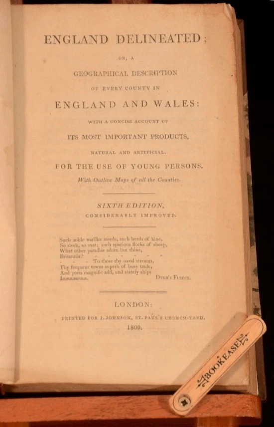 Click here to see our other books! England Delineated: a geographical description of every country in England and Wales Anonymous 1809 J Johnson : London 7.5" by 4.5" (viii) 358pp, 36p SUMMARY An interesting volume on the geography of England and Wales. Folding Maps,Leather Binding Overall Condition: Very Good This book weighs 0.5 KG when packed UK Postage: £ 3.99 US Postage: £ 15.99 EU Postage : £ 13.99 European Postage: £ 14.99 Asia Postage: £ 18.99 Worldwide Postage: £ 19.99 DESCRIPTION Covers a wide range of locations, including Cumberland, Gloucestershire and Devonshire. Each chapter looks at the history, landscape and trade of the area. It also includes information on noteworthy landmarks. Illustrated throughout with 33 plates of maps. CONDITION Rebound in a half calf binding. Externally, very smart. Light bumping to extremities. Map before title page torn, with half remaining. Internally, firmly bound. Pages are generally clean though lightly age-toning throughout. Overall Condition: Very Good GLOSSARY OF TERMS Overall Condition (Dustwrapper condition rating is shown after that for the book itself, where a dustwrapper is present) Fine - Very well preserved copy showing very little wear Very Good Indeed - Only one or two minor faults, really a very attractive copy Very Good - Quite a wide term meaning no major faults but probably several smaller ones often expected given the age of the book, but still a respectable copy Good - Meaning not very good. Some more serious faults as will be described in the condition report under 'condition' Good Only - Meaning one or more faults that could really do with repair Fair - As with good only above but with other faults leaving a compromised copy even after repair Poor - Really bad and possibly seriously incomplete. We only sell books in this condition where their rarity or value makes them attractive none the less. Major defects will be described. GUARANTEE We offer a full money back guarantee on our descriptions. Please ask for details and conditions. We prefer PAYPAL. If you pay via PAYPAL we will post the item off the same or the next working day with the postage you have selected. Please note we cannot accept USD cheques