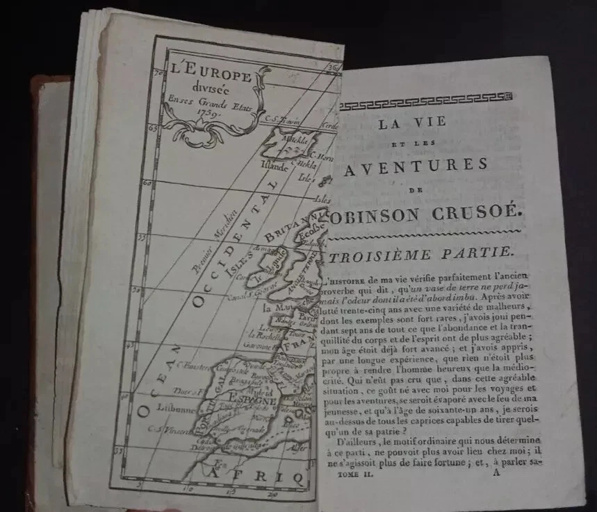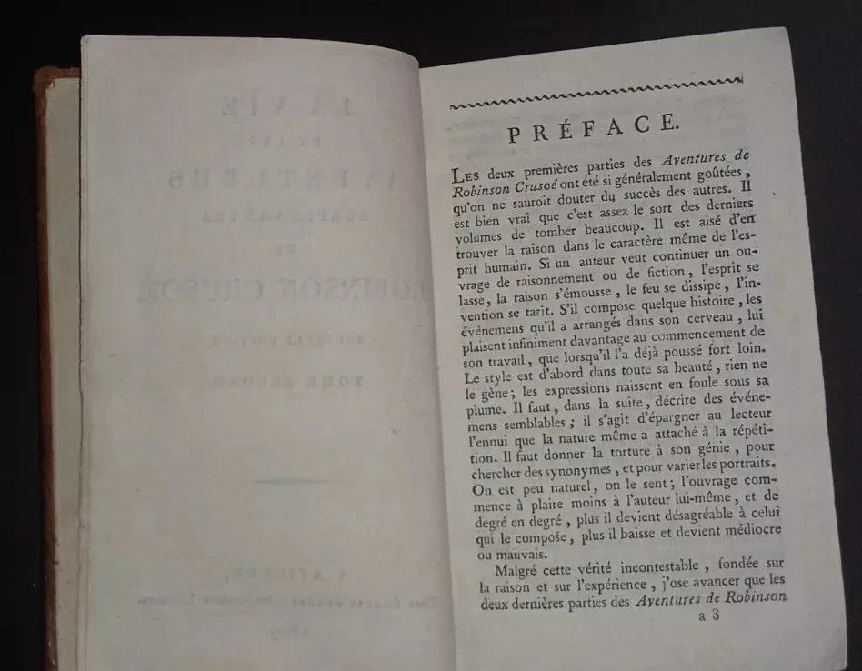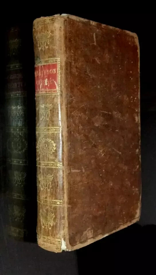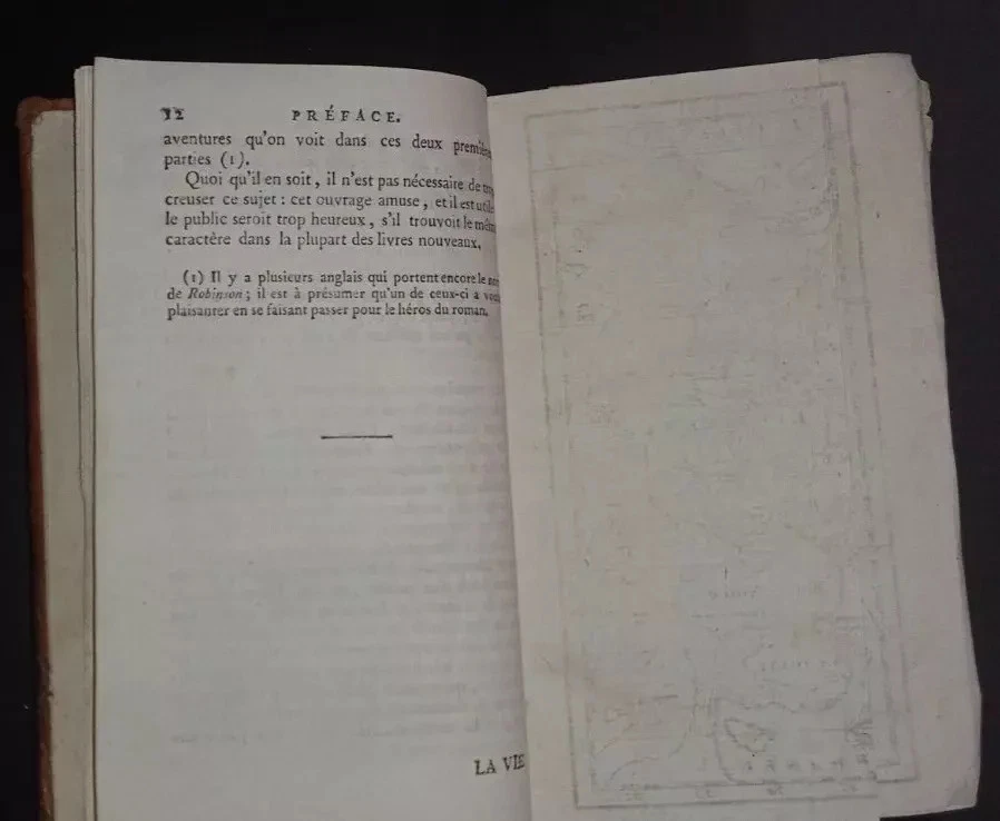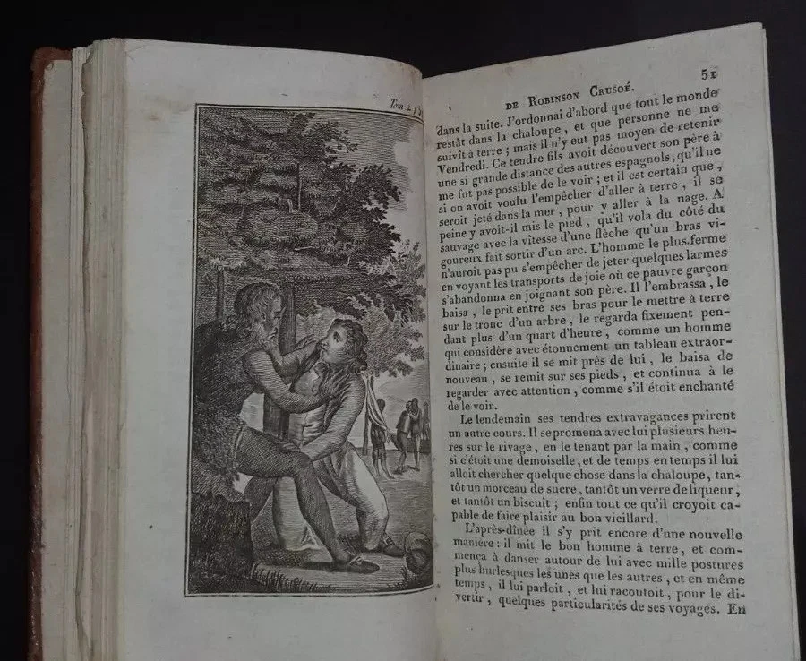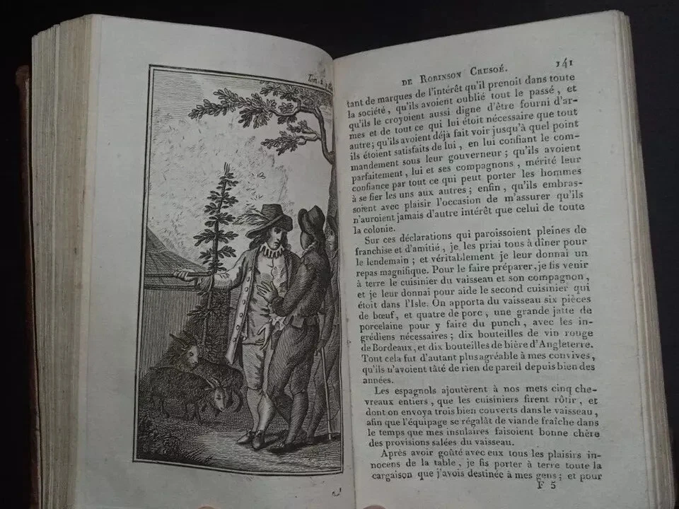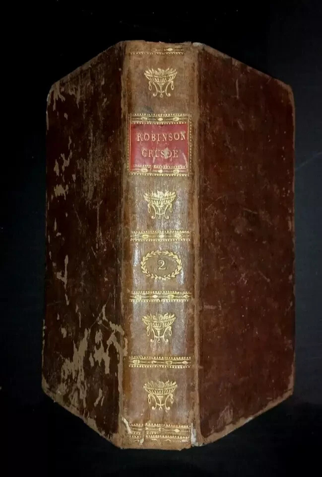 “ The Life and Strange Surprising Adventures of Robinson Crusoe / La Vie et les Aventures Surprenantes de Robinson Crusoe; contenant son retour dans son Isle, ses autres nouveaux voyages et ses réflexions ” by Daniel Defoe*. Tome II. Published/printed by Seguin Freres in Avignon during the year MDCCCIX (1809). Illustrated with a fold-out map, as well as with 4 engraved plates. Leather binding. Text in french. 368 pages, 17 x 11 x 3 cm. Acceptable/Good condition in general (inner binding issues, binding not so tight, book does not open perfectly, needs to be handled with care to avoid its condition deterioration, merely worn cover where stains, scratches, rubbed/discolored/splotchy parts, cracks and holes on spine, fragile parts and from which pieces are missing from boards' surface/corners/edges/spine, foxing, yellow/brown stains, few creases, minor piece of paper missing from few leaves' corners/margin not affecting text, some leaves more-foxed-than-the-average, few water-stains too, paper merely creasy and worn on map where tiny tears and creases on its margins, &c). Shipping costs via registered mail (tracking number provided): $16. Robinson Crusoe is a novel by Daniel Defoe that was first published in 1719. The book is a fictional autobiography of the title character-a castaway who spends 28 years on a remote tropical island near Venezuela, encountering Native Americans, captives and mutineers before being rescued. The story was perhaps influenced by Alexander Selkirk, a Scottish castaway who lived for four years on the Pacific island called "Más a Tierra" (in 1966 its name was changed to Robinson Crusoe Island), Chile. The details of Crusoe's island were probably based on the Caribbean island of Tobago, since that island lies a short distance north of the Venezuelan coast near the mouth of the Orinoco river, in sight of Trinidad. It is also likely that Defoe was inspired by the Latin or English translations of Ibn Tufail's Hayy ibn Yaqdhan, an earlier novel also set on a desert island. Another source for Defoe's novel may have been Robert Knox's account of his abduction by the King of Ceylon in 1659 in "An Historical Account of the Island Ceylon," Glasgow: James MacLehose and Sons (Publishers to the University), 1911. * Daniel Defoe (ca. 1659/1661-1731), born Daniel Foe, was an English trader, writer, journalist, and pamphleteer, who gained fame for his novel Robinson Crusoe. Defoe is notable for being one of the earliest proponents of the novel, as he helped to popularise the form in Britain and along with others such as Richardson, is among the founders of the English novel. A prolific and versatile writer, he wrote more than 500 books, pamphlets and journals on various topics (including politics, crime, religion, marriage, psychology and the supernatural). He was also a pioneer of economic journalism. Robinson Crusoe was frequently revised for educational purposes during the period when the exposition of pedagogical theories was becoming one of the leading pastimes of society. The most successful adaptation was probably that of Feutry, which appeared at Amsterdam in 1766. Abridged directly from the translation of Saint-Hyacinthe and Van Effen, Feutry’s version was in general quite meritorious, though it failed to convey an adequate impression of Defoe’s mentality. A rival adaptation was published in the following year by Montreille, who failed however to gain the approval of the critics.