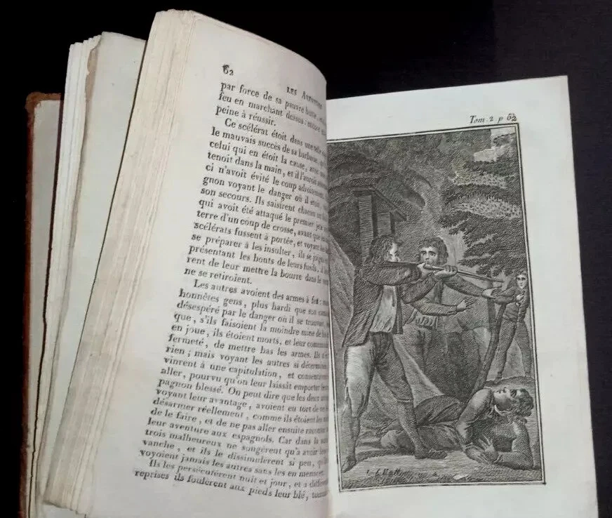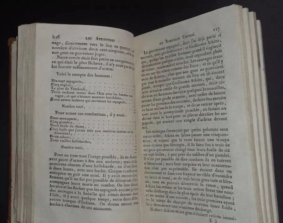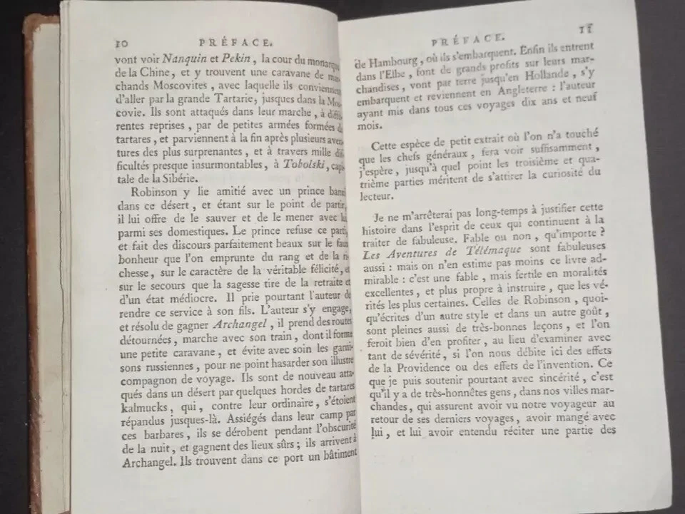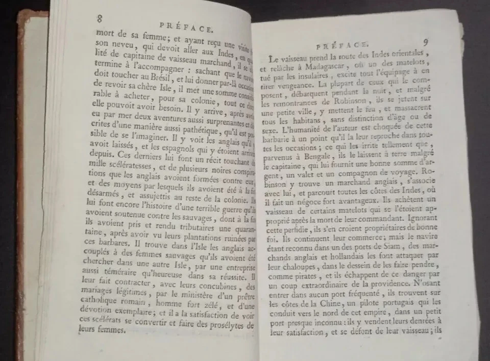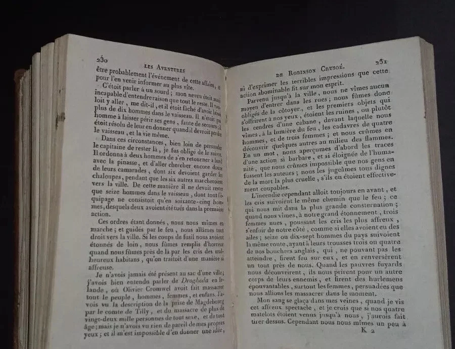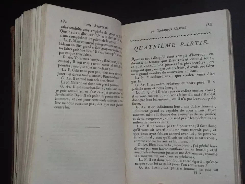 “ The Life and Strange Surprising Adventures of Robinson Crusoe / La Vie et les Aventures Surprenantes de Robinson Crusoe; contenant son retour dans son Isle, ses autres nouveaux voyages et ses réflexions ” by Daniel Defoe*. Tome II. Published/printed by Seguin Freres in Avignon during the year MDCCCIX (1809). Illustrated with a fold-out map, as well as with 4 engraved plates. Leather binding. Text in french. 368 pages, 17 x 11 x 3 cm. Acceptable/Good condition in general (inner binding issues, binding not so tight, book does not open perfectly, needs to be handled with care to avoid its condition deterioration, merely worn cover where stains, scratches, rubbed/discolored/splotchy parts, cracks and holes on spine, fragile parts and from which pieces are missing from boards' surface/corners/edges/spine, foxing, yellow/brown stains, few creases, minor piece of paper missing from few leaves' corners/margin not affecting text, some leaves more-foxed-than-the-average, few water-stains too, paper merely creasy and worn on map where tiny tears and creases on its margins, &c). Shipping costs via registered mail (tracking number provided): $16. Robinson Crusoe is a novel by Daniel Defoe that was first published in 1719. The book is a fictional autobiography of the title character-a castaway who spends 28 years on a remote tropical island near Venezuela, encountering Native Americans, captives and mutineers before being rescued. The story was perhaps influenced by Alexander Selkirk, a Scottish castaway who lived for four years on the Pacific island called "Más a Tierra" (in 1966 its name was changed to Robinson Crusoe Island), Chile. The details of Crusoe's island were probably based on the Caribbean island of Tobago, since that island lies a short distance north of the Venezuelan coast near the mouth of the Orinoco river, in sight of Trinidad. It is also likely that Defoe was inspired by the Latin or English translations of Ibn Tufail's Hayy ibn Yaqdhan, an earlier novel also set on a desert island. Another source for Defoe's novel may have been Robert Knox's account of his abduction by the King of Ceylon in 1659 in "An Historical Account of the Island Ceylon," Glasgow: James MacLehose and Sons (Publishers to the University), 1911. * Daniel Defoe (ca. 1659/1661-1731), born Daniel Foe, was an English trader, writer, journalist, and pamphleteer, who gained fame for his novel Robinson Crusoe. Defoe is notable for being one of the earliest proponents of the novel, as he helped to popularise the form in Britain and along with others such as Richardson, is among the founders of the English novel. A prolific and versatile writer, he wrote more than 500 books, pamphlets and journals on various topics (including politics, crime, religion, marriage, psychology and the supernatural). He was also a pioneer of economic journalism. Robinson Crusoe was frequently revised for educational purposes during the period when the exposition of pedagogical theories was becoming one of the leading pastimes of society. The most successful adaptation was probably that of Feutry, which appeared at Amsterdam in 1766. Abridged directly from the translation of Saint-Hyacinthe and Van Effen, Feutry’s version was in general quite meritorious, though it failed to convey an adequate impression of Defoe’s mentality. A rival adaptation was published in the following year by Montreille, who failed however to gain the approval of the critics.