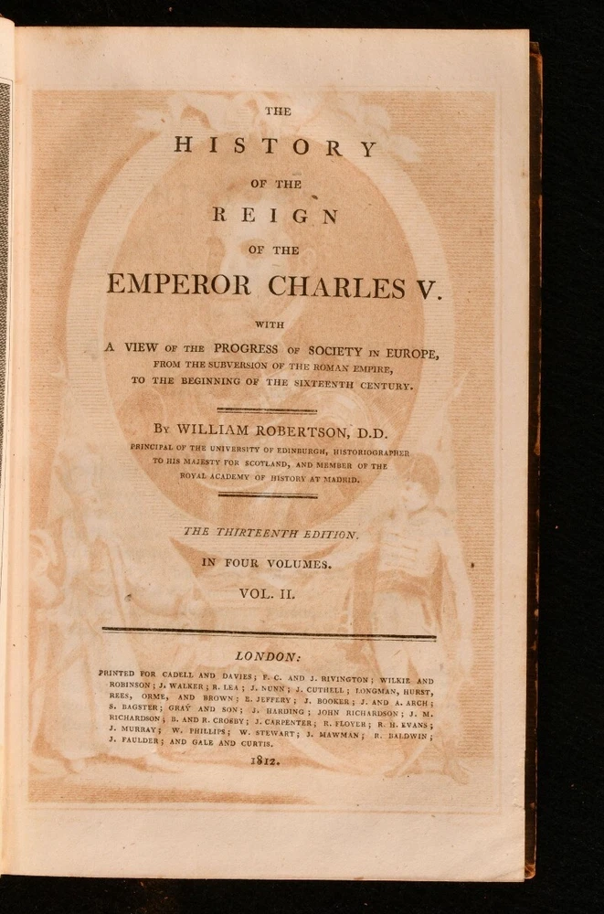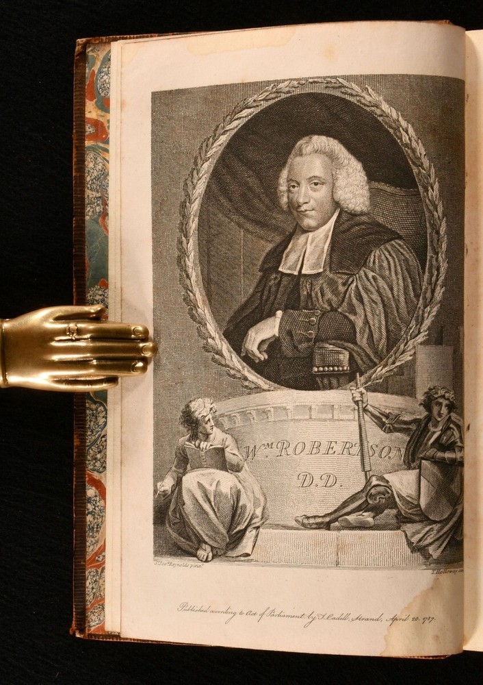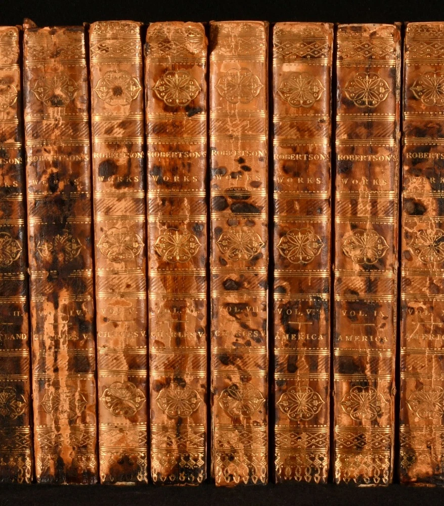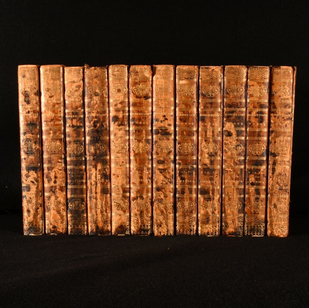 Click here to see our other books! The Works of William Robertson William Robertson 1809-12 T. Cadell and W. Davies : London 8.5" by 5.5" [5], vi-viii, [5], 2-416; [5], 2-430; [5], 2-490; [10], x-xv, [2], 2-500; [5], 2-376; [5], 2-459;[5], 2-420; [5], vi-li, [2], 2-383; [5], 2-432; [2], 2-435; [5], 2-418; [3], iv-vi, [3], 2-384, [19pp] SUMMARY A complete collection of the history works of William Robertson, illustrated throughout with folding maps. Folding Maps,Illustrated,Leather Binding Overall Condition: Good Only This book weighs 8 KG when packed UK Postage: £ 4.49 US Postage: £ 57.99 EU Postage : £ 33.99 European Postage: £ 59.99 Asia Postage: £ 99.99 Worldwide Postage: £ 199.99 DESCRIPTION Complete in twelve volumes. A collection of the detailed history works by William Robertson. Containing; 'The History of Scotland', complete in three volumes, published in 1809, the eighteenth edition of the work. Volume I illustrated with a frontispiece. 'The History of the Reign of the Emperor Charles V', complete in four volumes, published in 1812. The thirteenth edition of this work. Frontispiece to each of the four volumes. 'The History of America', complete in four volumes, published in 1812. The twelfth edition of this work. Volume I illustrated with a folding map. Volume II illustrated with three folding maps, and one folding plate. 'An Historical Disquisition Concerning the Knowledge Which the Ancients Had of India', complete in one volume published in 1812, the sixth edition of this work. Illustrated with two folding maps. Half-titles to each volume except Volumes I and XII. Bookplate to the front pastedowns. CONDITION In a full calf binding. Externally, generally smart, with rubbing and discolouration to the spines. Rear boards of Volumes II, and IV are detached but present. Front board of Volume IV may detach with further handling. Rear board of Volume VII may detach with further handling. Front board of Volume IX is detached but present, the rear board may detach with further handling. Front board of Volume XII is detached but present. Some fading to the front board of Volume I. Some minor marks and small patches of rubbing to the boards and spines. Heavier rubbing to the rear board of Volume I. Light bumping to the extremities. Some light loss to the heads and tails of the spines, a little heavier to some volumes, with some wear to the spines. A small amount of lifting to the head of the spine of Volume VI. Light cracks to the joints. Front hinge of Volume I strained but remains firm. Front hinges of Volumes II, III, V, and VI, are starting but firm. Rear hinge of Volume I starting but firm. Rear hinge of Volume XII is weak. Hinges of Volume VII, VIII, and X are starting but firm. Internally, firmly bound. Pages are lightly age-toned with some light spots. Small tidemark to the tail of the frontispiece and front endpapers of Volume I. Small tidemark to the frontispiece of Volumes IV, V, VI. Small chip to the title page of Volume V, not affecting text. A few light spots to the folding maps and plates. Chip to the margin of page 259/260 of Volume XI, not affecting text. Overall Condition: Good Only GLOSSARY OF TERMS Overall Condition (Dustwrapper condition rating is shown after that for the book itself, where a dustwrapper is present) Fine - Very well preserved copy showing very little wear Very Good Indeed - Only one or two minor faults, really a very attractive copy Very Good - Quite a wide term meaning no major faults but probably several smaller ones often expected given the age of the book, but still a respectable copy Good - Meaning not very good. Some more serious faults as will be described in the condition report under 'condition' Good Only - Meaning one or more faults that could really do with repair Fair - As with good only above but with other faults leaving a compromised copy even after repair Poor - Really bad and possibly seriously incomplete. We only sell books in this condition where their rarity or value makes them attractive none the less. Major defects will be described. GUARANTEE We offer a full money back guarantee on our descriptions. Please ask for details and conditions. We prefer PAYPAL. If you pay via PAYPAL we will post the item off the same or the next working day with the postage you have selected. Please note we cannot accept USD cheques