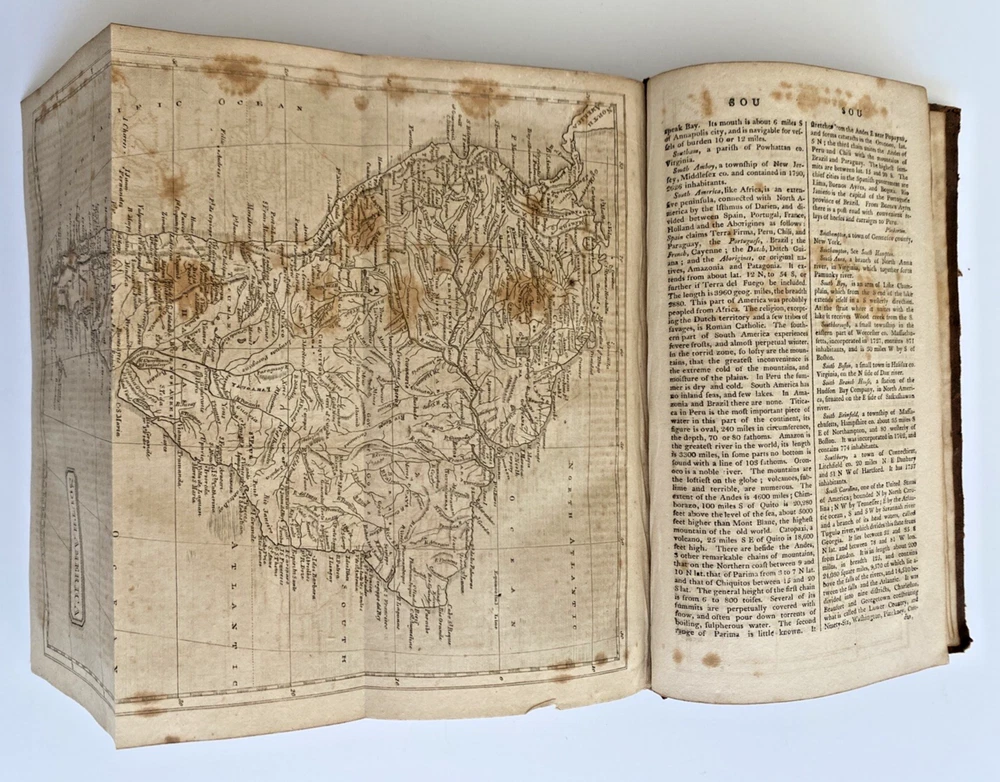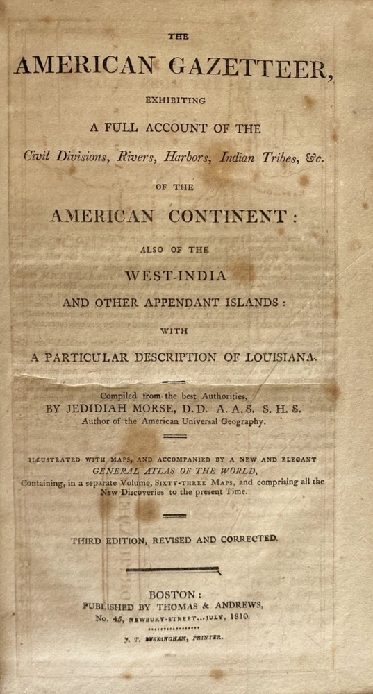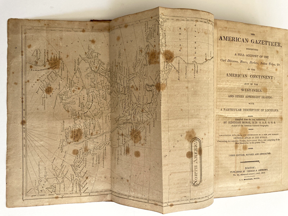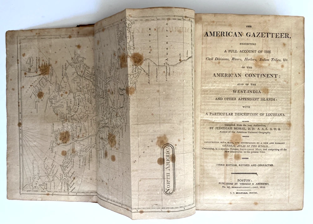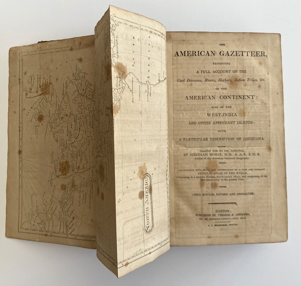 The American Gazetteer, Exhibiting a Full Account of the Civil Divisions, Rivers, Harbors, Indian Tribes, & c. of the American Continent: Also of the West-India and Other Appendant Islands: With a Particular Description of Louisiana By Jedediah Morse, Issued Boston, 1810 (undated) by Thomas & Andrews. Third edition revised and corrected. Estimating 800-1000 pages, unpaginated. Period brown full leather binding, smooth spine, black gilt spine label. In poor condition. Boards heavily scuffed, rubbed, and edge-worn, cover mostly detached. Pull out maps of North and South American very much intact, very scarce to find in this condition without tears or stains. Text block toned with some spotting foxing. Overall sound and despite any flaws, a very nice of an important early American Gazetteer, well worthy of ownership. Measures 5 1/2 x 8 3/4 x inches. Store item code MJBCSR. Photos are of the actual item being sold and they are to be considered part of the description. We consider all offers in relation to current market values and we try to respond almost immediately. Your purchase will be packed carefully and shipped quickly. We are available 7 days a week. Please see other listings for books and collectibles that might be of interest to you and follow North*Star*Collectibles as we post new items every week. Thank you for looking and come again soon, North*Star*Collectibles Member of the Ephemera Society of America and SNEAB Southern New England Antiquarian Booksellers