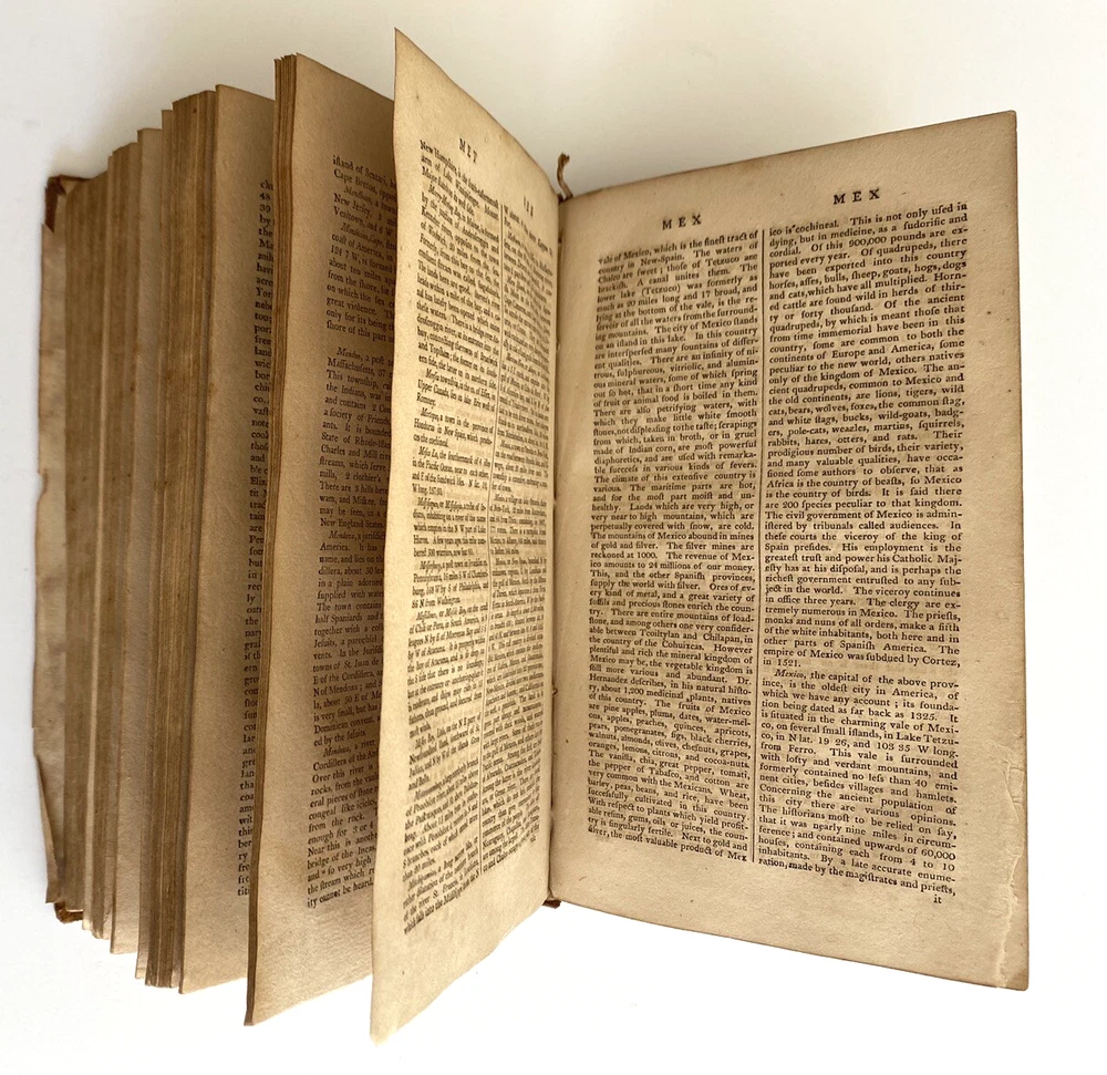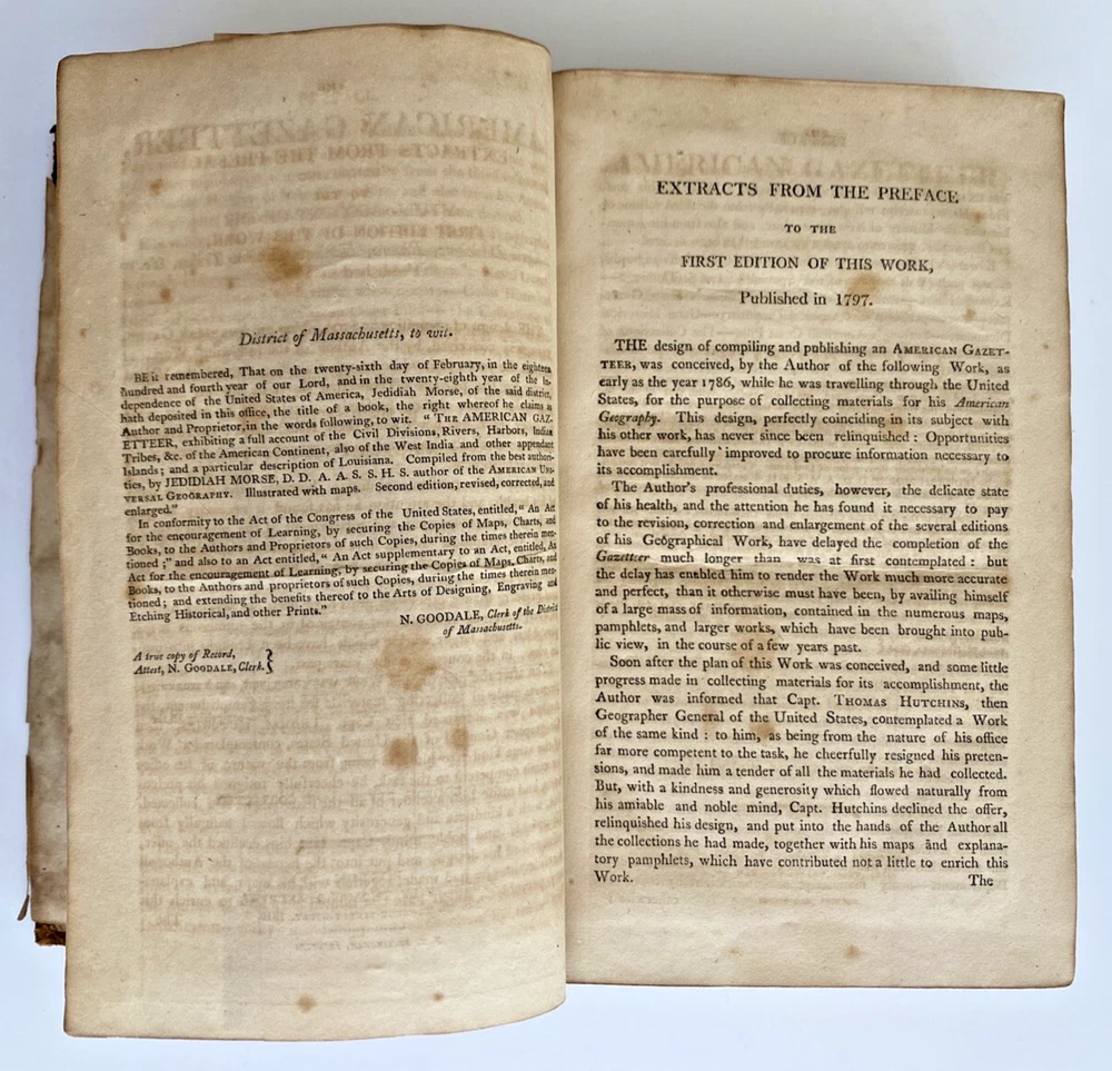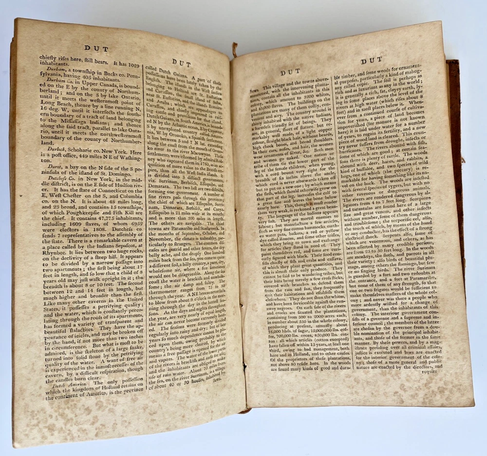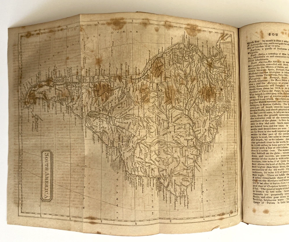 The American Gazetteer, Exhibiting a Full Account of the Civil Divisions, Rivers, Harbors, Indian Tribes, & c. of the American Continent: Also of the West-India and Other Appendant Islands: With a Particular Description of Louisiana By Jedediah Morse, Issued Boston, 1810 (undated) by Thomas & Andrews. Third edition revised and corrected. Estimating 800-1000 pages, unpaginated. Period brown full leather binding, smooth spine, black gilt spine label. In poor condition. Boards heavily scuffed, rubbed, and edge-worn, cover mostly detached. Pull out maps of North and South American very much intact, very scarce to find in this condition without tears or stains. Text block toned with some spotting foxing. Overall sound and despite any flaws, a very nice of an important early American Gazetteer, well worthy of ownership. Measures 5 1/2 x 8 3/4 x inches. Store item code MJBCSR. Photos are of the actual item being sold and they are to be considered part of the description. We consider all offers in relation to current market values and we try to respond almost immediately. Your purchase will be packed carefully and shipped quickly. We are available 7 days a week. Please see other listings for books and collectibles that might be of interest to you and follow North*Star*Collectibles as we post new items every week. Thank you for looking and come again soon, North*Star*Collectibles Member of the Ephemera Society of America and SNEAB Southern New England Antiquarian Booksellers