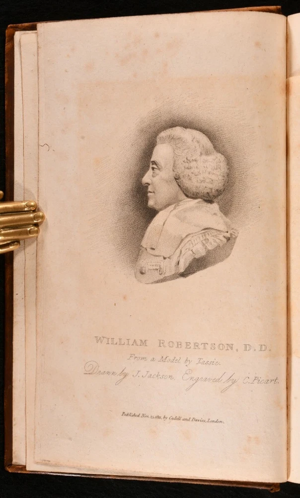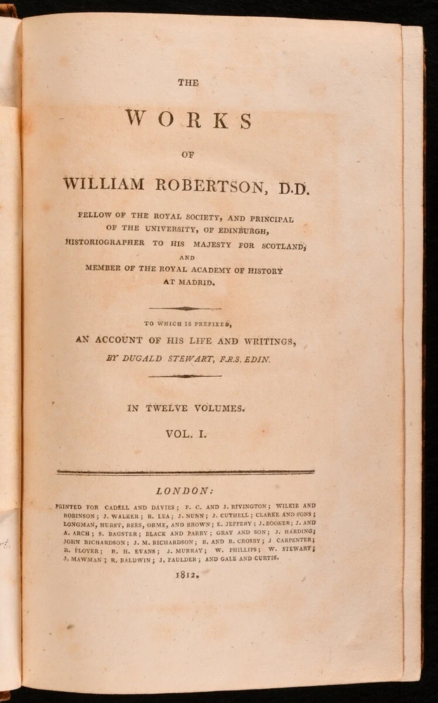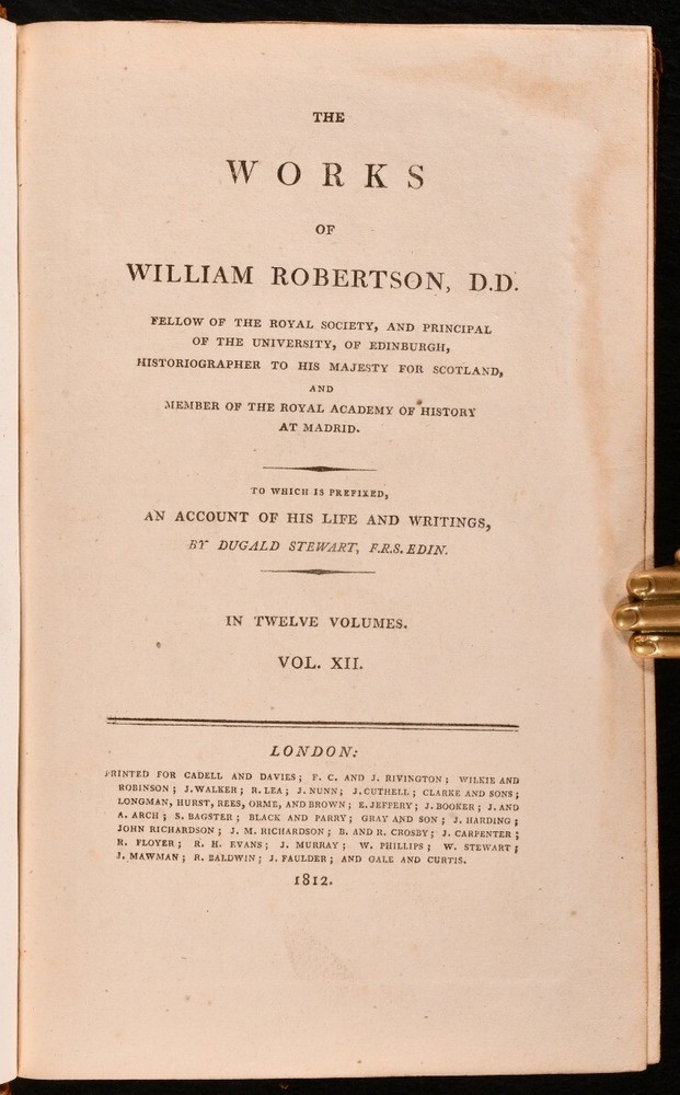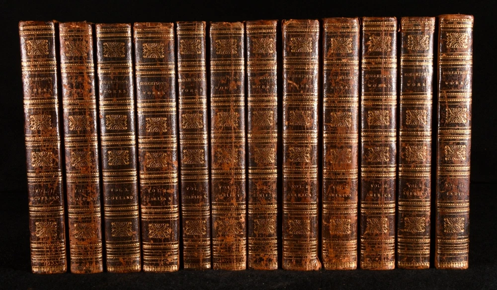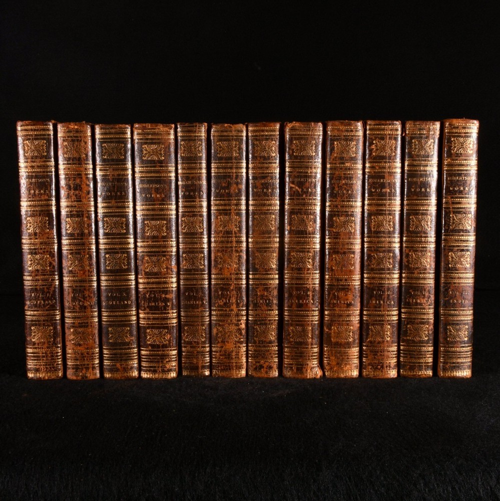 Click here to see our other books! The Works of William Robertson William Robertson 1812 Cadell and Davies : London 9" by 6" xii [5], 2-429; 430; 490; 500; 376; 459; 420; 383; 432; 435; 413; 403pp SUMMARY A twelve volume set of the historical works of William Robertson. Illustrated with numerous folding maps, this is a fascinating eighteenth century view of the history of Scotland, South America and India, along with a study of the life of Charles V. Folding Maps,Folding Plates,Illustrated,Leather Binding Overall Condition: Very Good This book weighs 10 KG when packed UK Postage: £ 4.49 US Postage: £ 68.99 EU Postage : £ 36.99 European Postage: £ 65.99 Asia Postage: £ 129.99 Worldwide Postage: £ 229.99 DESCRIPTION The complete works of Church of Scotland minister and historian William Robertson are bound in twelve smart full calf volumes. A significant figure in the Scottish Enlightenment and also of the moderate forces within the Church of Scotland, Robertson was assigned Moderator of the General Assembly of the Church of Scotland in 1763, and Historiographer Royal in 1764, reviving a role within the Royal household in Scotland that had been in abeyance from 1709 until 1763. Volumes I to III consist of 'The History of Scotland', and begin with an account of his Life and Writings, by Dugald Stewart, with a portrait frontispiece to volume I. Volumes IV to VII detail 'The History of the Reign of the Emperor Charles V', with each volume featuring an engraved frontispiece. Volumes VIII to XI contain Robertson's 'History of America'. Volume VIII features two large folding maps, the first displaying the Gulf of Mexico, and the second a map of South America. Volume IX features a folding map of Mexico under Spanish rule, volume X a folding map of 'The Islands of the South Seas', and volume XI an illustrated folding plate. Finally, volume XII is 'An Historical Disquisition Concerning the Knowledge which the Ancients had of India', and is illustrated with two folding maps of the region. CONDITION In full calf bindings, with gilt detailing to back strips. Light rubbing to back strips, and board extremities. Front board of vol VIII detached. Rubbing to all joints, with boards holding firm. Internally, firmly bound. Pages generally clean and bright, with the odd spot. One map from volume XII is detached, but present, with a tear to the top left corner. Overall Condition: Very Good GLOSSARY OF TERMS Overall Condition (Dustwrapper condition rating is shown after that for the book itself, where a dustwrapper is present) Fine - Very well preserved copy showing very little wear Very Good Indeed - Only one or two minor faults, really a very attractive copy Very Good - Quite a wide term meaning no major faults but probably several smaller ones often expected given the age of the book, but still a respectable copy Good - Meaning not very good. Some more serious faults as will be described in the condition report under 'condition' Good Only - Meaning one or more faults that could really do with repair Fair - As with good only above but with other faults leaving a compromised copy even after repair Poor - Really bad and possibly seriously incomplete. We only sell books in this condition where their rarity or value makes them attractive none the less. Major defects will be described. GUARANTEE We offer a full money back guarantee on our descriptions. Please ask for details and conditions. We prefer PAYPAL. If you pay via PAYPAL we will post the item off the same or the next working day with the postage you have selected. Please note we cannot accept USD cheques