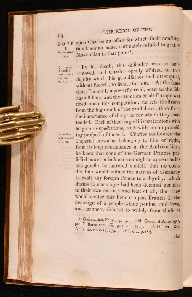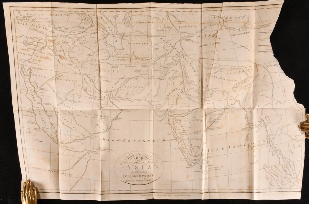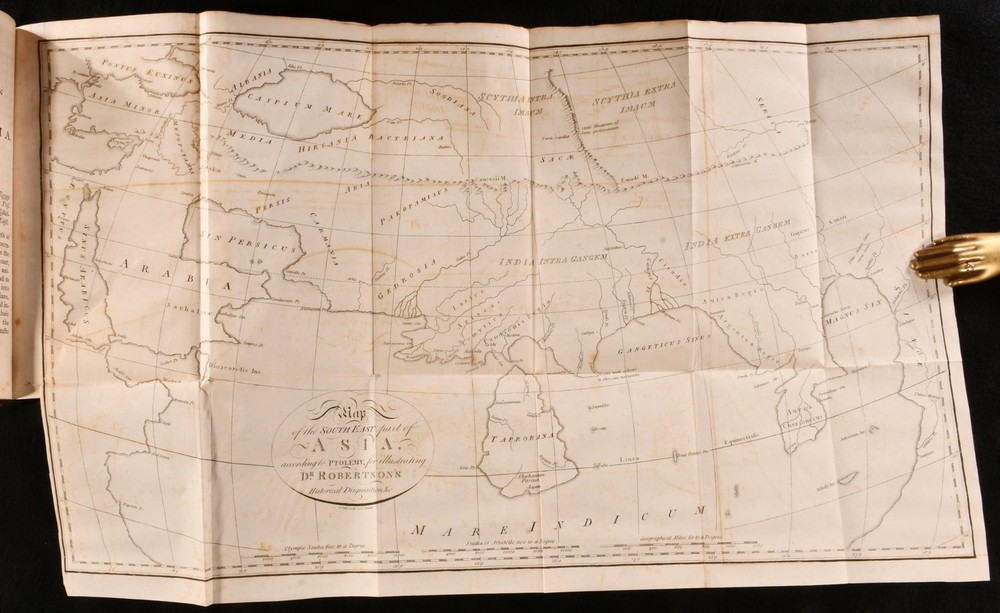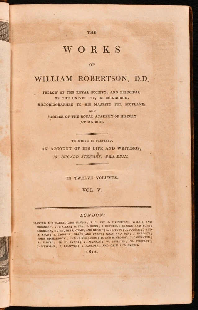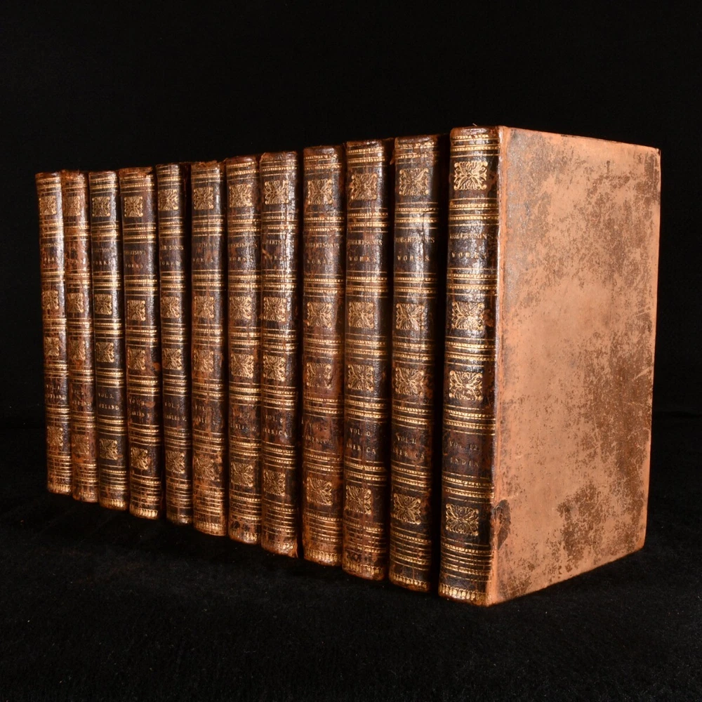 Click here to see our other books! The Works of William Robertson William Robertson 1812 Cadell and Davies : London 9" by 6" xii [5], 2-429; 430; 490; 500; 376; 459; 420; 383; 432; 435; 413; 403pp SUMMARY A twelve volume set of the historical works of William Robertson. Illustrated with numerous folding maps, this is a fascinating eighteenth century view of the history of Scotland, South America and India, along with a study of the life of Charles V. Folding Maps,Folding Plates,Illustrated,Leather Binding Overall Condition: Very Good This book weighs 10 KG when packed UK Postage: £ 4.49 US Postage: £ 68.99 EU Postage : £ 36.99 European Postage: £ 65.99 Asia Postage: £ 129.99 Worldwide Postage: £ 229.99 DESCRIPTION The complete works of Church of Scotland minister and historian William Robertson are bound in twelve smart full calf volumes. A significant figure in the Scottish Enlightenment and also of the moderate forces within the Church of Scotland, Robertson was assigned Moderator of the General Assembly of the Church of Scotland in 1763, and Historiographer Royal in 1764, reviving a role within the Royal household in Scotland that had been in abeyance from 1709 until 1763. Volumes I to III consist of 'The History of Scotland', and begin with an account of his Life and Writings, by Dugald Stewart, with a portrait frontispiece to volume I. Volumes IV to VII detail 'The History of the Reign of the Emperor Charles V', with each volume featuring an engraved frontispiece. Volumes VIII to XI contain Robertson's 'History of America'. Volume VIII features two large folding maps, the first displaying the Gulf of Mexico, and the second a map of South America. Volume IX features a folding map of Mexico under Spanish rule, volume X a folding map of 'The Islands of the South Seas', and volume XI an illustrated folding plate. Finally, volume XII is 'An Historical Disquisition Concerning the Knowledge which the Ancients had of India', and is illustrated with two folding maps of the region. CONDITION In full calf bindings, with gilt detailing to back strips. Light rubbing to back strips, and board extremities. Front board of vol VIII detached. Rubbing to all joints, with boards holding firm. Internally, firmly bound. Pages generally clean and bright, with the odd spot. One map from volume XII is detached, but present, with a tear to the top left corner. Overall Condition: Very Good GLOSSARY OF TERMS Overall Condition (Dustwrapper condition rating is shown after that for the book itself, where a dustwrapper is present) Fine - Very well preserved copy showing very little wear Very Good Indeed - Only one or two minor faults, really a very attractive copy Very Good - Quite a wide term meaning no major faults but probably several smaller ones often expected given the age of the book, but still a respectable copy Good - Meaning not very good. Some more serious faults as will be described in the condition report under 'condition' Good Only - Meaning one or more faults that could really do with repair Fair - As with good only above but with other faults leaving a compromised copy even after repair Poor - Really bad and possibly seriously incomplete. We only sell books in this condition where their rarity or value makes them attractive none the less. Major defects will be described. GUARANTEE We offer a full money back guarantee on our descriptions. Please ask for details and conditions. We prefer PAYPAL. If you pay via PAYPAL we will post the item off the same or the next working day with the postage you have selected. Please note we cannot accept USD cheques