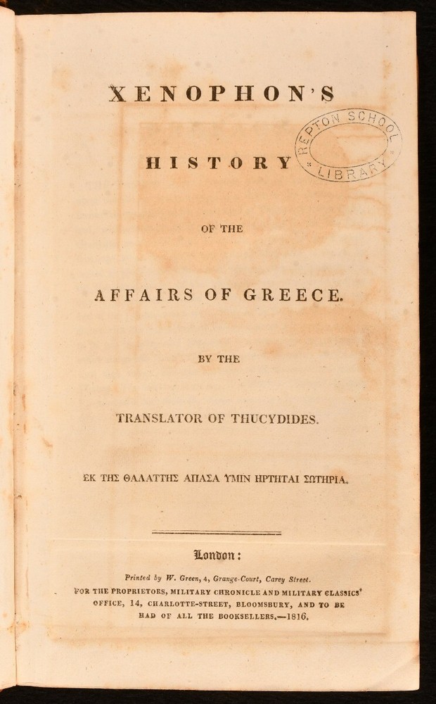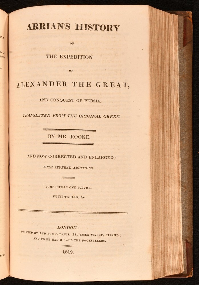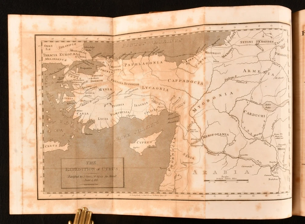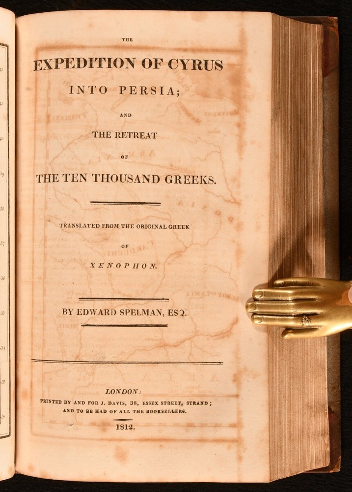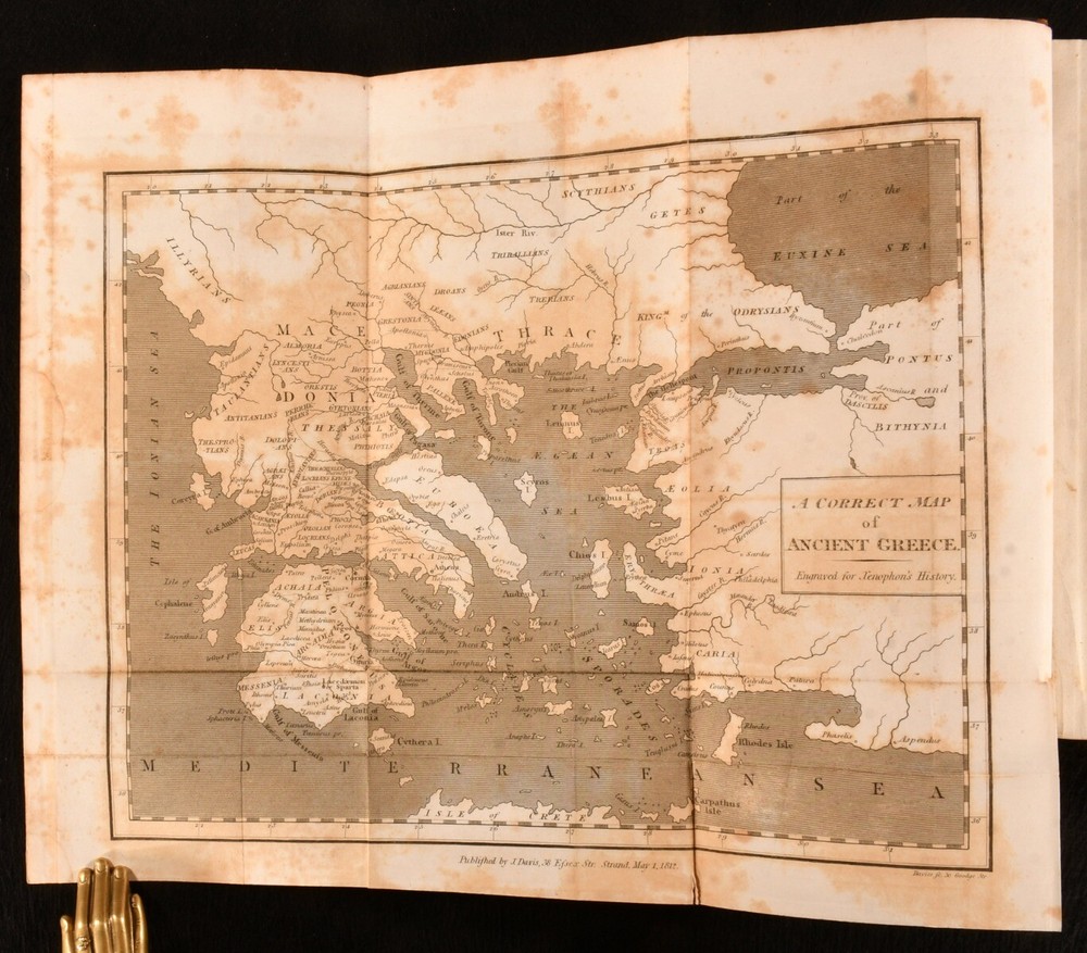 Click here to see our other books! Xenephon's History of the Affairs of Greece; The Expedition of Cyrus into Persia; Arrian's History of the Expedition of Alexander the Great Xenophon; Edward Spelman; William Smith; Arrian; Mr. Rooke 1812-1816 W. Green; J. Davis : London 10" by 6.5" iv [1], 6-239; 272pp SUMMARY Three early nineteenth century English translations of the historical narratives of Xenophon of Athens and Arrian of Nicomedia. Folding Maps,Leather Binding,Very Scarce Overall Condition: Good This book weighs 1 KG when packed UK Postage: £ 3.99 US Postage: £ 22.99 EU Postage : £ 16.99 European Postage: £ 17.99 Asia Postage: £ 22.99 Worldwide Postage: £ 28.99 DESCRIPTION Three very scarce early nineteenth century works bound together. The first work is an 1816 edition of William Smith's translation of Xenophon's 'History of the Affairs of Greece', with a folding map frontispiece. The second work is and 1812 edition of Edward Spelman's translation of Xenophon's history of 'The Expedition of Cyrus into Persia'. Illustrated with a folding map frontispiece. The third work is Mr. Rooke's 1812 translation of Arrian's account of Alexander the Great's conquest of Persia. With the library bookplate of Repton School to the front pastedown, and their stamp to the title page of the first work. Two fascinating historical narratives by the Greek military leader, philosopher, and historian, who was elected commander of one of the biggest Greek mercenary armies of the Achaemenid Empire. For over two millennia, Xenophon's diverse talents fuelled the debate of whether to place him amongst history's greatest generals, historians or philosophers. CONDITION In a half morocco binding with paper covered boards. Joints starting, with boards firmly held. Bookplate to front pastedown. Internally, firmly bound. Stamp to first title page. Pages generally bright, but with instances of spotting and foxing throughout, most concentrated to folding maps and first and last few pages of each volume. Overall Condition: Good GLOSSARY OF TERMS Overall Condition (Dustwrapper condition rating is shown after that for the book itself, where a dustwrapper is present) Fine - Very well preserved copy showing very little wear Very Good Indeed - Only one or two minor faults, really a very attractive copy Very Good - Quite a wide term meaning no major faults but probably several smaller ones often expected given the age of the book, but still a respectable copy Good - Meaning not very good. Some more serious faults as will be described in the condition report under 'condition' Good Only - Meaning one or more faults that could really do with repair Fair - As with good only above but with other faults leaving a compromised copy even after repair Poor - Really bad and possibly seriously incomplete. We only sell books in this condition where their rarity or value makes them attractive none the less. Major defects will be described. GUARANTEE We offer a full money back guarantee on our descriptions. Please ask for details and conditions. We prefer PAYPAL. If you pay via PAYPAL we will post the item off the same or the next working day with the postage you have selected. Please note we cannot accept USD cheques