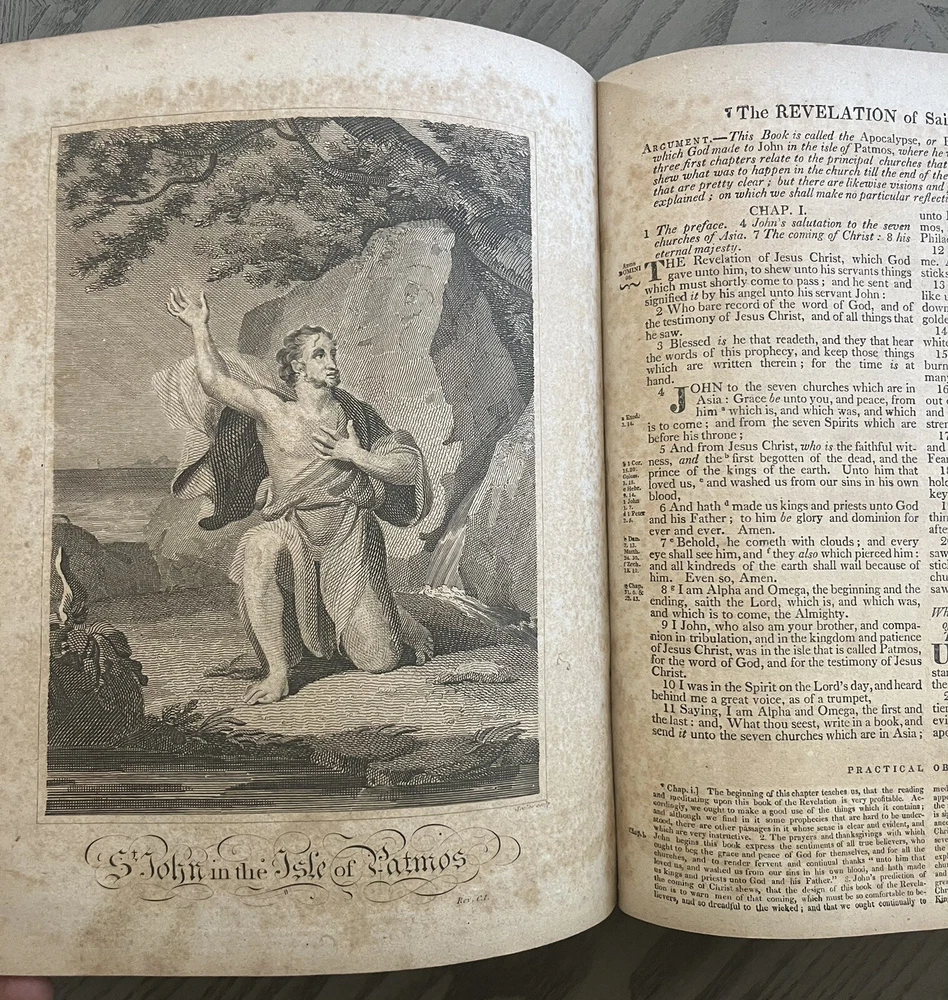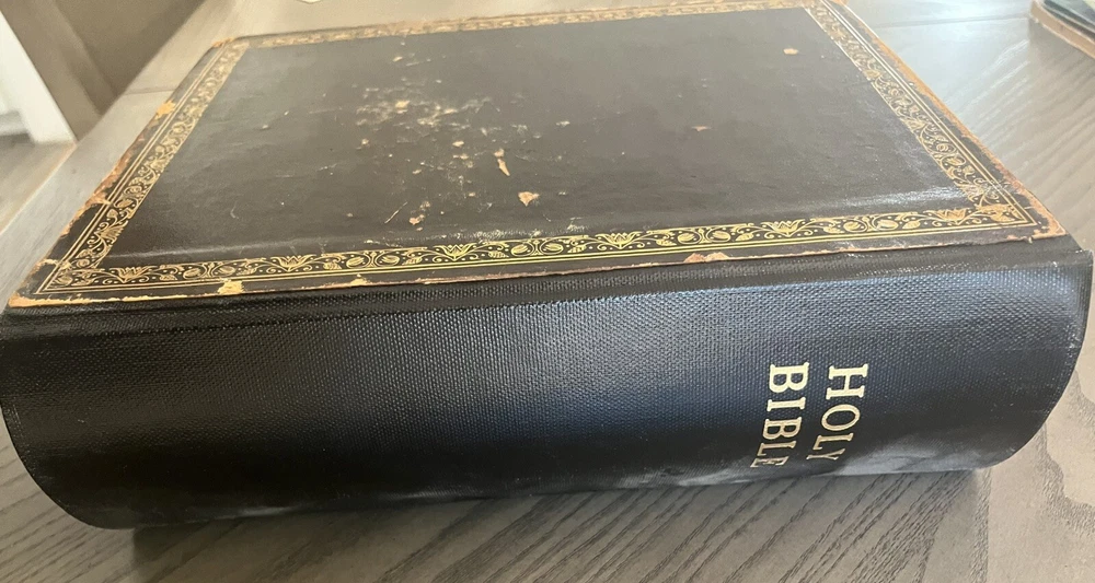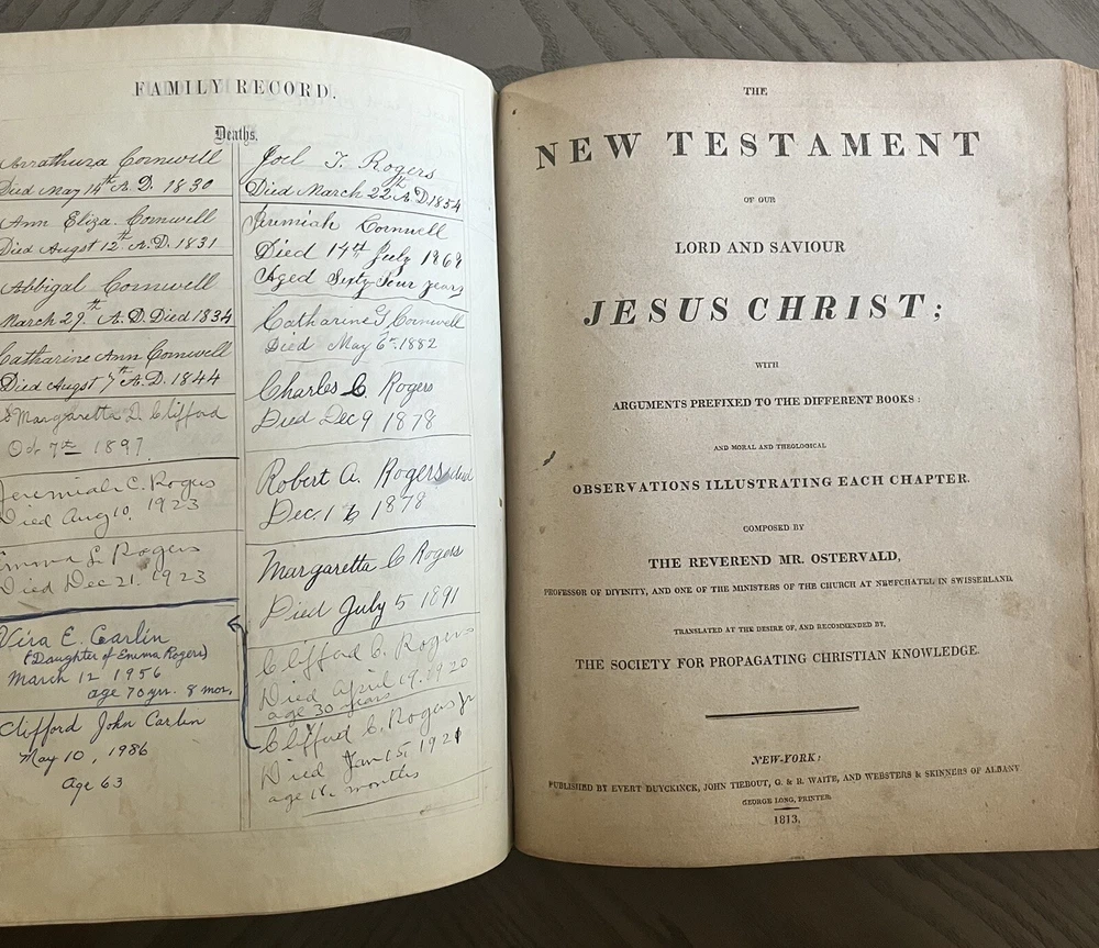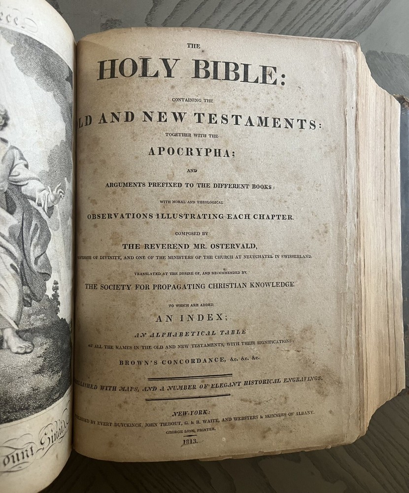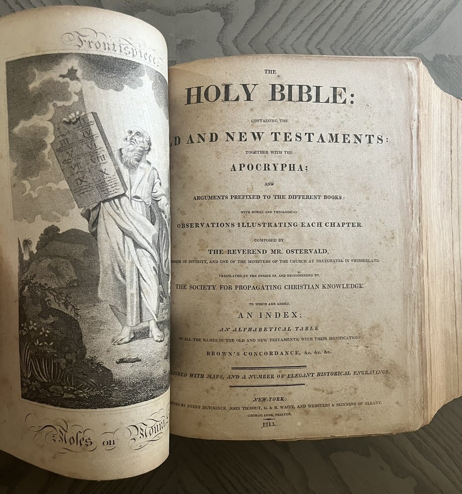 "The Holy Bible: Containing the Old and New Testa-ments: Together with the Apocrypha; and Arguments prefixed to the different Books: With moral and theological Observations illustrating each Chapter. Composed by the Reverend Mr. Ostervald, professor of Divinity, and one of the Ministers of the Church at Neufchatel in Swisserland. Translated at the desire of, and recommended by, | The Society for Propagating Christian Knowledge. To whichare added, An Index; An Alphabetical Table of all the Names in the Old and New Testa-ments, with their Significations; Brown's Concordance, &c., &c., &c. Embellished with Maps, and a Number of Elegant Historical Engravings. New York: Published by Evert Duyckinck, John Tiebout, G. & R. Waite, and Websters & Skinners of Albany. George Long, Printer. 1813." Massive family bible... with 2 pull out maps and engravings by John Scoles and Alexander Anderson! Old and New Testament. Original owners's name at center on cover J. and C. G. Cornwell (Jeremiah Cornwell and his wife, Catherine G. Dickison) Inside is a record of hand-written marriages and deaths. Last owners name embossed at bottom of cover, C. J. Carlin (c. 1986) Looks like a newer leather cover and/or repair work was done (c. 1986) Approximately 11 inches x 9 inches x 3 1/2 inches thick. (This work is listed in the 1861 reference publication entitled: A LIST OF EDITIONS OF THE HOLY SCRIPTURES AND PARTS THEREOF, PRINTED IN AMERICA PREVIOUS TO 1860: WITH INTRODUCTION AND BIBLIOGRAPHICAL NOTES. BY E. B. QUALLAGHAN. ALBANY MUNSELL & ROWLAND.) A magnificent old American bible, with illustrations, etc., sure to grace a collector's library.