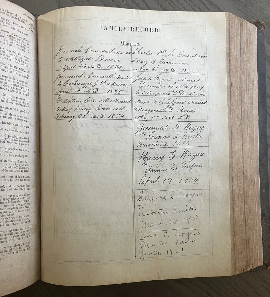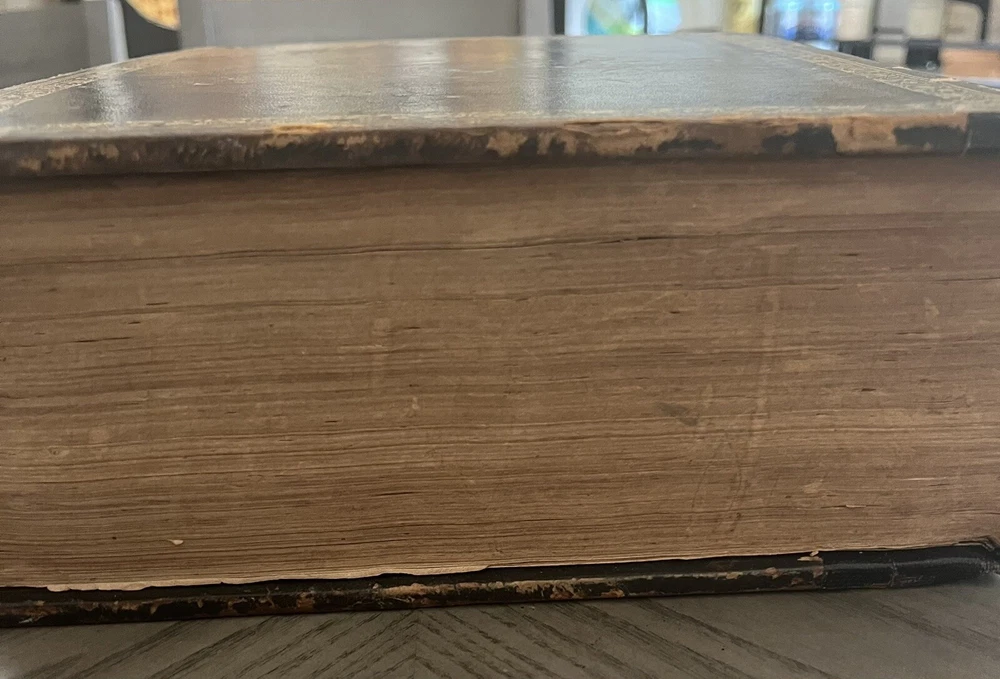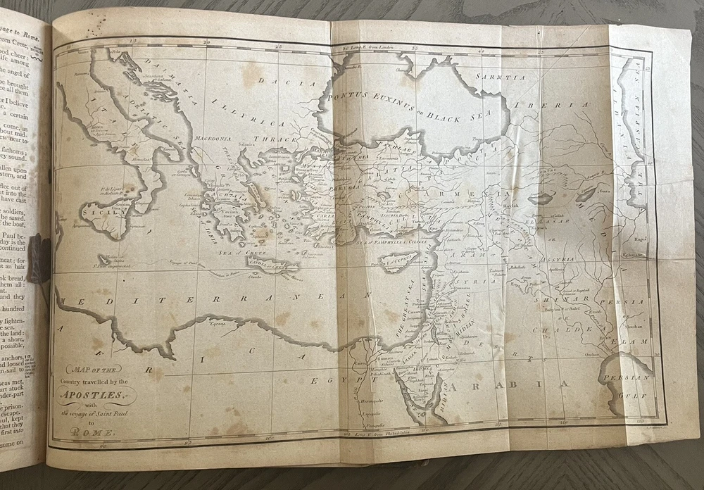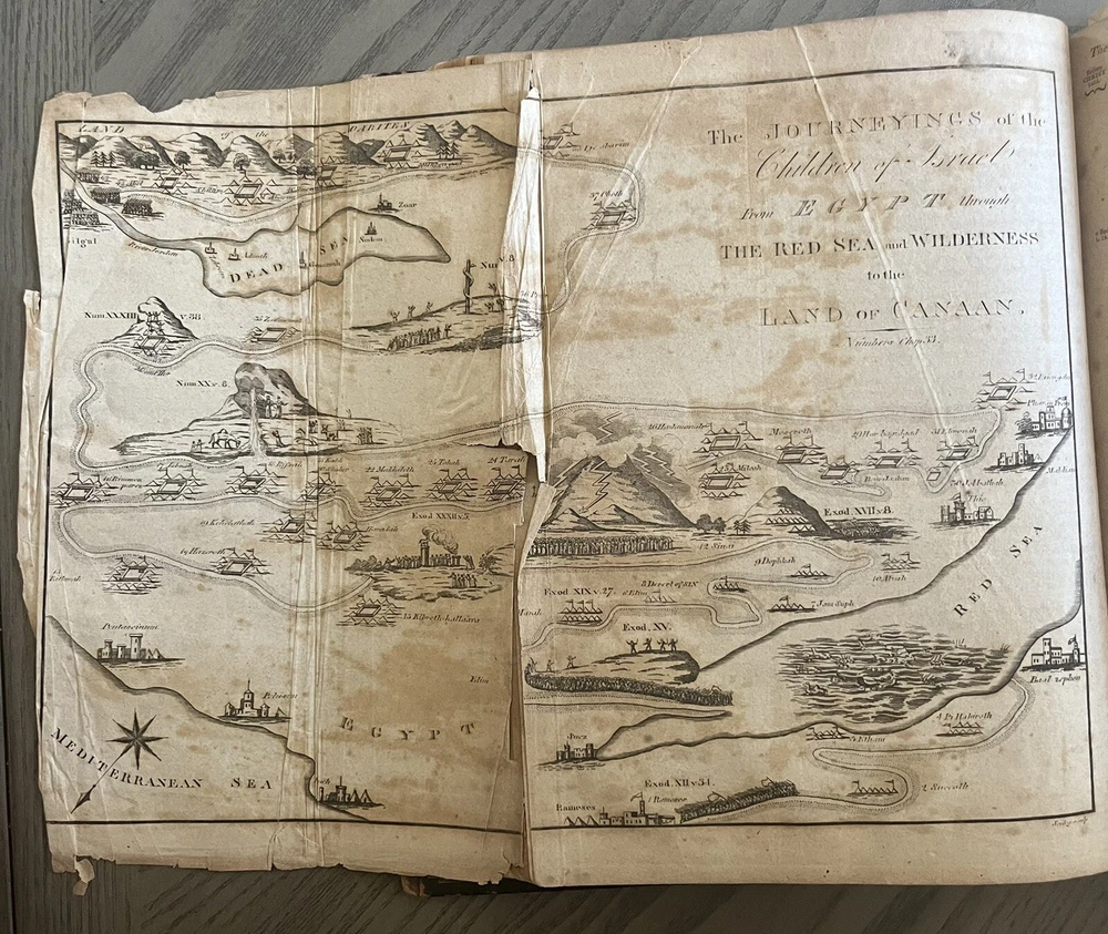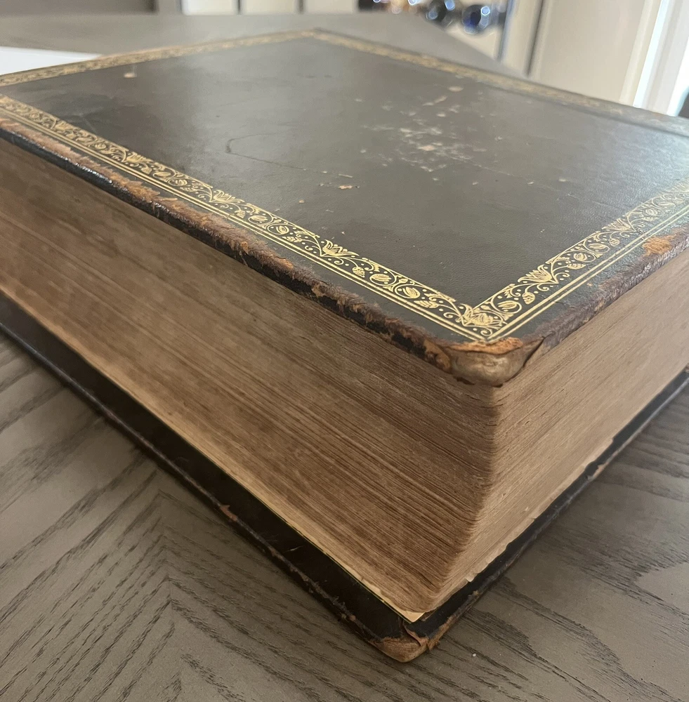 "The Holy Bible: Containing the Old and New Testa-ments: Together with the Apocrypha; and Arguments prefixed to the different Books: With moral and theological Observations illustrating each Chapter. Composed by the Reverend Mr. Ostervald, professor of Divinity, and one of the Ministers of the Church at Neufchatel in Swisserland. Translated at the desire of, and recommended by, | The Society for Propagating Christian Knowledge. To whichare added, An Index; An Alphabetical Table of all the Names in the Old and New Testa-ments, with their Significations; Brown's Concordance, &c., &c., &c. Embellished with Maps, and a Number of Elegant Historical Engravings. New York: Published by Evert Duyckinck, John Tiebout, G. & R. Waite, and Websters & Skinners of Albany. George Long, Printer. 1813." Massive family bible... with 2 pull out maps and engravings by John Scoles and Alexander Anderson! Old and New Testament. Original owners's name at center on cover J. and C. G. Cornwell (Jeremiah Cornwell and his wife, Catherine G. Dickison) Inside is a record of hand-written marriages and deaths. Last owners name embossed at bottom of cover, C. J. Carlin (c. 1986) Looks like a newer leather cover and/or repair work was done (c. 1986) Approximately 11 inches x 9 inches x 3 1/2 inches thick. (This work is listed in the 1861 reference publication entitled: A LIST OF EDITIONS OF THE HOLY SCRIPTURES AND PARTS THEREOF, PRINTED IN AMERICA PREVIOUS TO 1860: WITH INTRODUCTION AND BIBLIOGRAPHICAL NOTES. BY E. B. QUALLAGHAN. ALBANY MUNSELL & ROWLAND.) A magnificent old American bible, with illustrations, etc., sure to grace a collector's library.