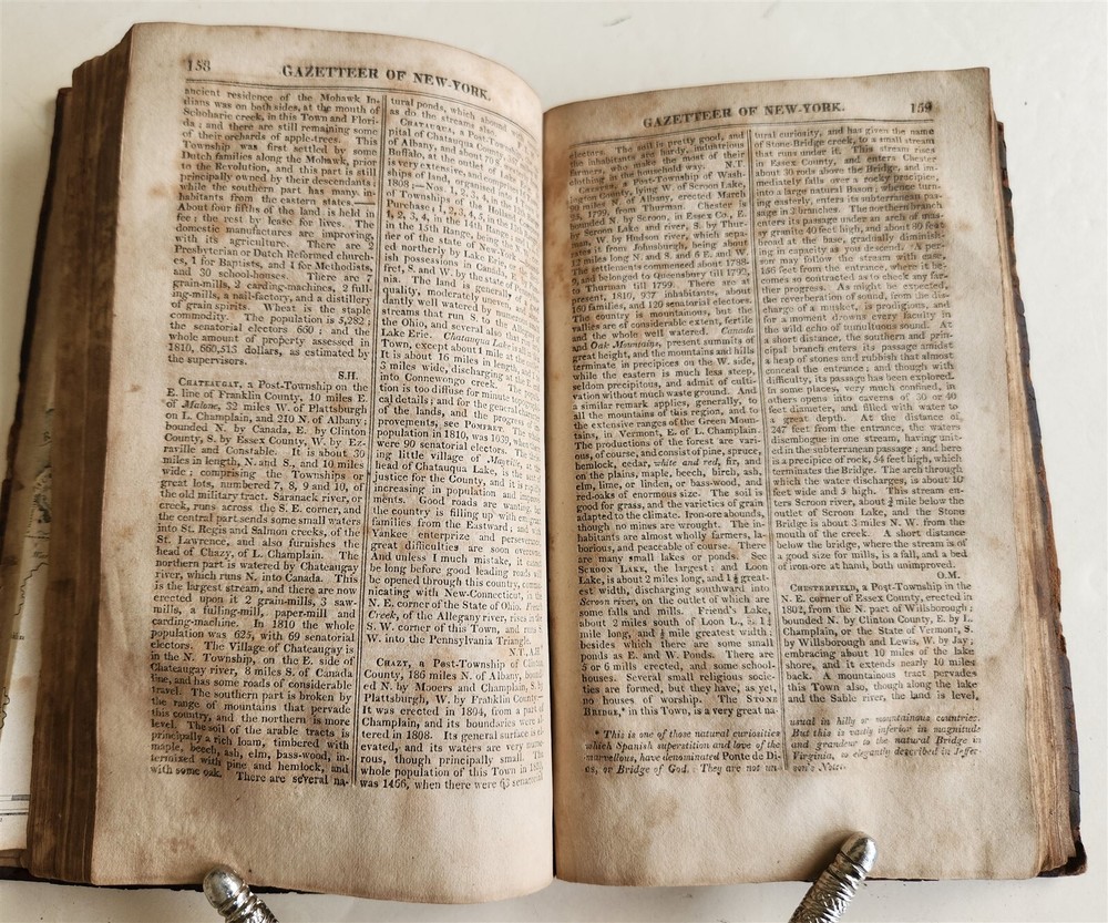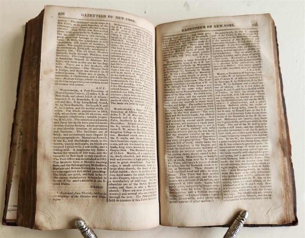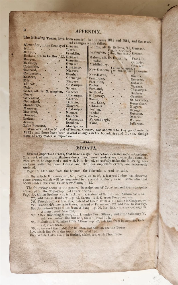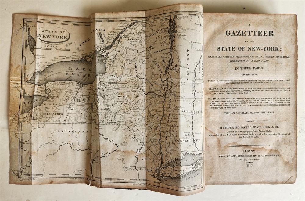 A GAZETTEER OF THE STATE OF NEW-YORK; CAREFULLY WRITTEN FROM ORIGINAL AND AUTHENTIC MATERIALS, ARRANGED ON A NEW PLAN, IN THREE PARTS ... WITH AN ACCURATE MAP OF THE STATE by Spafford, Horatio Gates Albany: H. C. Southwick; 1813 FIRST EDITION Original calf, worn, with some damage to the spine, front cover partially detached Toning, occasional spots Size 5 by 8 3/4" 334 pp plus Appendix Text in English =================================================== Please see my other auctions Thank You Refund Policy: We will issue a FULL REFUND, 100% money back if you are not satisfied with your purchase. Items must be returned to us within 20 days in order to receive a refund or replacement. Buyer is responsible for shipping costs. Powered by SixBit's eCommerce Solution
