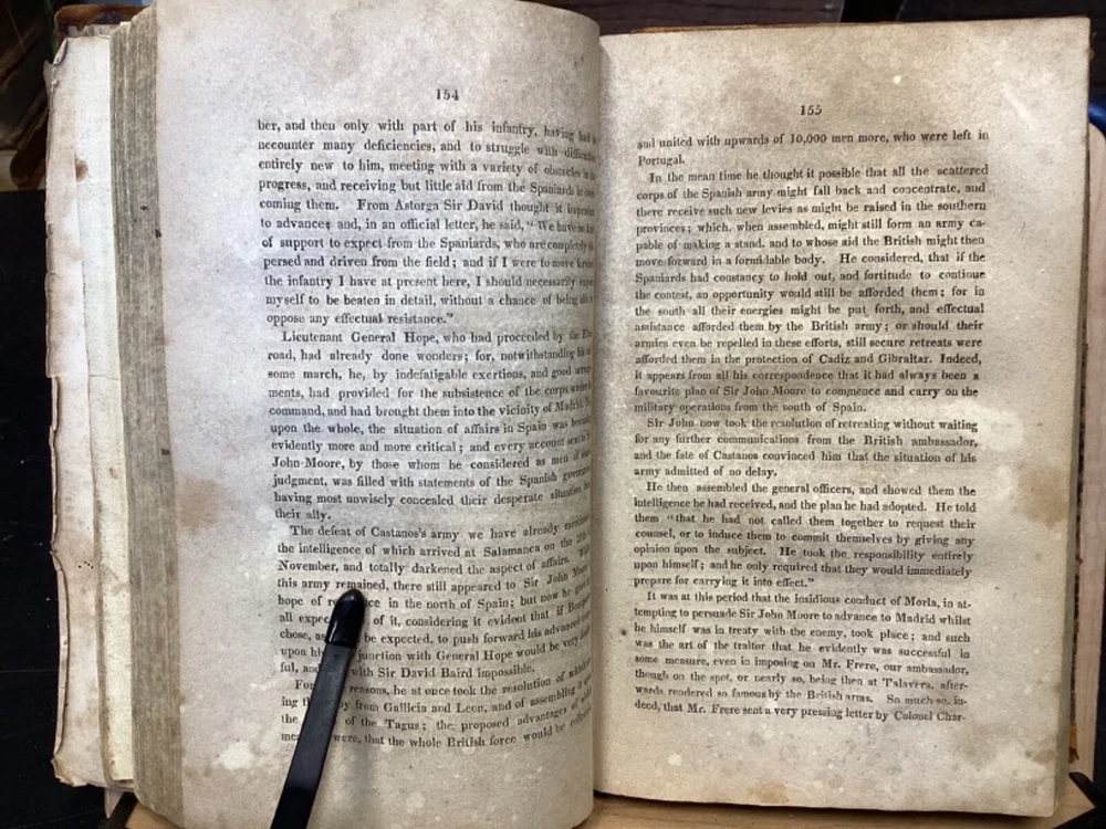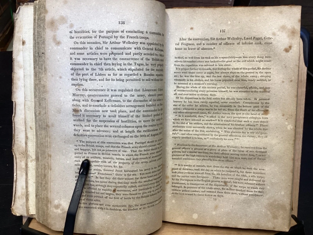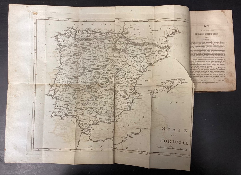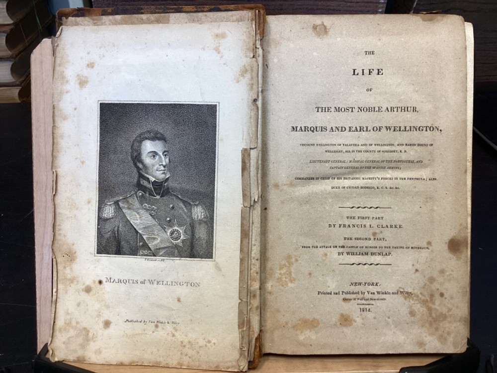 The Life of the Most Noble Arthur, Marquis and Earl of Wellington; The First Part by Francis L. Clarke, The Second Part by William Dunlap, Van Winkle and Wiley, New York, 1814, 423pp, leather, 5.5 x 8.5", 12mo Poor condition/as is. Wear and chipping to front and rear boards. Tips are bumped with exposed boards. Edges are scuffed. Chipping and cracking to spine; illegible. Tail is lacking with exposed binding. Hinges are cracked. Front endpapers are completely detached from binding. Frontispiece opposite title page. Toning, age-staining, tea-staining, and foxing throughout textblock. No known marginalia. Includes fold-out map. Please see photos and ask any questions prior to purchase. William Dunlap (February 19, 1766 - September 28, 1839) was a pioneer of American theater. He was a producer, playwright, and actor, as well as a historian. He managed two of New York City's earliest and most prominent theaters, the John Street Theatre (from 1796 to 1798) and the Park Theatre (from 1798 to 1805). He was also an artist, despite losing an eye in childhood. He produced more than sixty plays, most of which were adaptations or translations from French or German works. However, he is best known for his encyclopedic three-volume History of the Rise and Progress of the Arts of Design in the United States . FORN-TUB-0031-BB-0424-JC616