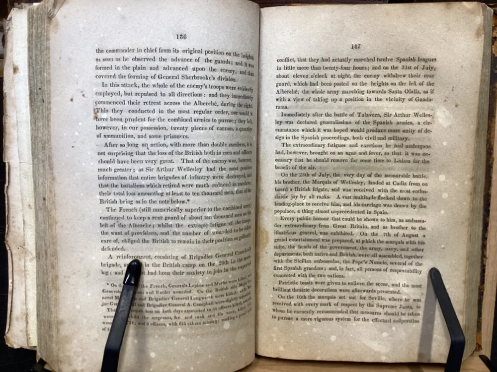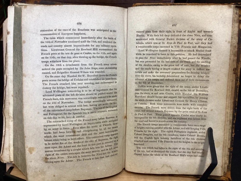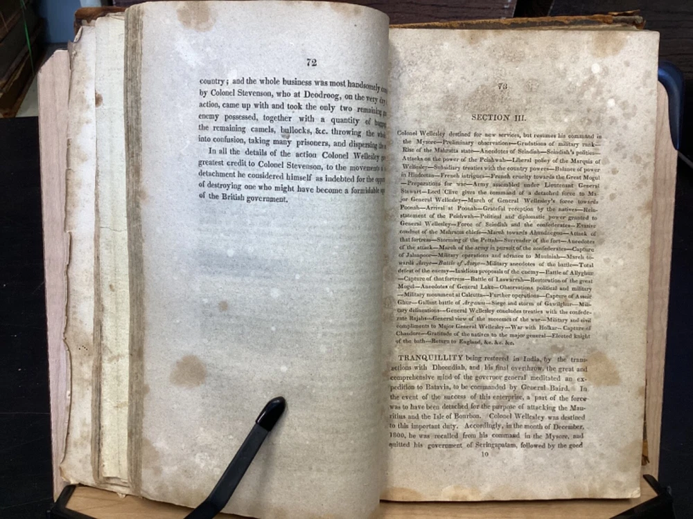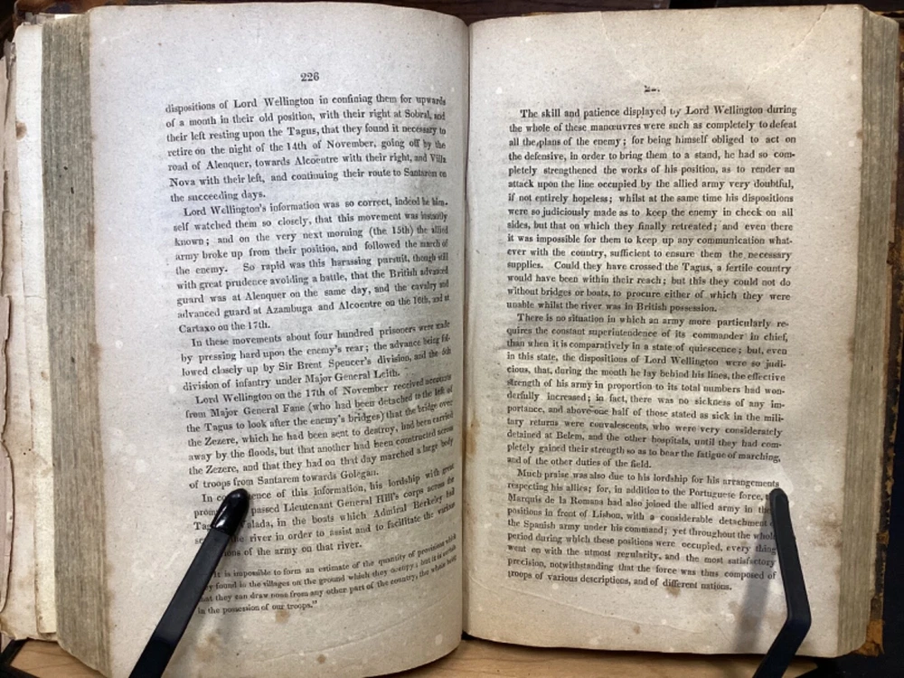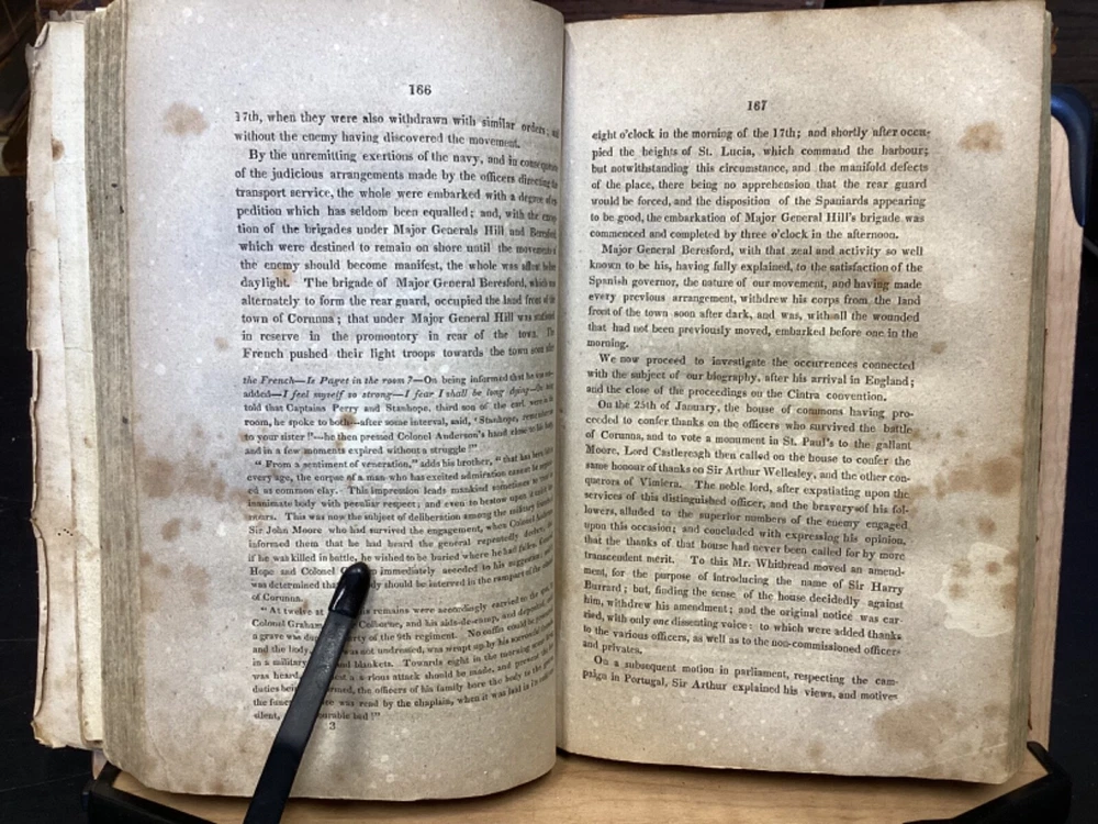 The Life of the Most Noble Arthur, Marquis and Earl of Wellington; The First Part by Francis L. Clarke, The Second Part by William Dunlap, Van Winkle and Wiley, New York, 1814, 423pp, leather, 5.5 x 8.5", 12mo Poor condition/as is. Wear and chipping to front and rear boards. Tips are bumped with exposed boards. Edges are scuffed. Chipping and cracking to spine; illegible. Tail is lacking with exposed binding. Hinges are cracked. Front endpapers are completely detached from binding. Frontispiece opposite title page. Toning, age-staining, tea-staining, and foxing throughout textblock. No known marginalia. Includes fold-out map. Please see photos and ask any questions prior to purchase. William Dunlap (February 19, 1766 - September 28, 1839) was a pioneer of American theater. He was a producer, playwright, and actor, as well as a historian. He managed two of New York City's earliest and most prominent theaters, the John Street Theatre (from 1796 to 1798) and the Park Theatre (from 1798 to 1805). He was also an artist, despite losing an eye in childhood. He produced more than sixty plays, most of which were adaptations or translations from French or German works. However, he is best known for his encyclopedic three-volume History of the Rise and Progress of the Arts of Design in the United States . FORN-TUB-0031-BB-0424-JC616