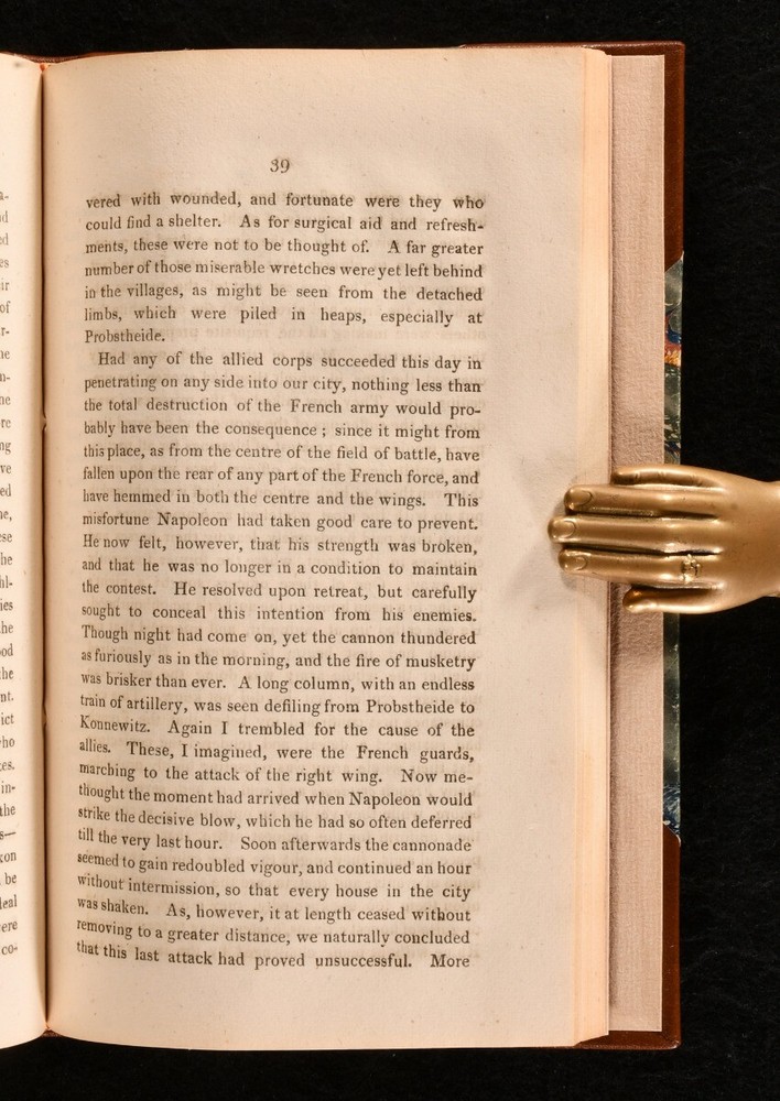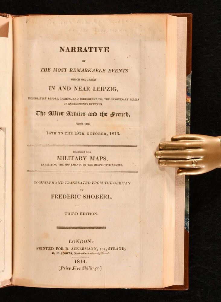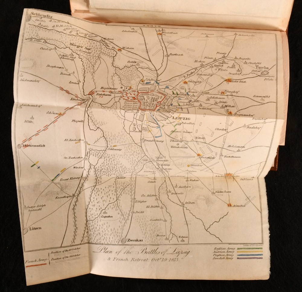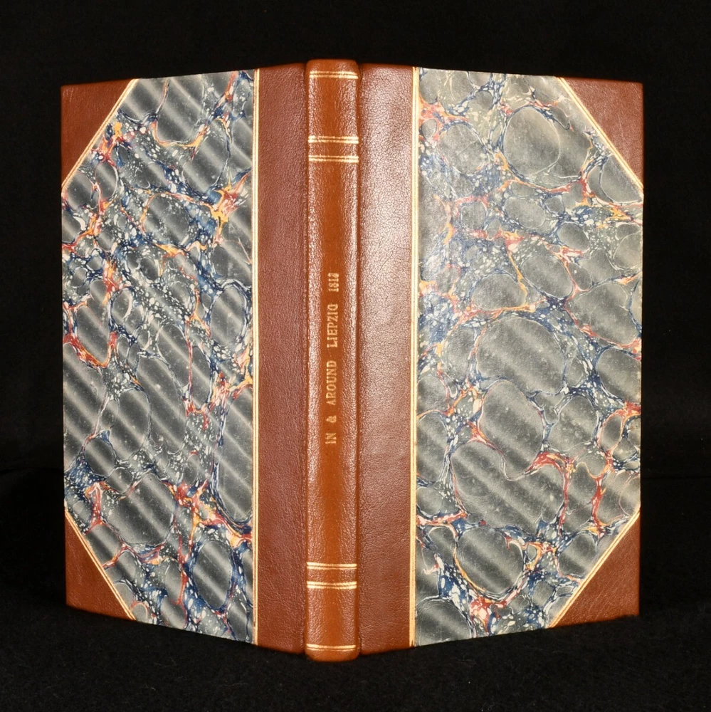 Click here to see our other books! Narrative of the Most Remarkable Events which occurred In and Near Leipzig, Immediately Before, During, and Subsequent to, the Sanguinary Series of Engagements between the Allied Armies and the French, from the 14th to the 19th October, 1813. Illustrated with Military Maps, Exhibiting the Movements of the Respective Armies. Compiled and Translated from the German by Frederic Shoberl. Third Edition. Frederic Shoberl 1814 W. Clowes for R. Ackermann : London 8.5" by 5.5" [6], vi-xvi, [1], 2-104pp. SUMMARY A lovely half leather-bound edition of the insightful narrative of the military events in and around Leipzig 14th – 19th October 1813. Illustrated,Leather Binding Overall Condition: Very Good Indeed This book weighs 0.5 KG when packed UK Postage: £ 3.99 US Postage: £ 15.99 EU Postage : £ 13.99 European Postage: £ 14.99 Asia Postage: £ 18.99 Worldwide Postage: £ 19.99 DESCRIPTION Third Edition. A very smart third edition of Frederic Shoberl’s comprehensive narrative of the events in and around Leipzig concerning engagements between the Allied Armies and the French from the 14 th – 19 th of October 1813. Illustrated with 2 coloured folding military maps exhibiting the movements of the respective armies. Containing an advertisement from the publisher in the opening pages. CONDITION In a half calf binding with marbled cloth to the boards. Gilt title to the spine. Some very light rubbing to the extremities. Internally, firmly bound. Very light spotting to a few pages, particularly towards the front. Otherwise, pages are bright and clean. Two folding maps to the frontispiece, only slightly age toned, slight tear to head when folded. Overall Condition: Very Good Indeed GLOSSARY OF TERMS Overall Condition (Dustwrapper condition rating is shown after that for the book itself, where a dustwrapper is present) Fine - Very well preserved copy showing very little wear Very Good Indeed - Only one or two minor faults, really a very attractive copy Very Good - Quite a wide term meaning no major faults but probably several smaller ones often expected given the age of the book, but still a respectable copy Good - Meaning not very good. Some more serious faults as will be described in the condition report under 'condition' Good Only - Meaning one or more faults that could really do with repair Fair - As with good only above but with other faults leaving a compromised copy even after repair Poor - Really bad and possibly seriously incomplete. We only sell books in this condition where their rarity or value makes them attractive none the less. Major defects will be described. GUARANTEE We offer a full money back guarantee on our descriptions. Please ask for details and conditions. We prefer PAYPAL. If you pay via PAYPAL we will post the item off the same or the next working day with the postage you have selected. Please note we cannot accept USD cheques