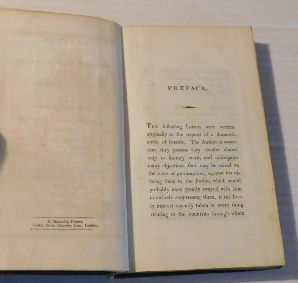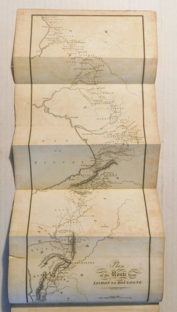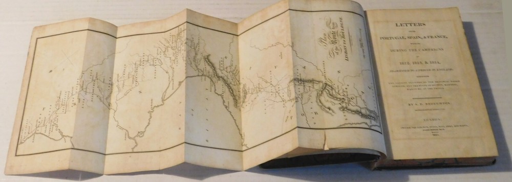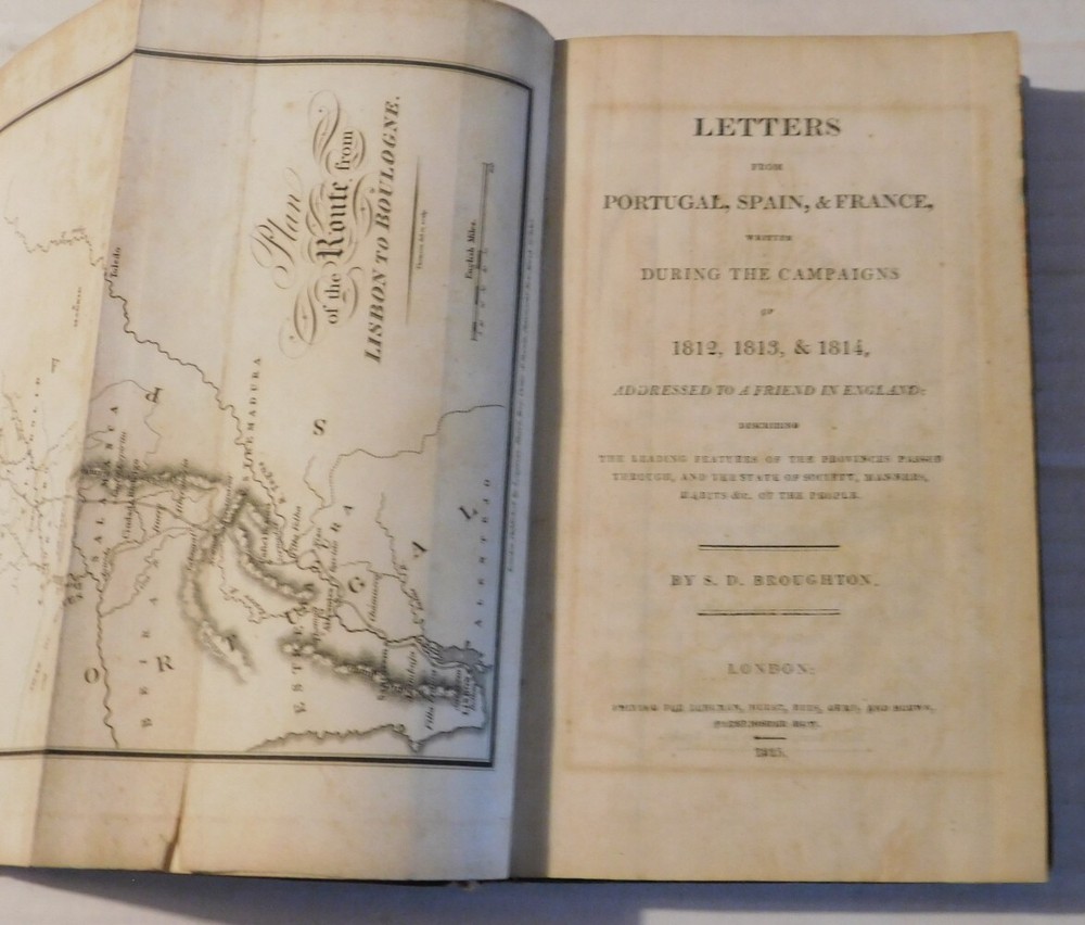 Broughton, Samuel Daniel (1787-1837). LETTERS FROM PORTUGAL, SPAIN, & FRANCE, WRITTEN DURING THE CAMPAIGNS OF 1812, 1813, & 1814, Addressed to a Friend in England. Describing the Leading Features of the Provinces Passed Through, and the State of Society, Manners, Habits &c. of the People. London: Printed for Longman, Hurst, Rees, Orme, and Brown, 1815. Octavo, 8-1/2 inches high by 5-1/4 inches wide. Bound in contemporary brown calf crudely rebacked with a plain cloth spine. The binding is enhanced by marbled edges and endpapers. The leather covers are rubbed with wear to the corners. (vi) & 412 pages, illustrated with an 18-1/2 inches long by 5-1/4 inches wide folding map by John Thomson titled "Plan of the Route from Lisbon to Boulogne". There is occasional minor foxing to the otherwise bright pages and to the map with small tears to the bottom of the folds of the map. A few page corners are creased. Very good. RARE FIRST EDITION. Samuel Daniel Broughton (1787-1837) was an English army surgeon who in 1812 was appointed assistant-surgeon of the 2nd Life Guards, the Regiment that fought on the Spanish peninsular against Napoleon's troops. He was present on the Iberian Peninsula and in the South of France until the end of the Peninsular War at the battle for Toulouse. Later, he was present at the battle of Waterloo. His book is a first-hand account not only of the military campaigns in which he was involved but it is also a descriptive narrative of the customs and habits of the local people with whom he came into contact. It is rich in period color making it perfect background material for this episode of the Napoleonic War. TERMS: Shipping charges are calculated based on the total packed weight of this item. New York State residents will be assessed and charged the relevant sales tax. All items are guaranteed authentic and as described. Be sure to add me to your favorites list ! Check out my other items !