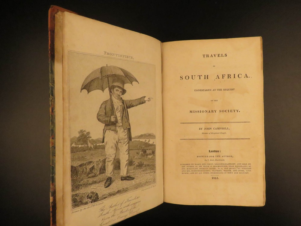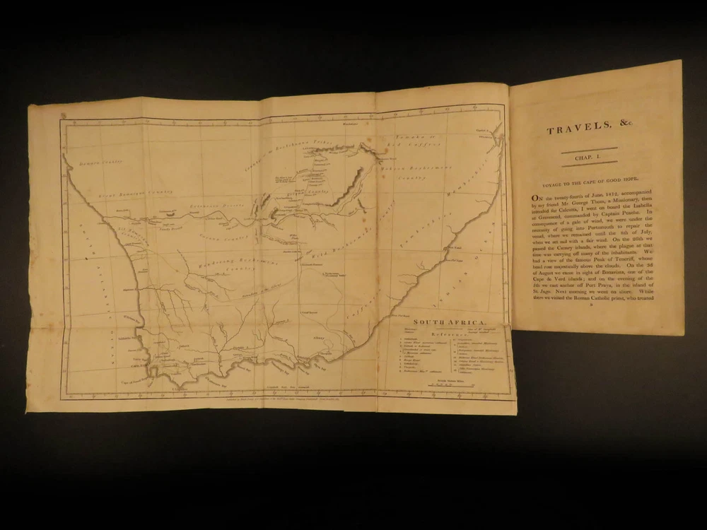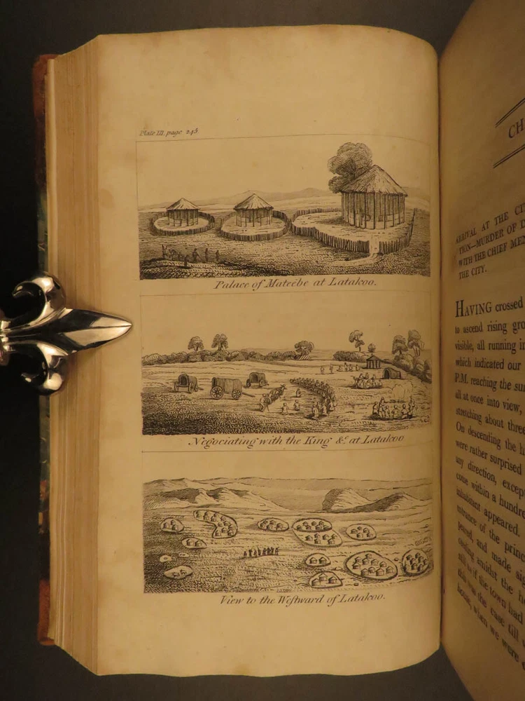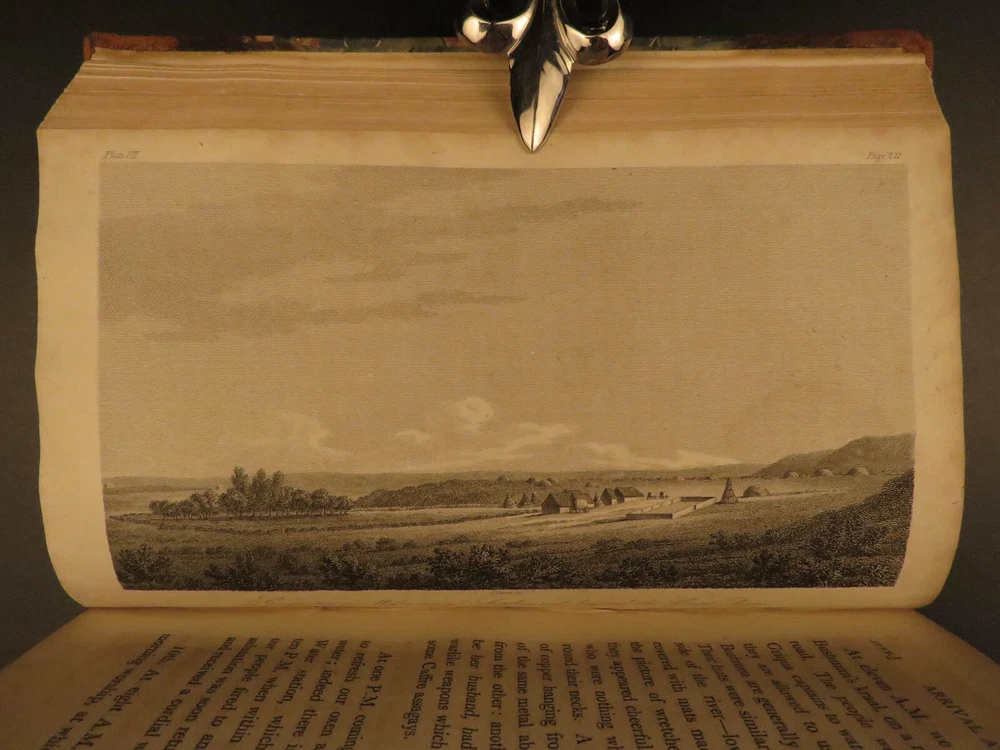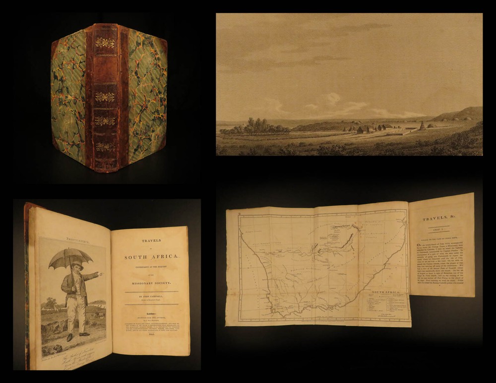 1815 1 ed Travels in South Africa Scottish Campbell King Slavery Illustrated MAP John Campbell was a Scottish missionary and traveler, sent to South Africa by the London Missionary Society to inspect mission stations. On Campbell’s journey to the Cape, he became significant in the opposition of the slave trade, and helped found the Society for the Education of Africans. The book ‘Travels in South Africa’ is the record of his first journey to South Africa in which Campbell toured the country, meeting the natives and the Boer settlers. Campbell gives an account of bushmen’s country, King Mateebe in Lattakoo, Dr. Cowan’s massacre, numerous undiscovered topographical regions, and an appendix of prayers in native languages, short glossary, a list of population and land holdings of the tribes, a list a questions asked at every mission and a new list of regulations created during his trip. 'Few Englishmen at that time had performed such a feat, and on his return his appearances on missionary platforms in London and throughout the country were received with enthusiasm' (DNB). This 1815 first edition includes 10 engraved plates by Henry Hoppner Meyer and James Sargant Storer, after William Thomas Strutt and a large fold out map of his travels in South Africa! Item number: #10995 Price: $750 CAMPBELL, John Travels in South Africa: undertaken at the request of the Missionary Society London: Printed for the author by T. Rutt, published by Black and Parry, and others… 1815. Details : · Collation: Complete with all pages o xv, [1], 582 o 10 engraved plates · Language: English · Binding: Leather; tight & secure · Size : ~8.5in X 5.5in (22cm x 14cm) · Rare and desirable with auction records and price comparisons as high as $2,000 Our Guarantee: Very Fast. Very Safe. Free Shipping Worldwide. Customer satisfaction is our priority! Notify us with 7 days of receiving, and we will offer a full refund without reservation! 10995