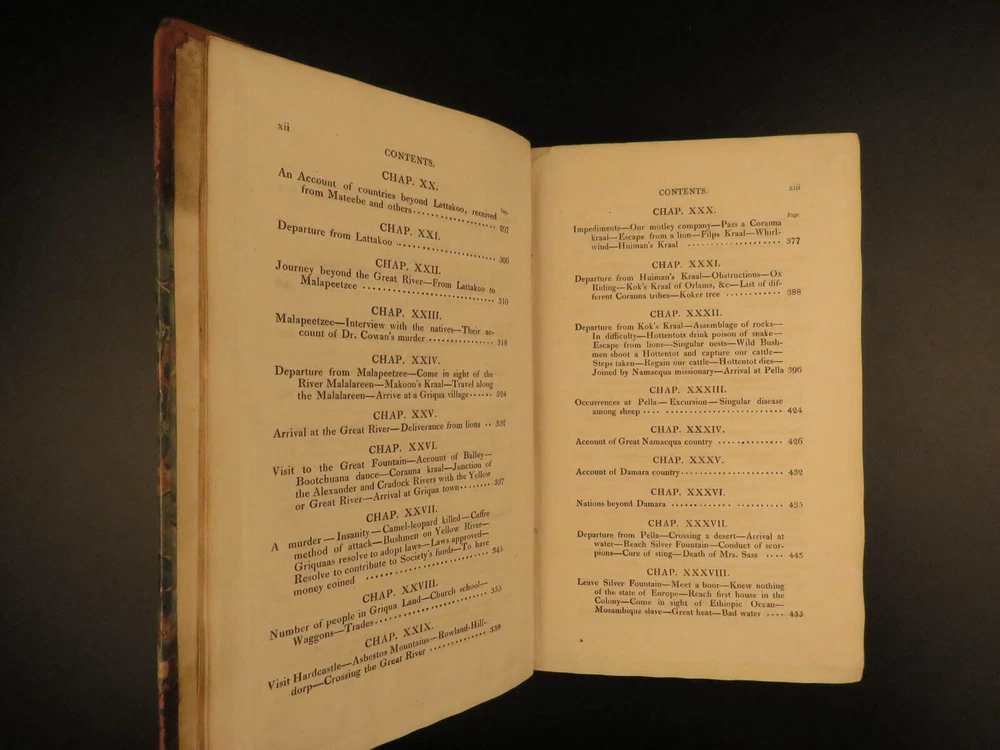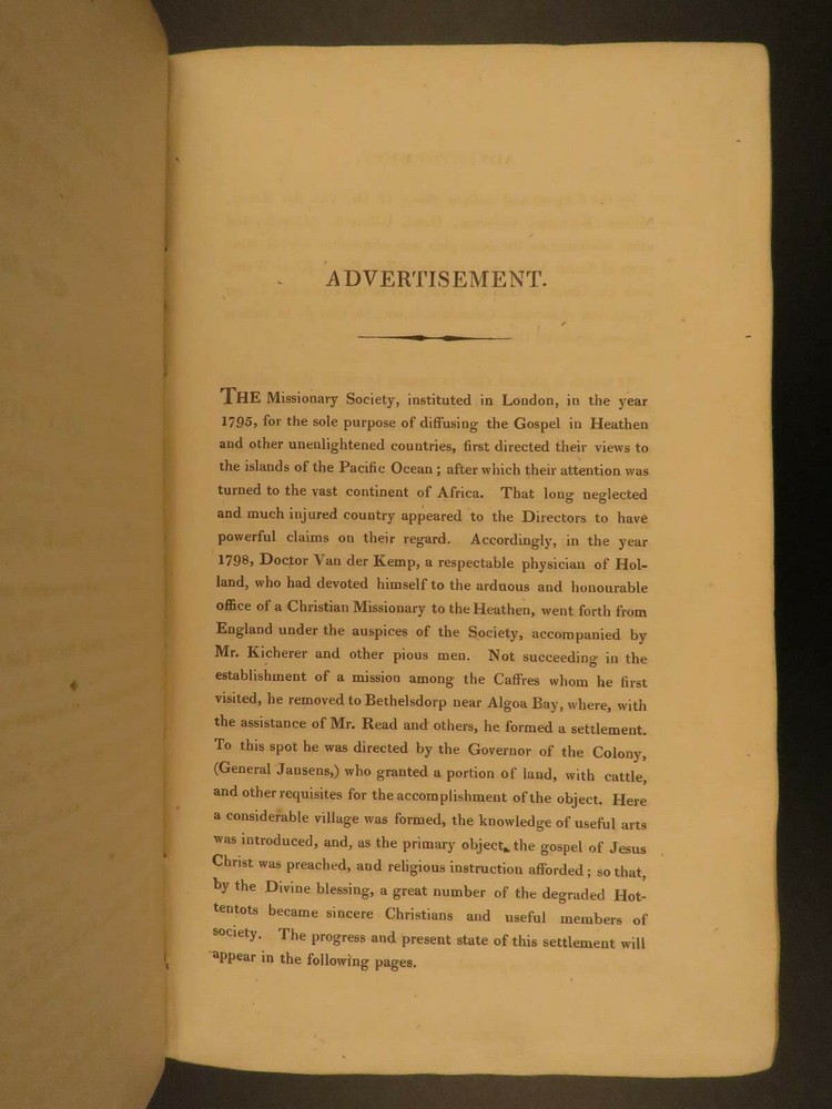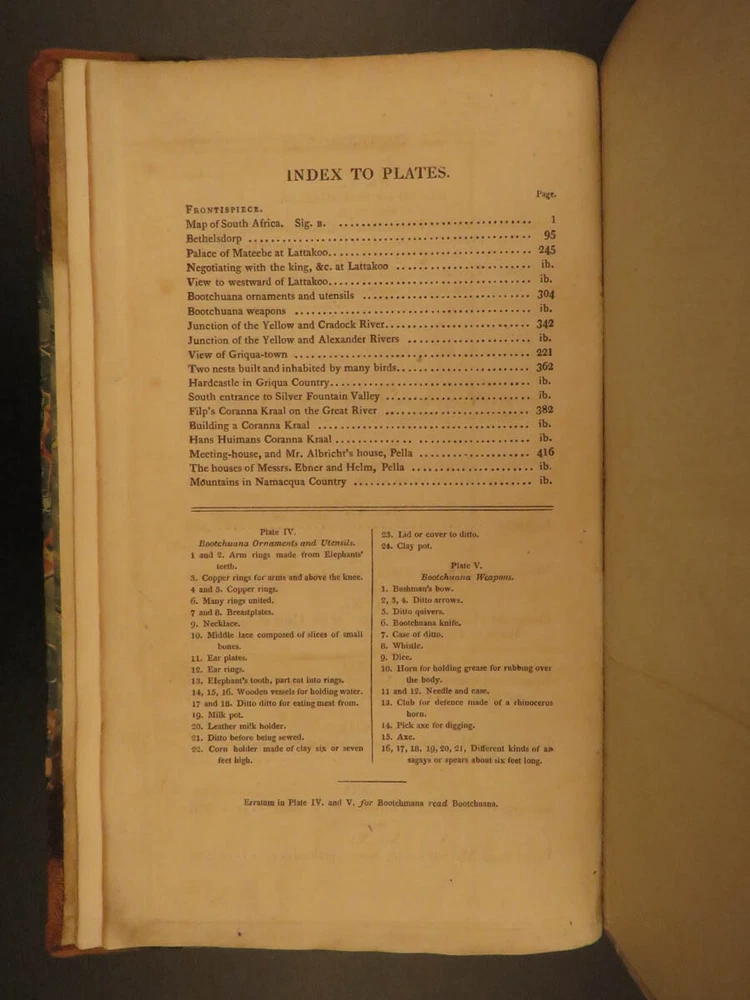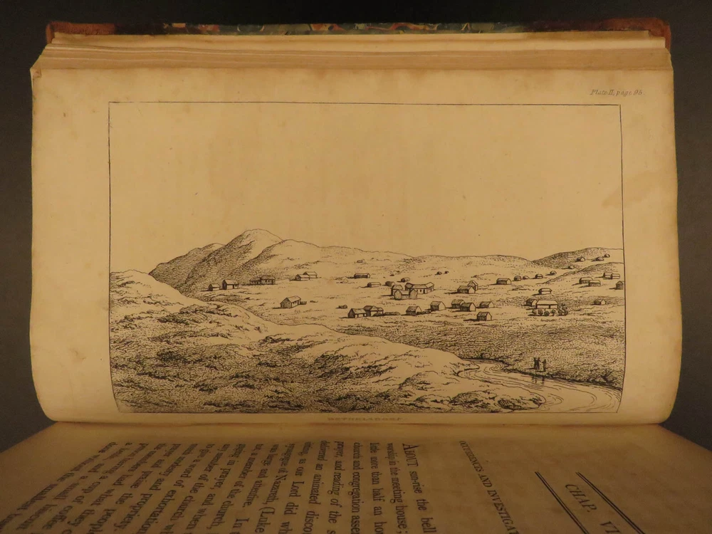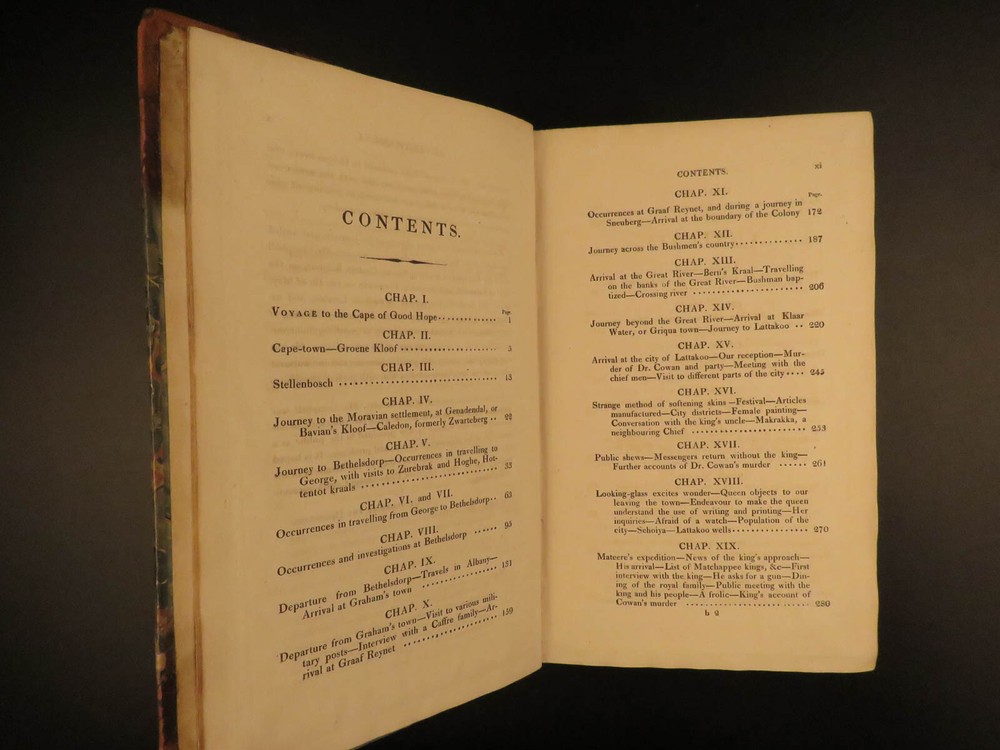 1815 1 ed Travels in South Africa Scottish Campbell King Slavery Illustrated MAP John Campbell was a Scottish missionary and traveler, sent to South Africa by the London Missionary Society to inspect mission stations. On Campbell’s journey to the Cape, he became significant in the opposition of the slave trade, and helped found the Society for the Education of Africans. The book ‘Travels in South Africa’ is the record of his first journey to South Africa in which Campbell toured the country, meeting the natives and the Boer settlers. Campbell gives an account of bushmen’s country, King Mateebe in Lattakoo, Dr. Cowan’s massacre, numerous undiscovered topographical regions, and an appendix of prayers in native languages, short glossary, a list of population and land holdings of the tribes, a list a questions asked at every mission and a new list of regulations created during his trip. 'Few Englishmen at that time had performed such a feat, and on his return his appearances on missionary platforms in London and throughout the country were received with enthusiasm' (DNB). This 1815 first edition includes 10 engraved plates by Henry Hoppner Meyer and James Sargant Storer, after William Thomas Strutt and a large fold out map of his travels in South Africa! Item number: #10995 Price: $750 CAMPBELL, John Travels in South Africa: undertaken at the request of the Missionary Society London: Printed for the author by T. Rutt, published by Black and Parry, and others… 1815. Details : · Collation: Complete with all pages o xv, [1], 582 o 10 engraved plates · Language: English · Binding: Leather; tight & secure · Size : ~8.5in X 5.5in (22cm x 14cm) · Rare and desirable with auction records and price comparisons as high as $2,000 Our Guarantee: Very Fast. Very Safe. Free Shipping Worldwide. Customer satisfaction is our priority! Notify us with 7 days of receiving, and we will offer a full refund without reservation! 10995
