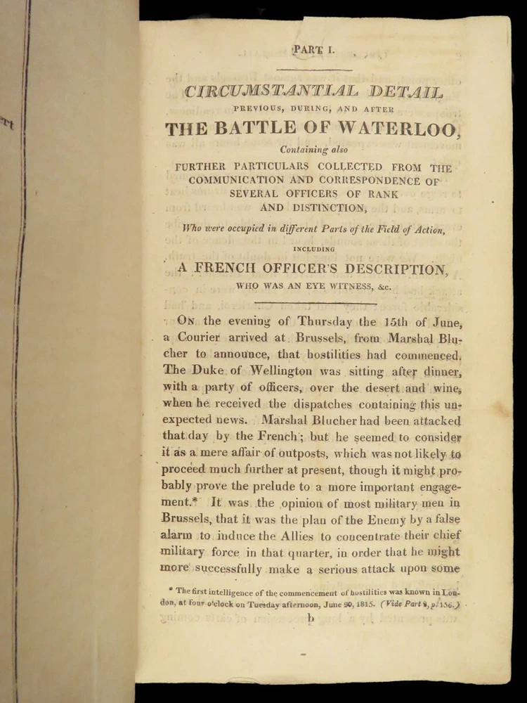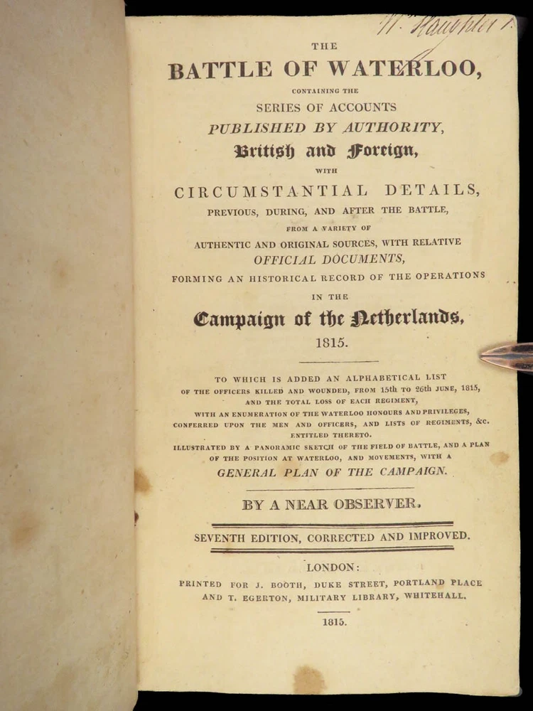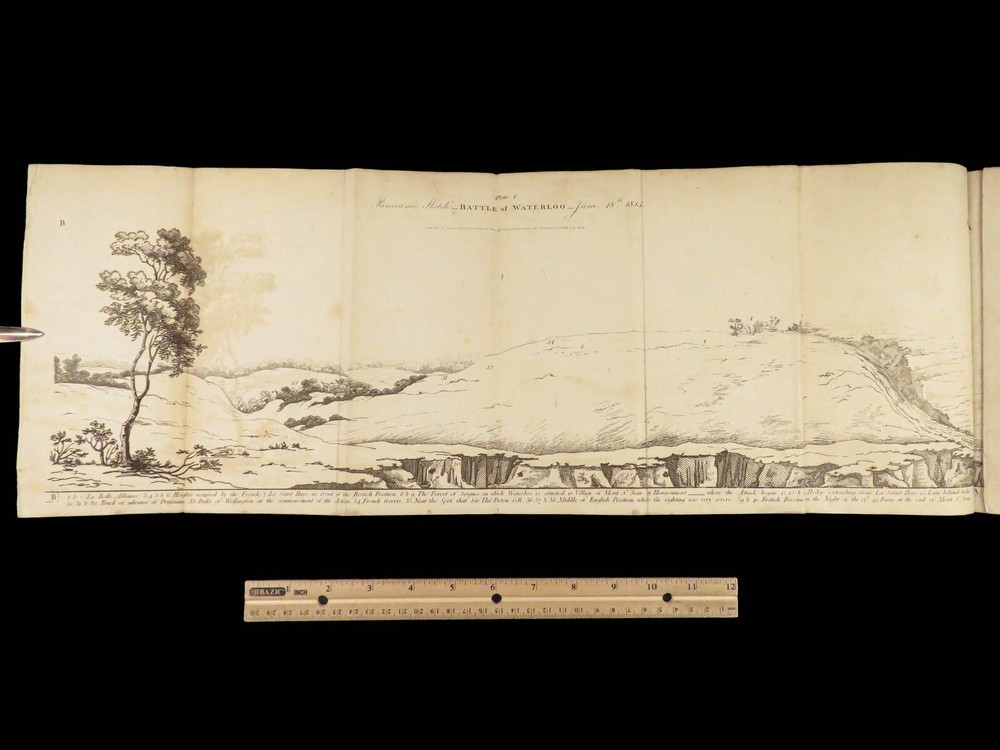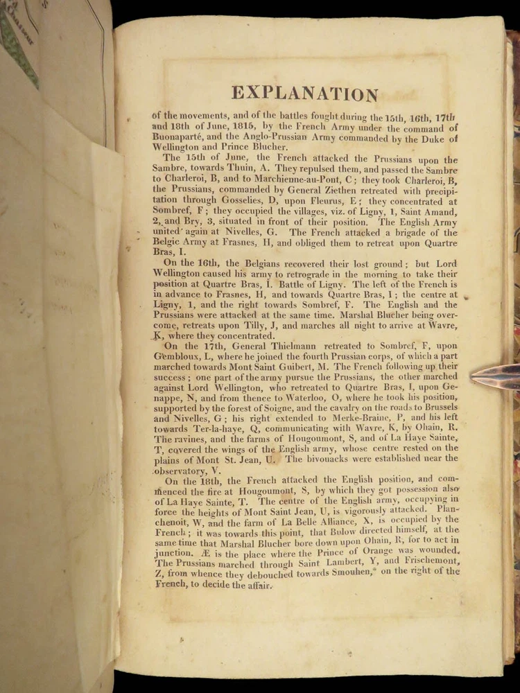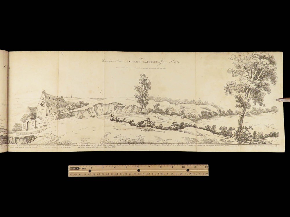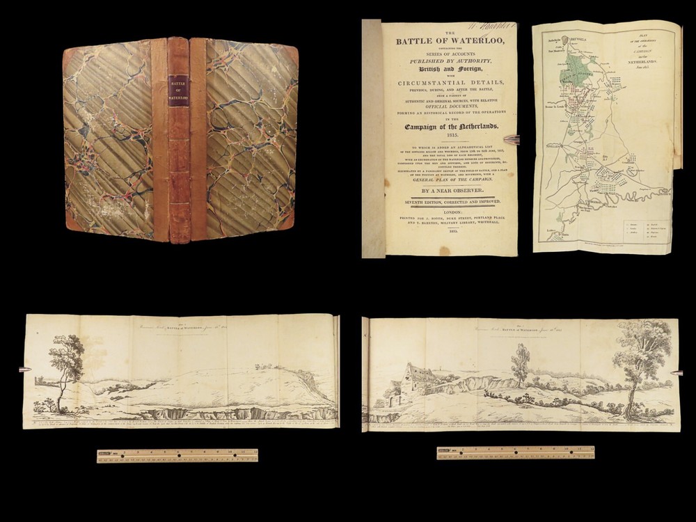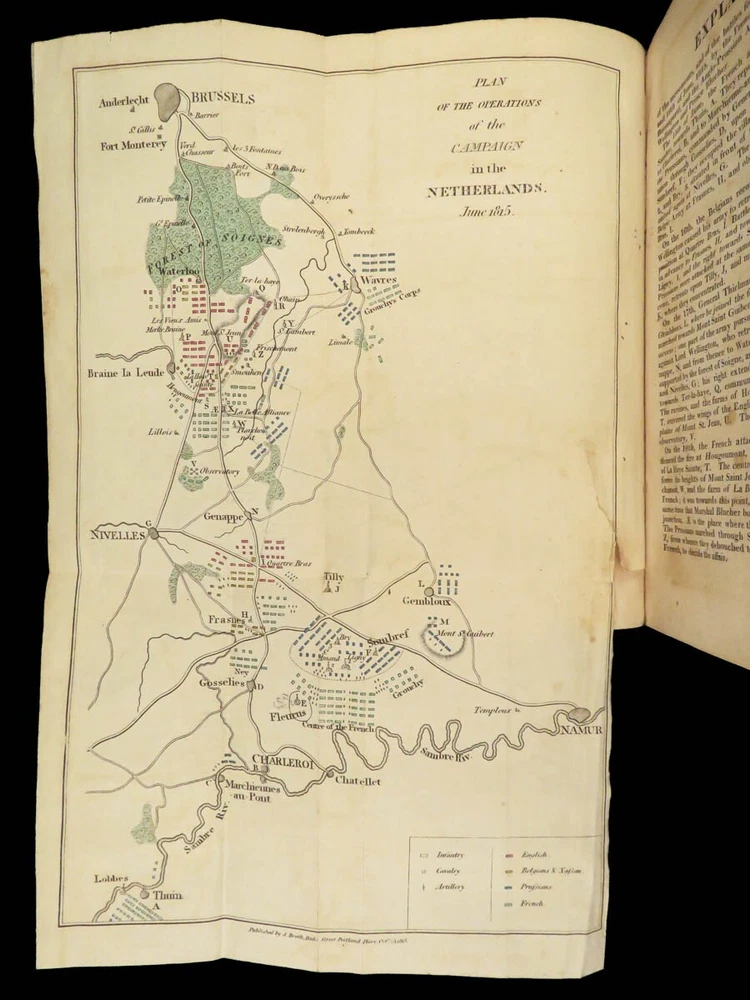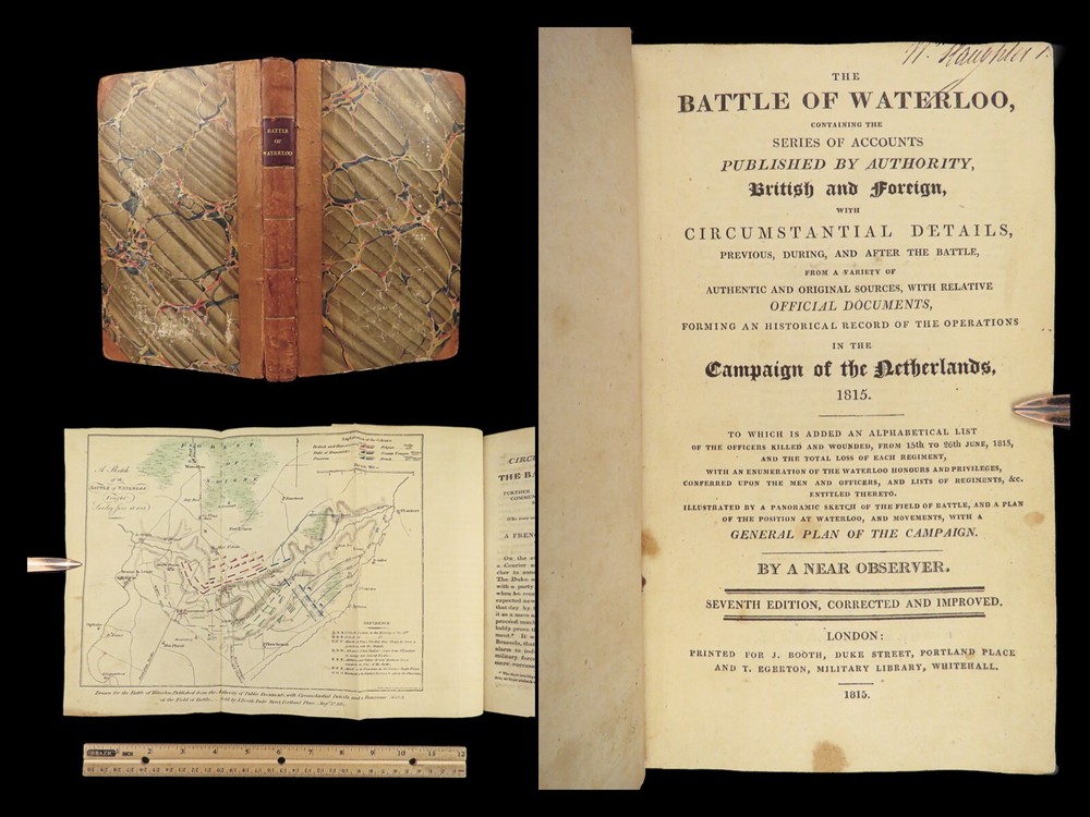 1815 Battle of Waterloo Napoleon Netherlands Campaign Color Illustrated MAPS ‘ Battle of Waterloo ’ is a compilation of circumstantial details of the events of Waterloo. It is an impressive visual account of the Historical Account of the Campaign in the Netherlands in 1815, illustrating various scenes and maps. It includes notable stories of Napoleon, battle strategy, and his surrender at Paris. This 1815 edition includes two folding maps of the battle and two long colored foldout illustrations and a table of the fallen and bio of many of the British officers. Item number: #27677 Price: $599 EATON, Charlotte Anne The Battle of Waterloo : containing the series of accounts published by authority, British and foreign, with circumstantial details, … London: Printed for J. Booth and T. Egerton, 1815. Details : · Collation: Complete with all pages o [6], 279, [1] o 4 folding plates · Provenance: o Armorial bookplate – J. M. Bacon; Motto: PROBA CONSCIENTIA § Reverend John Mackenzie Bacon, FRAS (1846–1904) was an English astronomer, aeronaut, and lecturer. He performed many of his aeronautical studies via balloon, viewing and filming eclipses and meteor showers from its heights. Both John and his daughter Gertrude were members of the British Astronomical Association. o Handwritten – [ Edward H. Thurlow ] § Edward Hovell-Thurlow, 2nd Baron Thurlow (1781–1829), known also as a poet. o Handwritten – [ George T. Cushman ] o Handwritten – [ Wm. Haughler ] · Language: English · Binding: Leather; secure · Size: ~8.75in X 5.5in (22cm x 14cm) Our Guarantee: Very Fast. Very Safe. Free Shipping Worldwide. Customer satisfaction is our priority! Notify us with 7 days of receiving, and we will offer a full refund without reservation!