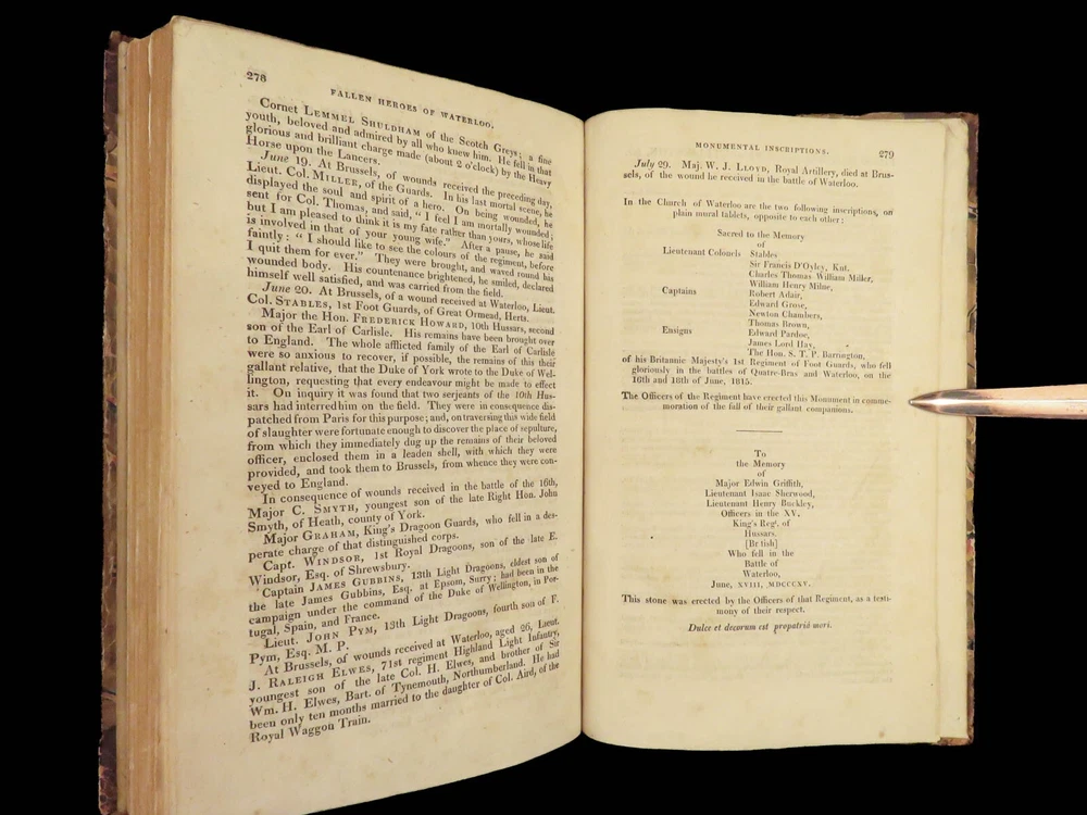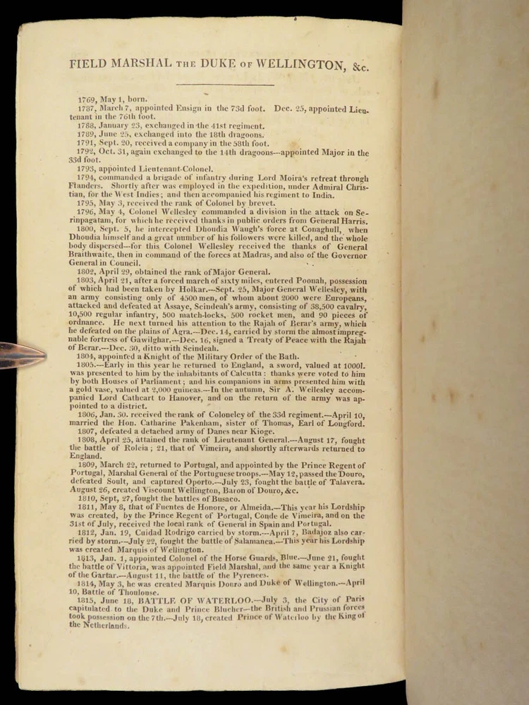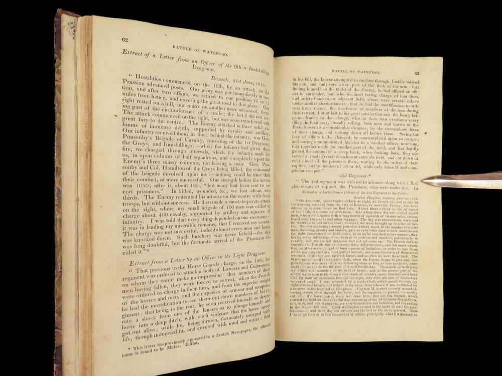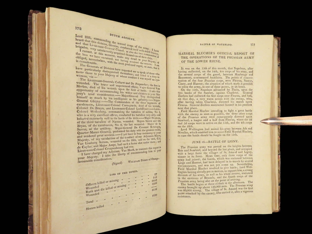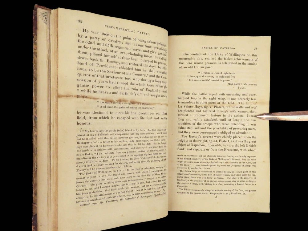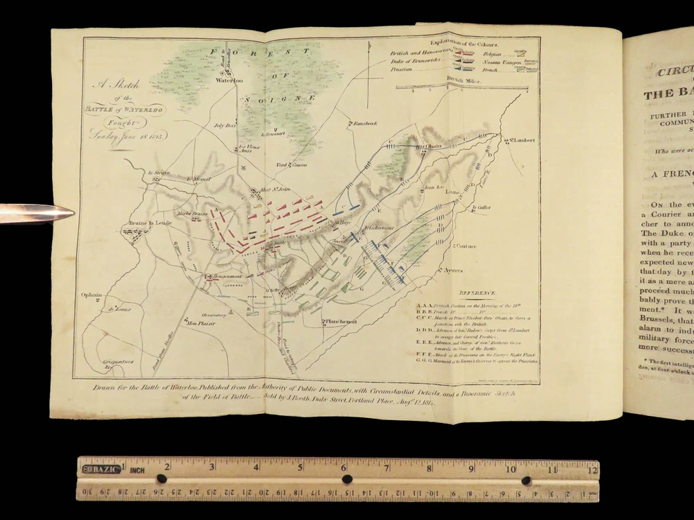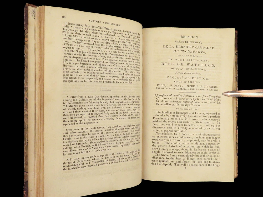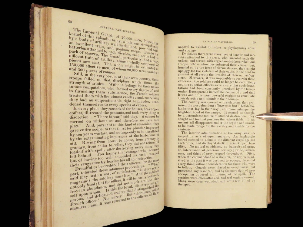 1815 Battle of Waterloo Napoleon Netherlands Campaign Color Illustrated MAPS ‘ Battle of Waterloo ’ is a compilation of circumstantial details of the events of Waterloo. It is an impressive visual account of the Historical Account of the Campaign in the Netherlands in 1815, illustrating various scenes and maps. It includes notable stories of Napoleon, battle strategy, and his surrender at Paris. This 1815 edition includes two folding maps of the battle and two long colored foldout illustrations and a table of the fallen and bio of many of the British officers. Item number: #27677 Price: $599 EATON, Charlotte Anne The Battle of Waterloo : containing the series of accounts published by authority, British and foreign, with circumstantial details, … London: Printed for J. Booth and T. Egerton, 1815. Details : · Collation: Complete with all pages o [6], 279, [1] o 4 folding plates · Provenance: o Armorial bookplate – J. M. Bacon; Motto: PROBA CONSCIENTIA § Reverend John Mackenzie Bacon, FRAS (1846–1904) was an English astronomer, aeronaut, and lecturer. He performed many of his aeronautical studies via balloon, viewing and filming eclipses and meteor showers from its heights. Both John and his daughter Gertrude were members of the British Astronomical Association. o Handwritten – [ Edward H. Thurlow ] § Edward Hovell-Thurlow, 2nd Baron Thurlow (1781–1829), known also as a poet. o Handwritten – [ George T. Cushman ] o Handwritten – [ Wm. Haughler ] · Language: English · Binding: Leather; secure · Size: ~8.75in X 5.5in (22cm x 14cm) Our Guarantee: Very Fast. Very Safe. Free Shipping Worldwide. Customer satisfaction is our priority! Notify us with 7 days of receiving, and we will offer a full refund without reservation!
