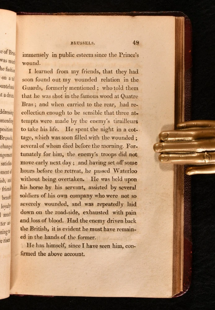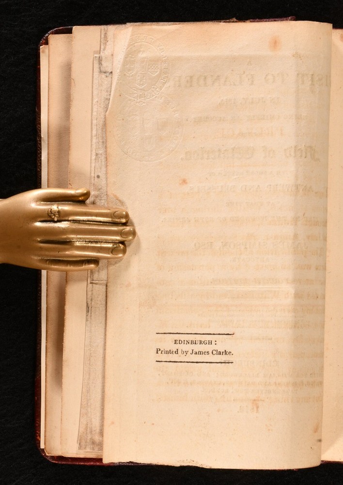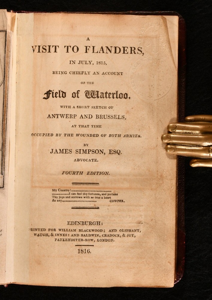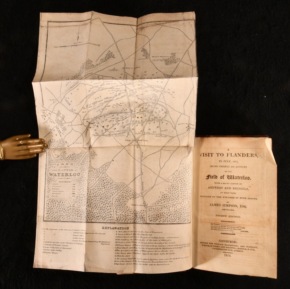 Click here to see our other books! A Visit to Flanders, In July 1815, Being Chiefly an Account of the Field of Waterloo. With a short sketch of Antwerp and Brussels, at that time occupied by the wounded of both armies. James Simpson 1816 William Blackwood; And Oliphant, Waugh, & Innes: And Baldwin, Cradock, & Joy, Patternoster-Row : London 6.5" by 4.5" [4], iv-vi, [3], 2-190pp SUMMARY James Simpson’s captivating depiction of the scene at the battle of Waterloo immediately after the event, with folding map. Leather Binding,Signed Binding Overall Condition: Good This book weighs 0.5 KG when packed UK Postage: £ 3.99 US Postage: £ 15.99 EU Postage : £ 13.99 European Postage: £ 14.99 Asia Postage: £ 18.99 Worldwide Postage: £ 19.99 DESCRIPTION A fascinating account by James Simpson of his 1815 visit to Flanders immediately after the battle of Waterloo. Simpson was a Scottish advocate and author. Other notable work by Simpson includes ‘Paris after Waterloo’ (1853). Containing a folding map depicting the scene of Waterloo to the frontispiece. The fourth edition. CONDITION In half Morocco binding by Wilson with cloth to the boards, rebacked with the original boards restored. Some light marking to the boards. Some rubbing to the extremities. Hinges are starting, particularly the front hinge. National Library of Scotland Stamp to front pastedown, recto of front endpaper and front free endpaper. Paisley public library sticker to rear pastedown. Folding map frontispiece of Waterloo age toned with a small chip to the centre left and closed tear to the top left. A couple of small tape repairs to the reverse of the folding map. Has been repaired to the gutter between frontispiece and title page. Blind stamp to title page and pages 1 and 51. Paisley Free Library stamps also to pages 1 and 51. Internally, firmly bound. Pages are age toned and have some markings. Overall Condition: Good GLOSSARY OF TERMS Overall Condition (Dustwrapper condition rating is shown after that for the book itself, where a dustwrapper is present) Fine - Very well preserved copy showing very little wear Very Good Indeed - Only one or two minor faults, really a very attractive copy Very Good - Quite a wide term meaning no major faults but probably several smaller ones often expected given the age of the book, but still a respectable copy Good - Meaning not very good. Some more serious faults as will be described in the condition report under 'condition' Good Only - Meaning one or more faults that could really do with repair Fair - As with good only above but with other faults leaving a compromised copy even after repair Poor - Really bad and possibly seriously incomplete. We only sell books in this condition where their rarity or value makes them attractive none the less. Major defects will be described. GUARANTEE We offer a full money back guarantee on our descriptions. Please ask for details and conditions. We prefer PAYPAL. If you pay via PAYPAL we will post the item off the same or the next working day with the postage you have selected. Please note we cannot accept USD cheques
