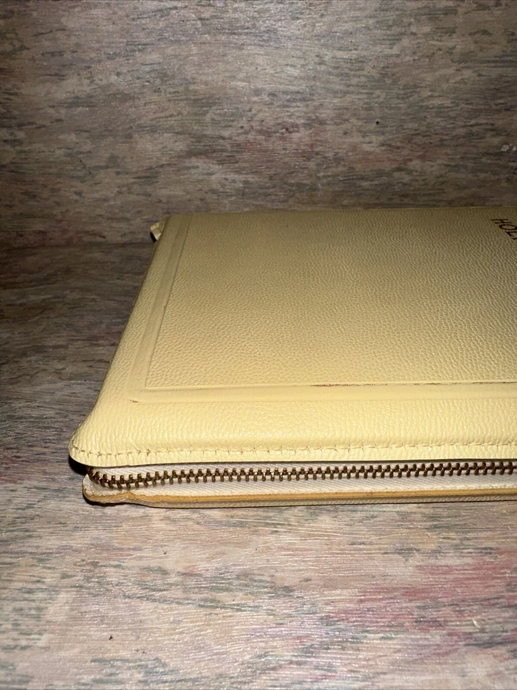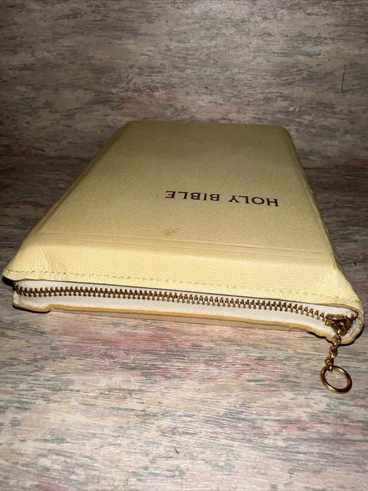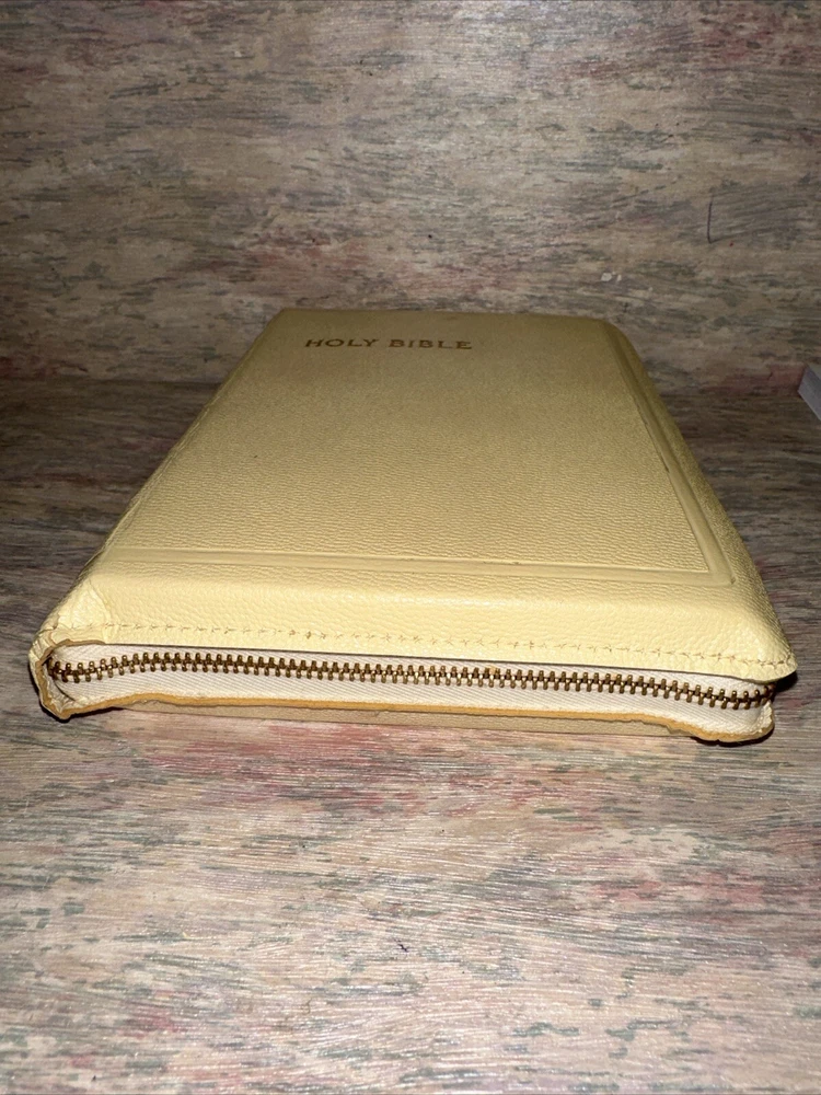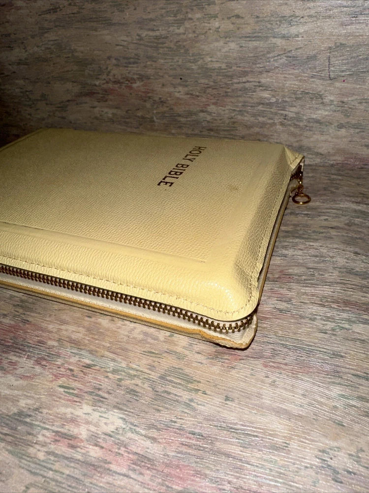 1816 Instituted HOLY BIBLE: Maps. King James Version - Yellow Zipper Case 1950’s American Bible Society instituted in the year 1816 New York , presented to filled out in 1961 . The maps in the back of the Bible are dated 1954. This is the holy Bible containing the old and new testament. . translated out of the original tongues and the former translations diligently compared and revised set forth in 1611 and commonly known as the king James version . This Bible has some and soiling on the cover cannot say that it is leather but does feel like it Zipper works great some damage to folds on spine. Bible appears barely used. See all photos.