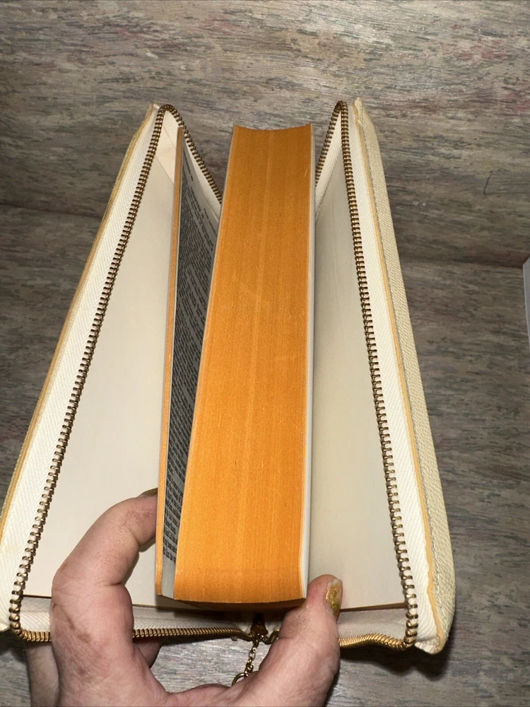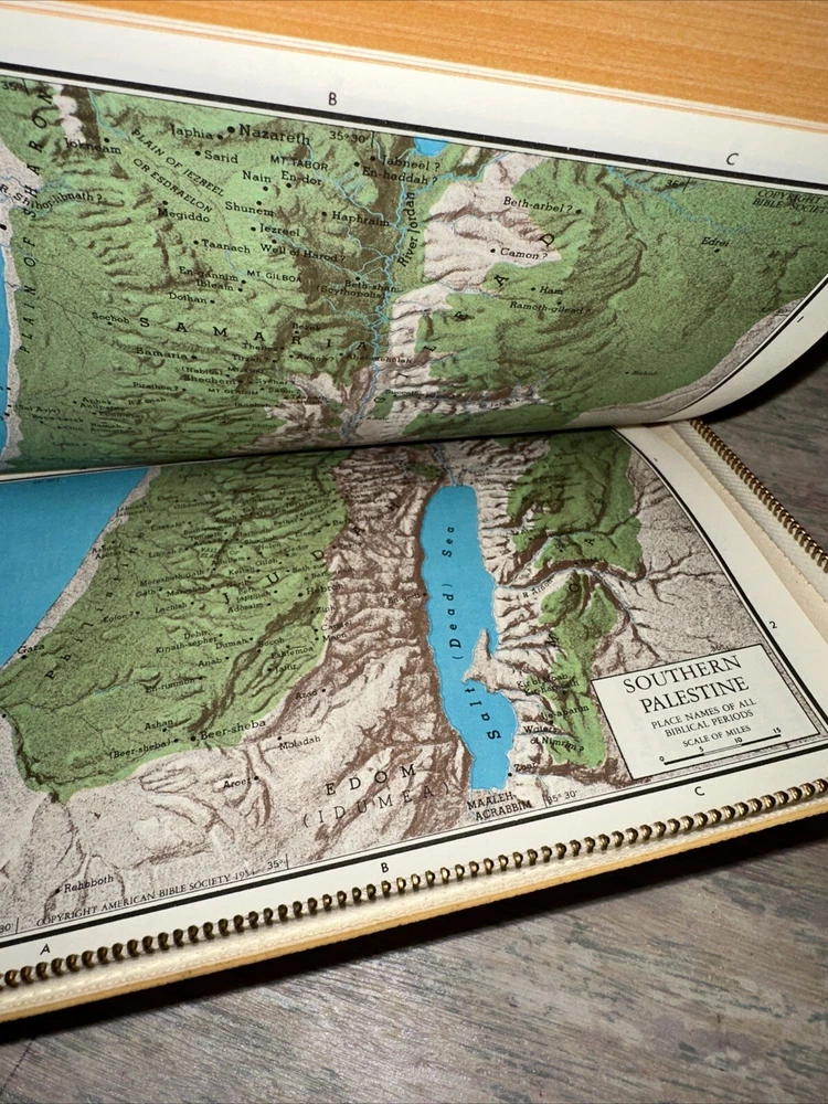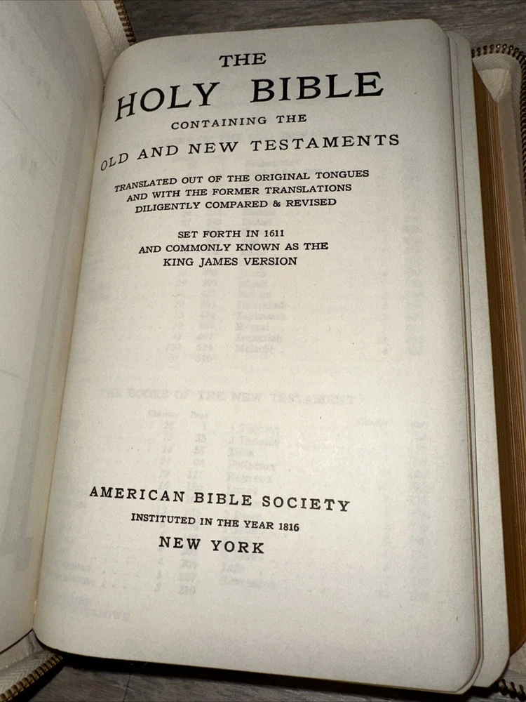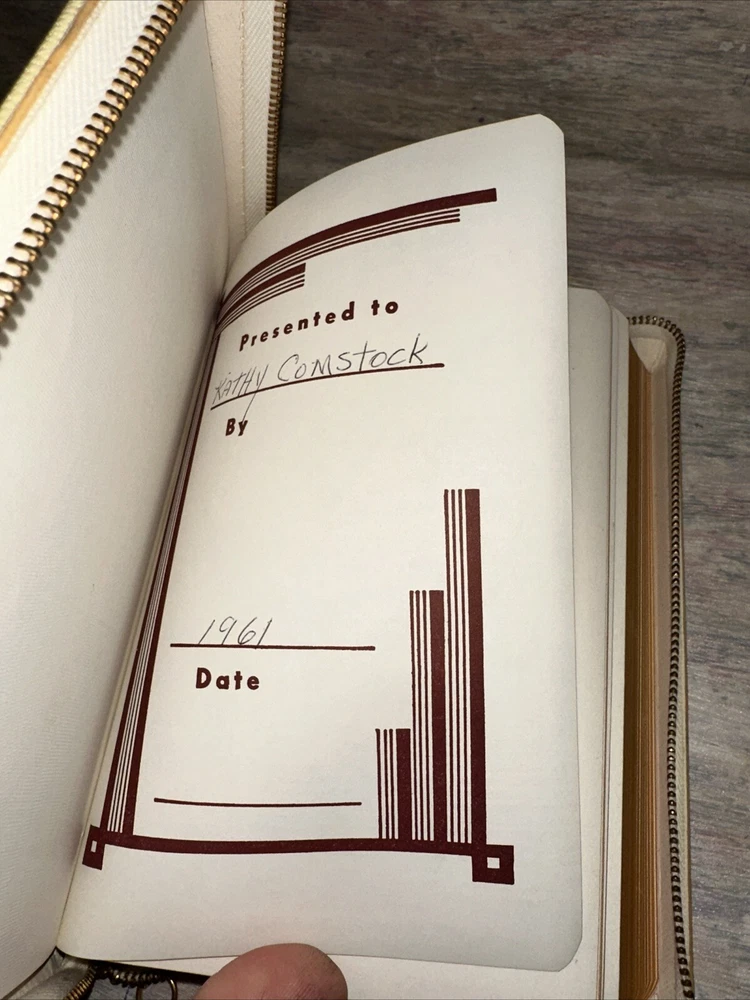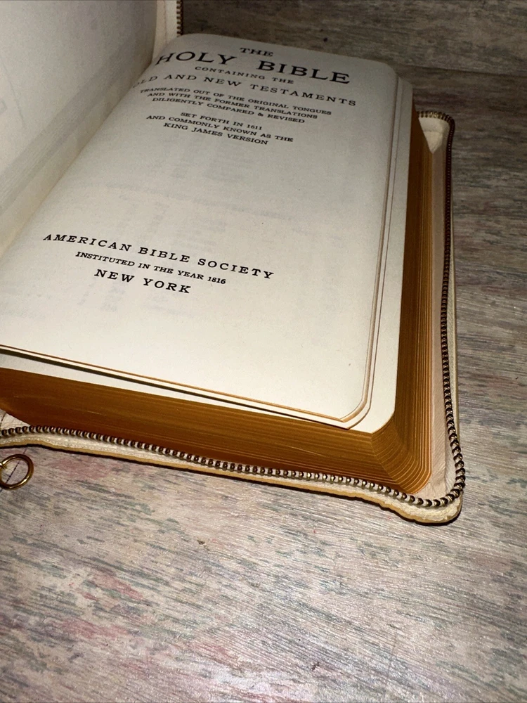 1816 Instituted HOLY BIBLE: Maps. King James Version - Yellow Zipper Case 1950’s American Bible Society instituted in the year 1816 New York , presented to filled out in 1961 . The maps in the back of the Bible are dated 1954. This is the holy Bible containing the old and new testament. . translated out of the original tongues and the former translations diligently compared and revised set forth in 1611 and commonly known as the king James version . This Bible has some and soiling on the cover cannot say that it is leather but does feel like it Zipper works great some damage to folds on spine. Bible appears barely used. See all photos.