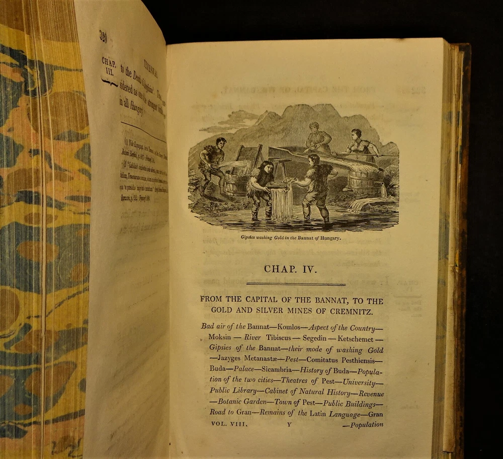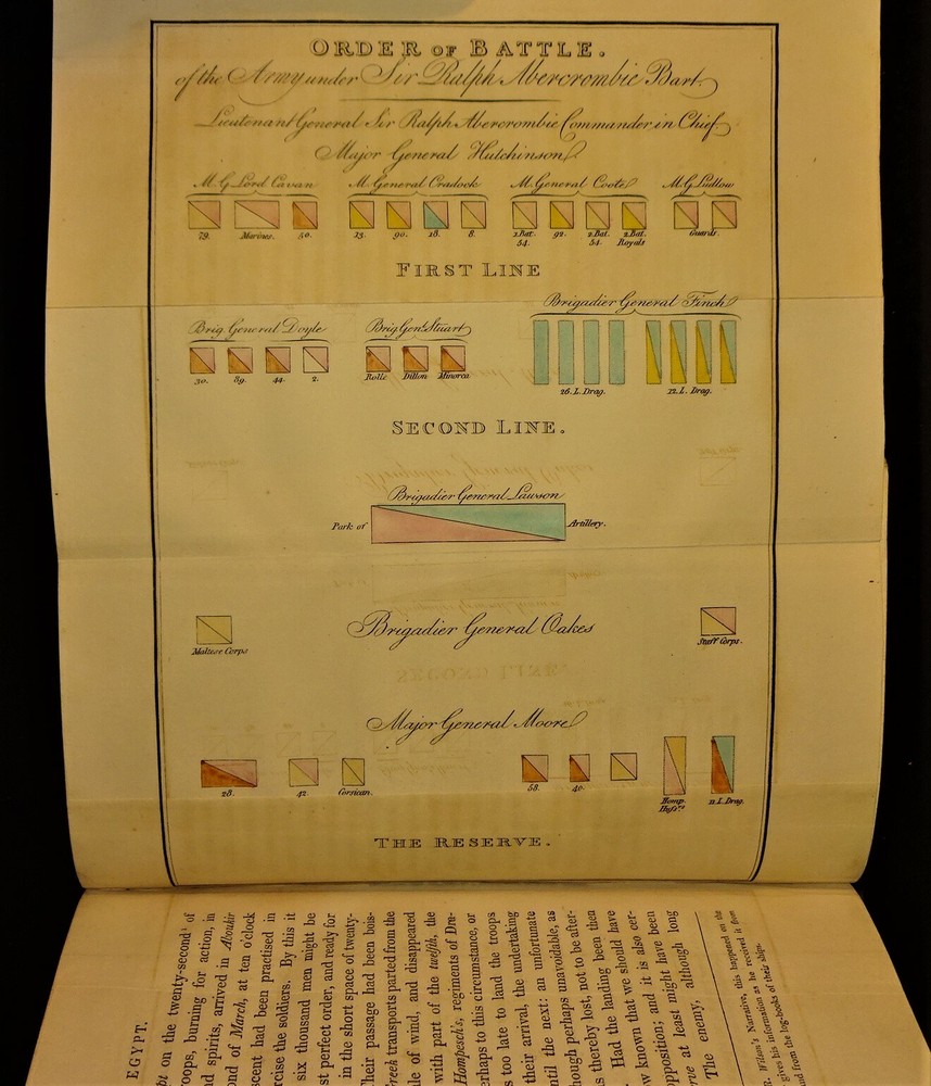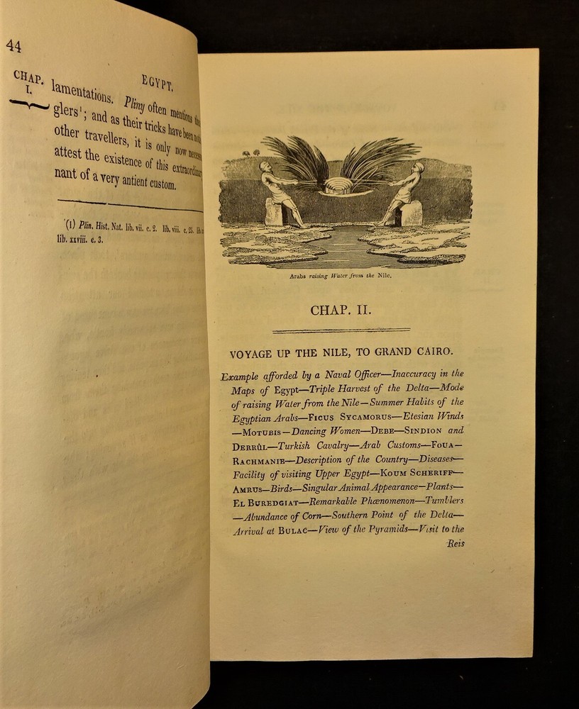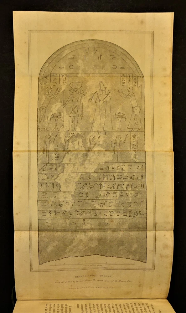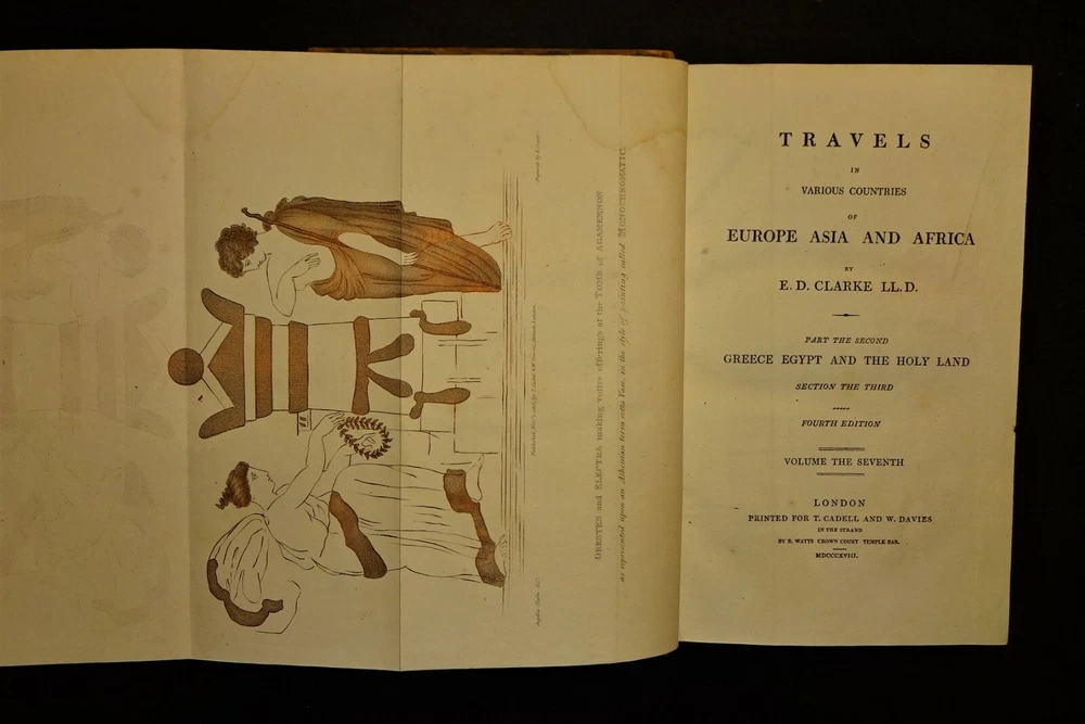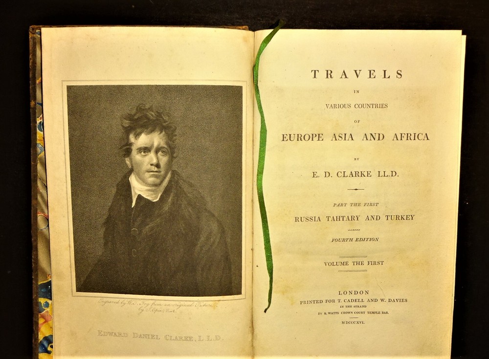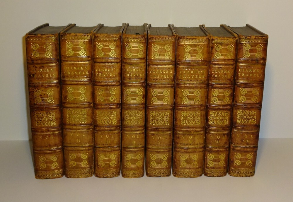 This is a terrific condition set of "Travels in Various Countries of Europe, Asia and Africa" by Edward D. Clarke. The volumes are dated 1816, 1817 and 1818 and were printed for T. Cadell and W. Davies in London; 4th edition (stated). Handsomely bound in leather with a gilt border around the covers, gilt lettering and decorations on the spine, marbled page edges on all sides, 5 raised bands on the spine, marbled end papers and ribbon page markers. The set features many fold-out maps, diagrams and engravings (all are present and firmly attached; a couple are in color) as well as numerous in-text illustrations ("embellishments and vignettes") and maps. The set chronicles Clarke's travels to Russia, Tahtary, Turkey, Greece, Egypt, and the Holy Land; volume VIII contains a supplement "Respecting the Author's Journey from Constantinople to Vienna Containing His Account of the Gold Mines of Transylvania and Hungary." Clarke was an English clergyman, naturalist, mineralogist and traveler. "His writings are much esteemed as a candid record of experiences in countries at that time imperfectly known. His experiences in Africa and Egypt, for example, before modern developments, including systematic excavation, had changed the appearance of the country, are of great interest. He saw many antiquities, now famous as museum exhibits, in their original homes, and visited the catacombs of Alexandria." The contents of the volumes are as follows: VOLUME I (1816): Russia, Tahtary and Turkey - 1st Part, 1st Section (engraved frontispiece portrait of Clarke; fold-out map of the "General Outline of the Author's Route"; fold-out "Map of the Mouths of the Don"; fold-out "Map of the Situation of Tcherkask"; numerous embellishments and vignettes. VOLUME II (1816): Russia, Tahtary and Turkey - 1st Part, 2nd Section (large frontispiece fold-out "Map of the Antiquities of the Crimea"; fold-out "Chart of the Bay of Aktiar"; numerous embellishments, vignettes and in-text maps. VOLUME III (1817): Greece, Egypt and the Holy Land - 2nd Part, 1st Section (large frontispiece fold-out map of the "General Outline of the Author's Route"; fold-out map of "The Ruins of Cnidus"; color fold-out diagram of the "Order of Battle of the Army under Sir Ralph Abercrombie"; fold-out map of "Lake Mareotis"; fold-out diagram of the "Disposition of Landing the Subdivision of Reserve"; fold-out "Survey of the Country between Aboukir & Alexandria"; fold-out map of the "Rosetta Branch of the Nile"; numerous vignettes and an in-text map. VOLUME IV (1817): Greece, Egypt and the Holy Land - 2nd Part, 1st Section (fold-out frontispiece map of "A New Plan of Jerusalem"; numerous embellishments and vignettes. VOLUME V (1817): Greece, Egypt and the Holy Land - 2nd Part, 2nd Section (large frontispiece fold-out map of "A General Outline of the Author's Route through Greece, Macedonia, Terace, Bulgaria, Walachia, Transylvania, and Hungary"; fold-out engraving of "The Obelisk Heliopolis"; fold-out illustration of a "Hieroglyphic Tablet Discovered at Saccara"; fold-out illustration of "Lares, Beads, Amulets &c. Found at Saccara"; fold-out illustration of "Antiquities Found at Sais"; large fold-out illustration of "An Entire Hieroglyphic Tablet"; fold-out illustration of an "Inverted Position of Hieroglyphics"; fold-out diagram of "A Plan of the Catacombs of Necropolis at Alexandria"; numerous embellishments and vignettes. VOLUME VI (1818): Greece, Egypt and the Holy Land - 2nd Part, 3rd Section (fold-out illustration of "Terra-Cottas Found in the Sepulchres of Peloponnesus"; numerous embellishments, vignettes and in-text maps; with a "Catalog of Books of the Patmos Library." VOLUME VII (1818): Greece, Egypt and the Holy Land - 2nd Part, 3rd Section (color fold-out frontispiece of "Orestes and Electra Making Votive Offerings at the Tomb of Agamemnon"; fold-out "Topographical Chart of the Plain of Marathon"; numerous embellishments and vignettes. VOLUME VIII (1818): Greece, Egypt and the Holy Land - 2nd Part, 3rd Section ~ To Which is Added a Supplement Respecting the Author's Journey from Constantinople to Vienna Containing His Account of the Gold Mines of Transylvania and Hungary (large frontispiece fold-out "Chart of the Sea of Marmora"; fold-out "Topographical Chart of the City of Constantinople"; large fold-out map of the "General Outline of the Author's Route"