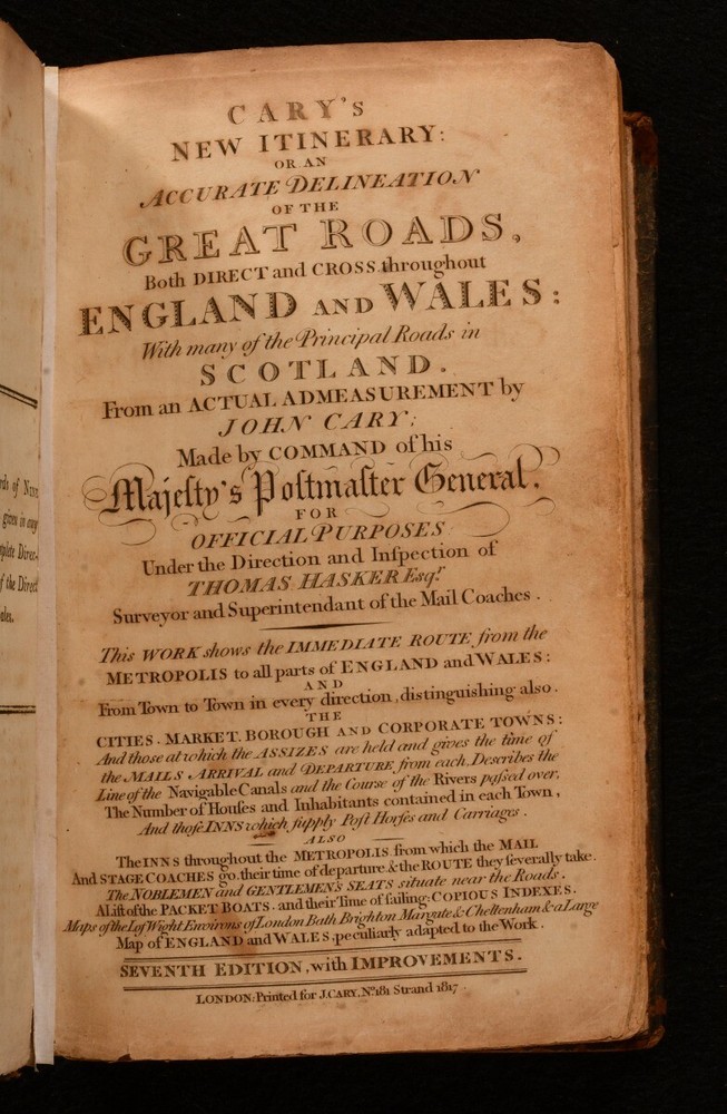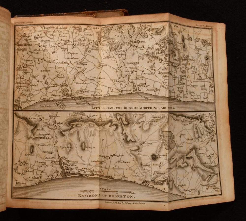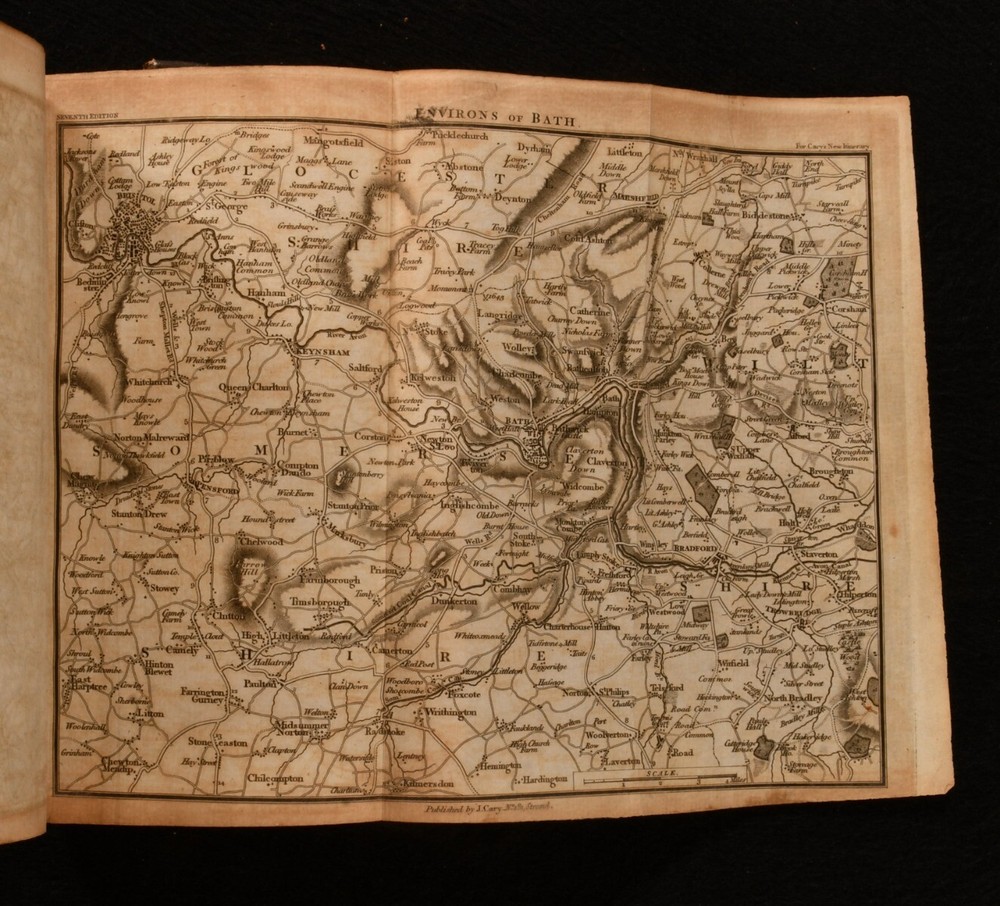 Click here to see our other books! Cary's New Itinerary or an Accurate Delineation of The Great Roads John Cary 1817 J. Cary : London 7.5" by 5" [54], 123 [columns], [70], 6 maps, 874 [columns] 875-951 [4]pp. SUMMARY An early edition of this comprehensive work regarding the road network of the UK, with six folding maps. Folding Maps,Leather Binding Overall Condition: Fair This book weighs 1 KG when packed UK Postage: £ 3.99 US Postage: £ 22.99 EU Postage : £ 16.99 European Postage: £ 17.99 Asia Postage: £ 22.99 Worldwide Postage: £ 28.99 DESCRIPTION The seventh edition, with improvements. Collated with six folding maps. Lacking the large folding map of England and Wales. With six pages of advertisements to the front of the work, including an additional advertisement leaf for Cary's own globes to the recto of the contents page. Four further pages of advertisements to the rear of the work. Cary's New Itinerary provides a detailed itinerary of the major roads throughout England and Wales, including maps, the distances between towns and a detailed description of the various areas. The work was extremely popular due to its thoroughness and went through many editions. CONDITION In contemporary calf. Externally worn. Front joint weak with cords visible. Rear board detached but present. A trifle rubbed. Loss to spine labels. Amateur reinforcement to front hinge. Internally firmly bound. Pages generally bright and clean with age toning and scattered spotting. Overall Condition: Fair GLOSSARY OF TERMS Overall Condition (Dustwrapper condition rating is shown after that for the book itself, where a dustwrapper is present) Fine - Very well preserved copy showing very little wear Very Good Indeed - Only one or two minor faults, really a very attractive copy Very Good - Quite a wide term meaning no major faults but probably several smaller ones often expected given the age of the book, but still a respectable copy Good - Meaning not very good. Some more serious faults as will be described in the condition report under 'condition' Good Only - Meaning one or more faults that could really do with repair Fair - As with good only above but with other faults leaving a compromised copy even after repair Poor - Really bad and possibly seriously incomplete. We only sell books in this condition where their rarity or value makes them attractive none the less. Major defects will be described. GUARANTEE We offer a full money back guarantee on our descriptions. Please ask for details and conditions. We prefer PAYPAL. If you pay via PAYPAL we will post the item off the same or the next working day with the postage you have selected. Please note we cannot accept USD cheques
