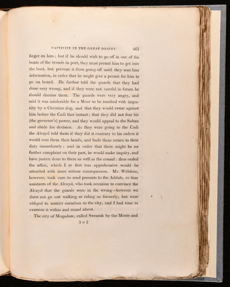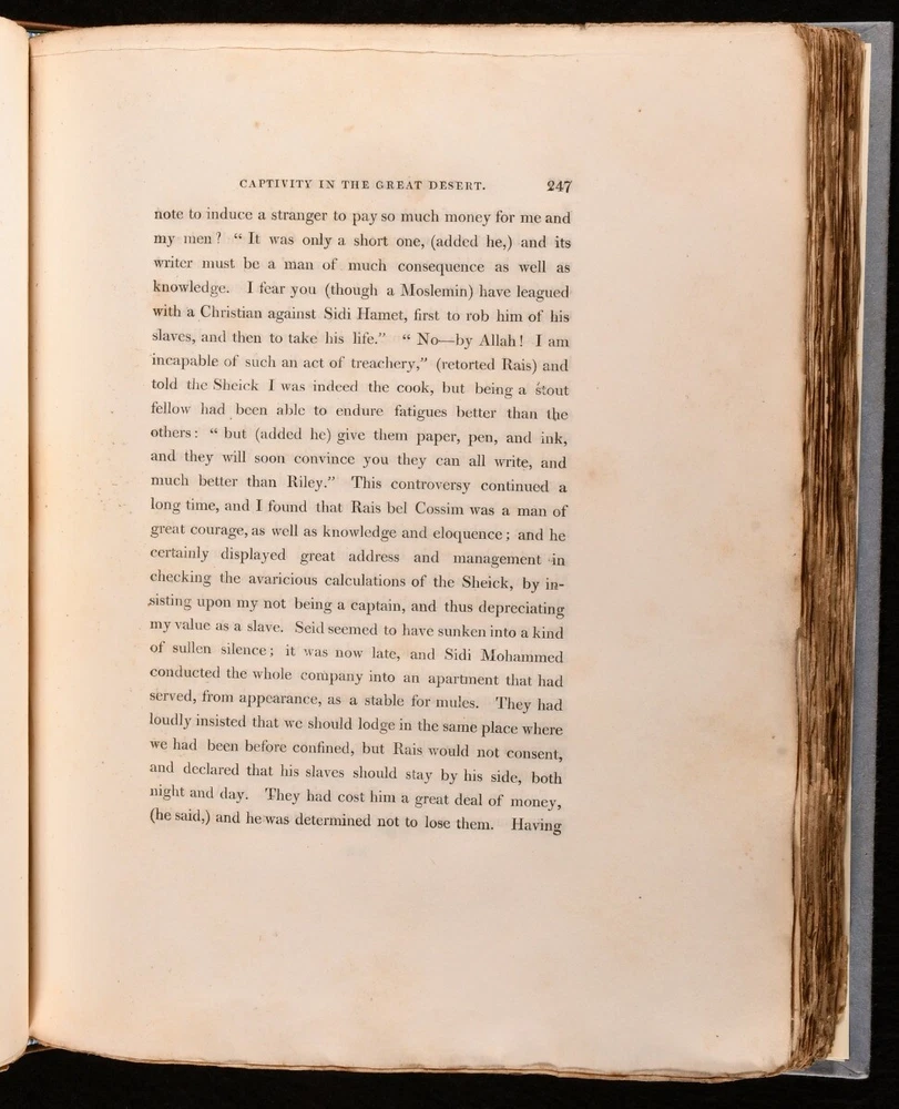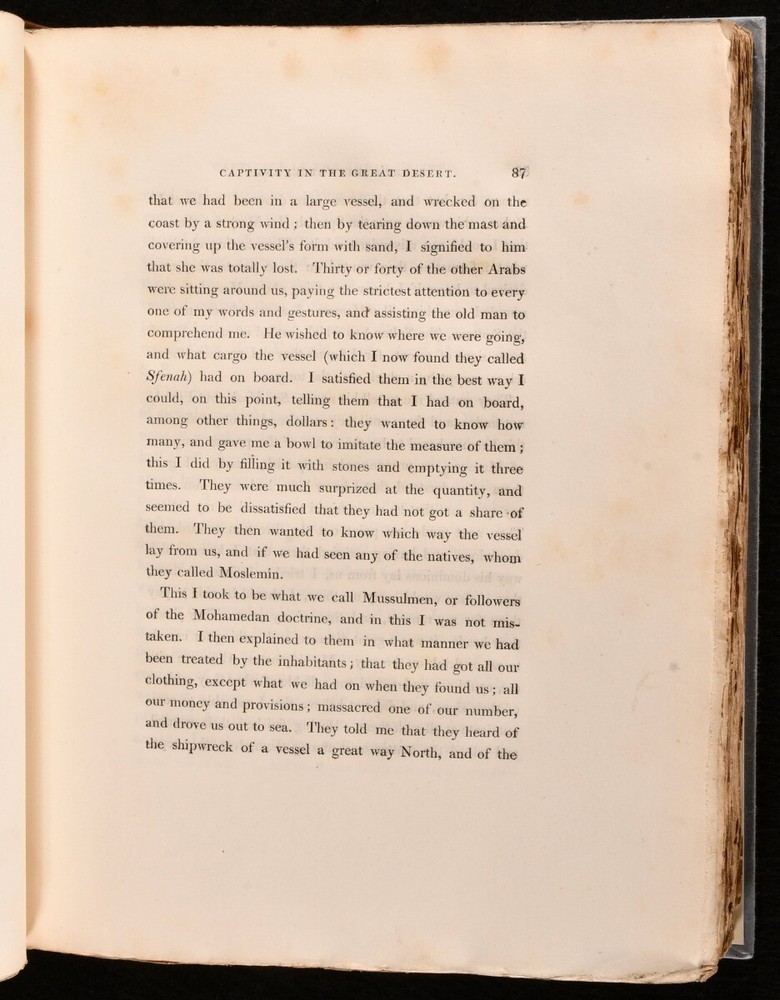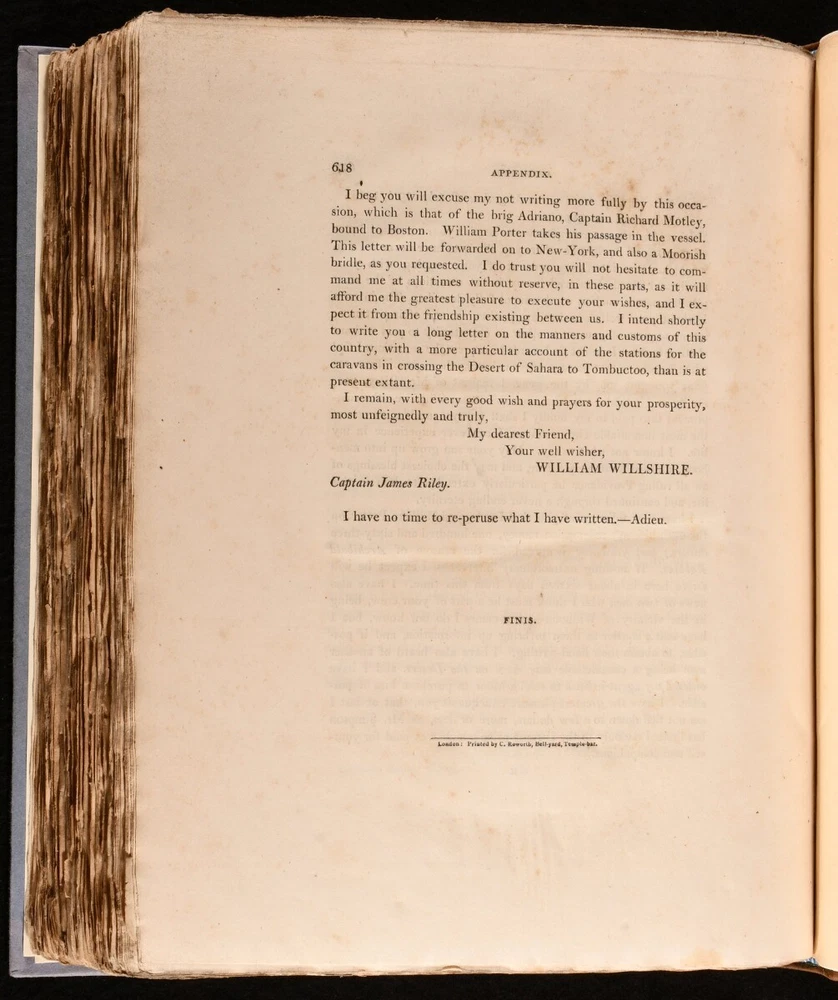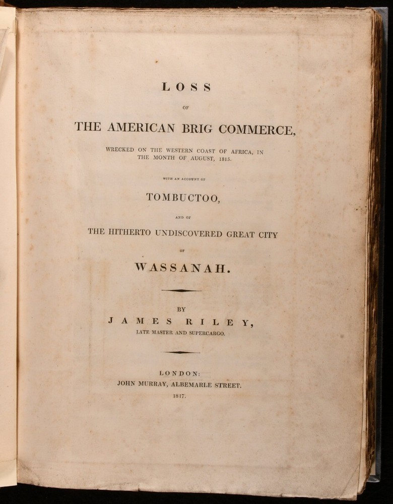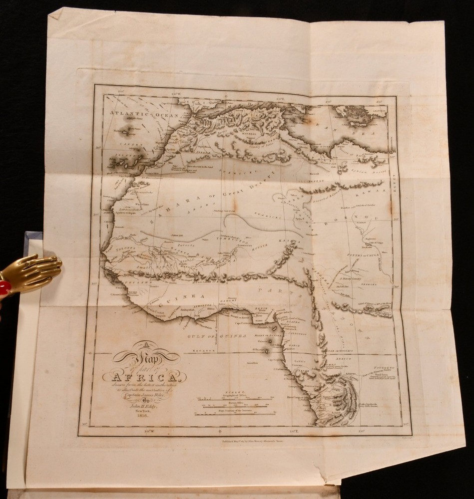 Click here to see our other books! Loss of the American Brig Commerce, Wrecked on the Western Coast of Africa, in the month of August, 1815. With an Account of Tombuctoo, and of the Hitherto Undiscovered Great City of Wassanah. James Riley 1817 John Murray : London 12" by 9.5" xvi [1], 2-618pp SUMMARY The first UK edition of Captain James Riley's shocking account of the wrecking of his ship and subsequent enslavement of him and his crew by marauding Sahrawi natives. First Edition,Folding Maps,Leather Binding,Rebound,Uncommon Overall Condition: Very Good Indeed This book weighs 2 KG when packed UK Postage: £ 3.99 US Postage: £ 29.99 EU Postage : £ 21.99 European Postage: £ 23.99 Asia Postage: £ 37.99 Worldwide Postage: £ 38.99 DESCRIPTION The uncommon first UK edition of American merchant ship Captain James Riley's account of the 1815 wreckage of the Commerce. Illustrated with a large folding map frontispiece. First published earlier in the same year in America, under the title 'An Authentic Narrative of the Loss of the American Brig Commerce'. Riley's shocking account of the events following the running aground of the merchant ship off the coast of Morocco in August 1815, and the capture and enslavement of Riley and the remaining crew members by local tribes. Rilely's account is one of extreme dehydration, severe starvation, and brutality as they roamed the Sahara desert with their captors. A smart copy of the first UK edition of a work quoted by Abraham Lincoln as one of the six most influential works he read in his youth. CONDITION Rebound in quarter calf, with paper covered boards and endpapers renewed. Externally, exceptionally smart. Title page and folding map lightly age toned, with pages otherwise generally clean and bright, with only the odd spot. Overall Condition: Very Good Indeed GLOSSARY OF TERMS Overall Condition (Dustwrapper condition rating is shown after that for the book itself, where a dustwrapper is present) Fine - Very well preserved copy showing very little wear Very Good Indeed - Only one or two minor faults, really a very attractive copy Very Good - Quite a wide term meaning no major faults but probably several smaller ones often expected given the age of the book, but still a respectable copy Good - Meaning not very good. Some more serious faults as will be described in the condition report under 'condition' Good Only - Meaning one or more faults that could really do with repair Fair - As with good only above but with other faults leaving a compromised copy even after repair Poor - Really bad and possibly seriously incomplete. We only sell books in this condition where their rarity or value makes them attractive none the less. Major defects will be described. GUARANTEE We offer a full money back guarantee on our descriptions. Please ask for details and conditions. We prefer PAYPAL. If you pay via PAYPAL we will post the item off the same or the next working day with the postage you have selected. Please note we cannot accept USD cheques