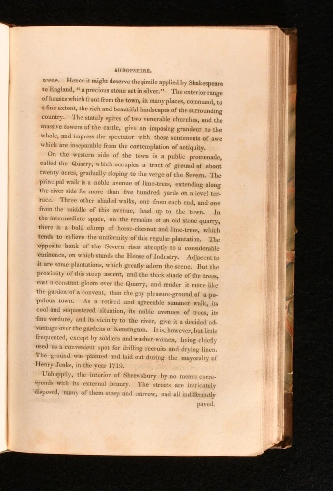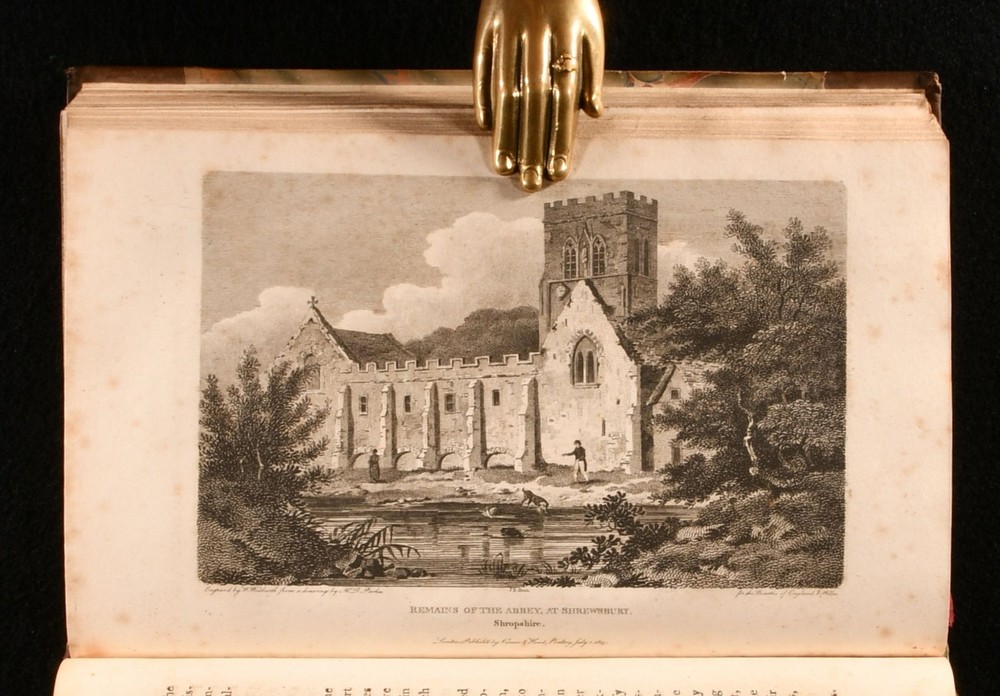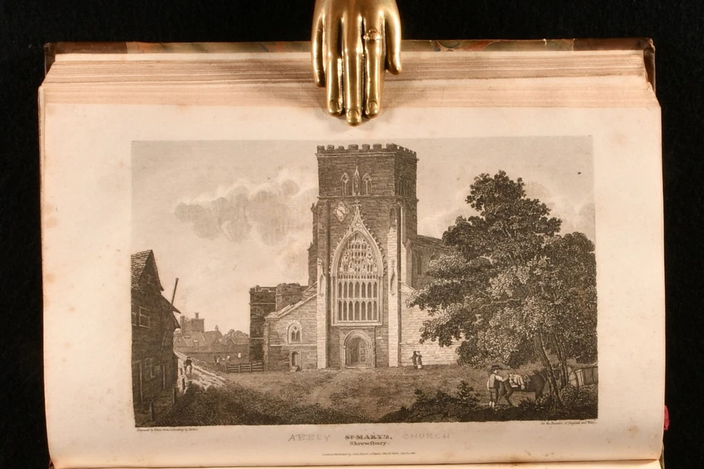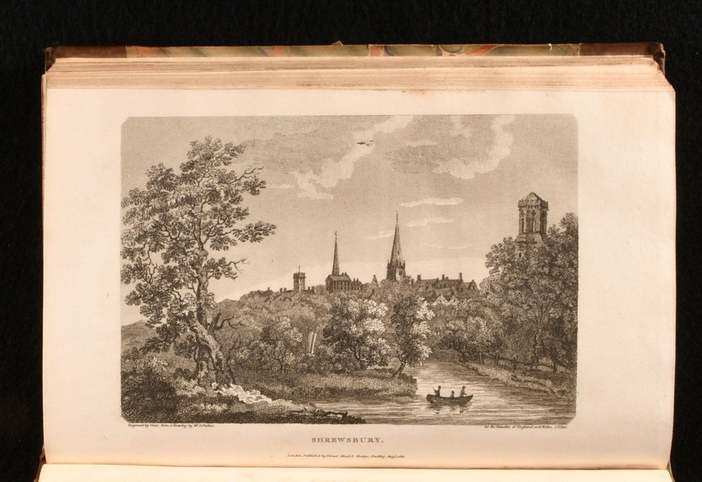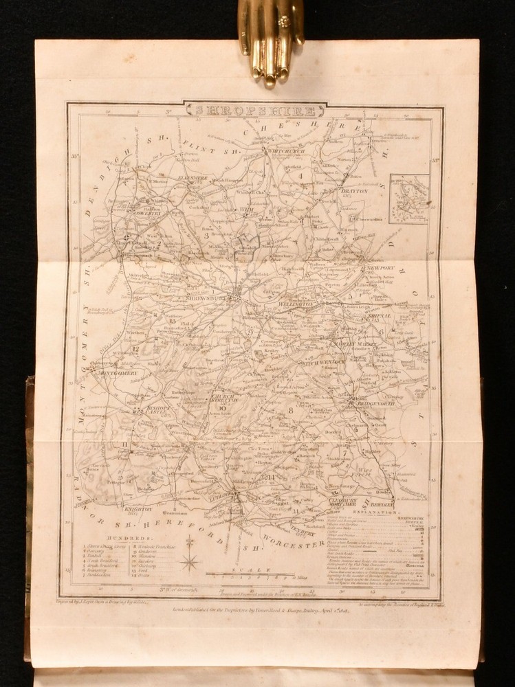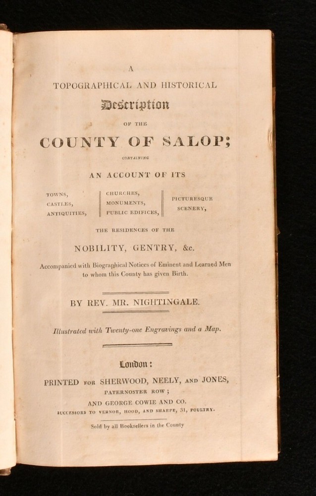 Click here to see our other books! A Topographical and Historical Description of the County of Salop; Containing an Account of its Towns, Castles, Antiquities, Churches, Monuments, Public Edifices, Picturesque Scenery, the Residences of the Nobility, Gentry, &C. Accompanied with Biographical Notices of Eminent and Learned Men to Whom This County Has Given Birth Joseph Nightingale 1818 Sherwood, Neely, and Jones : London 8.5" by 5" [5], 2-338, [19pp] SUMMARY A very scarce topography and history of Shropshire, illustrated throughout, including with a folding map. Folding Maps,Illustrated,Leather Binding,Very Scarce Overall Condition: Very Good This book weighs 0.75 KG when packed UK Postage: £ 3.99 US Postage: £ 19.99 EU Postage : £ 15.99 European Postage: £ 16.99 Asia Postage: £ 21.99 Worldwide Postage: £ 25.99 DESCRIPTION A very scarce work. A detailed and fascinating topographical work and study into the history of the county of Salop, or Shropshire. Illustrated with a folding map to the frontispiece, and twenty-one plates. Collated, complete, with an additional plate bound facing page 83, 'Shrewsbury with the English and Coleham Bridges'. Written by Joseph Nightingale, a topographical writer and preacher. Prior owner's ink inscriptions to the front pastedown and to the recto to the front endpaper. Undated, dated from Jisc from a copy held at the University of Oxford Libraries. CONDITION In a half calf binding with marbled paper to the boards. Externally, smart. Minor rubbing to the boards, spine, and extremities. A few minor spots to the boards. Prior owner's ink inscriptions to the front pastedown and to the recto to the front endpaper. Internally, firmly bound. Pages are lightly age-toned with spotting. Overall Condition: Very Good GLOSSARY OF TERMS Overall Condition (Dustwrapper condition rating is shown after that for the book itself, where a dustwrapper is present) Fine - Very well preserved copy showing very little wear Very Good Indeed - Only one or two minor faults, really a very attractive copy Very Good - Quite a wide term meaning no major faults but probably several smaller ones often expected given the age of the book, but still a respectable copy Good - Meaning not very good. Some more serious faults as will be described in the condition report under 'condition' Good Only - Meaning one or more faults that could really do with repair Fair - As with good only above but with other faults leaving a compromised copy even after repair Poor - Really bad and possibly seriously incomplete. We only sell books in this condition where their rarity or value makes them attractive none the less. Major defects will be described. GUARANTEE We offer a full money back guarantee on our descriptions. Please ask for details and conditions. We prefer PAYPAL. If you pay via PAYPAL we will post the item off the same or the next working day with the postage you have selected. Please note we cannot accept USD cheques